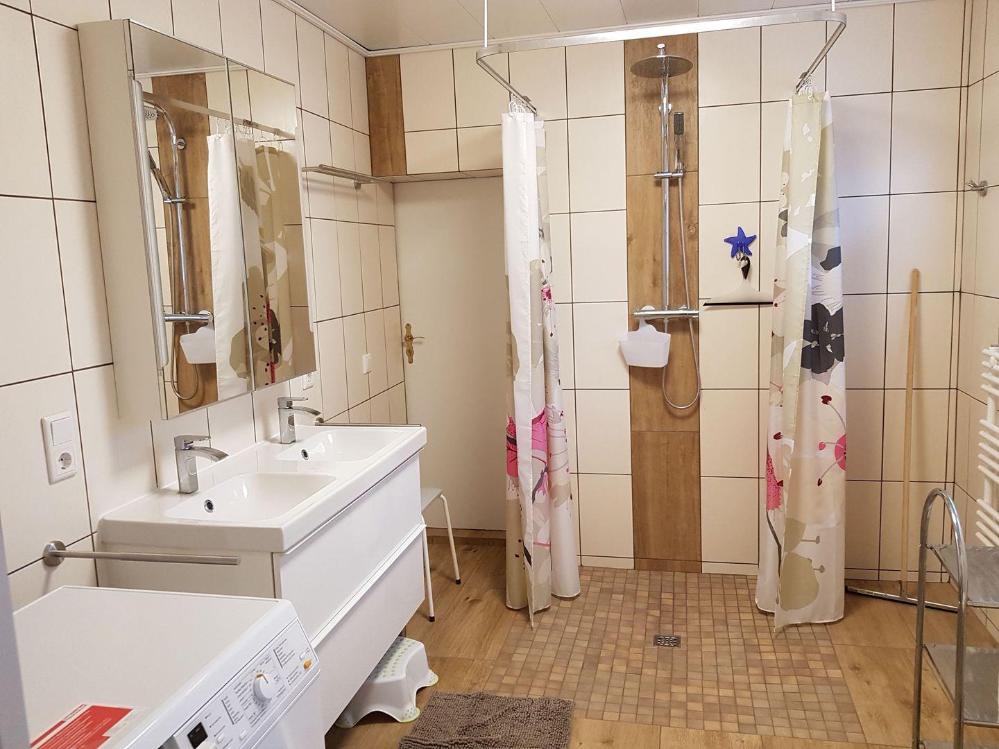 Ruhig und zentral gelegen. Wohn/Essbereich, Bad mit begehbarer Dusche/WC, Waschmaschine, 2 Schlafzimmer mit jeweils Doppelbetten, eine 5. Person könnte auf einem Gästebett/-hocker (ca. 70x190cm) schlafen, breite Türen, Terrasse, 2. TV-Gerät in einem Schlafzimmer. Die Außentür hat eine Breite von 85 cm. Im Ferienhaus haben die Türen eine Breite von 94 cm.