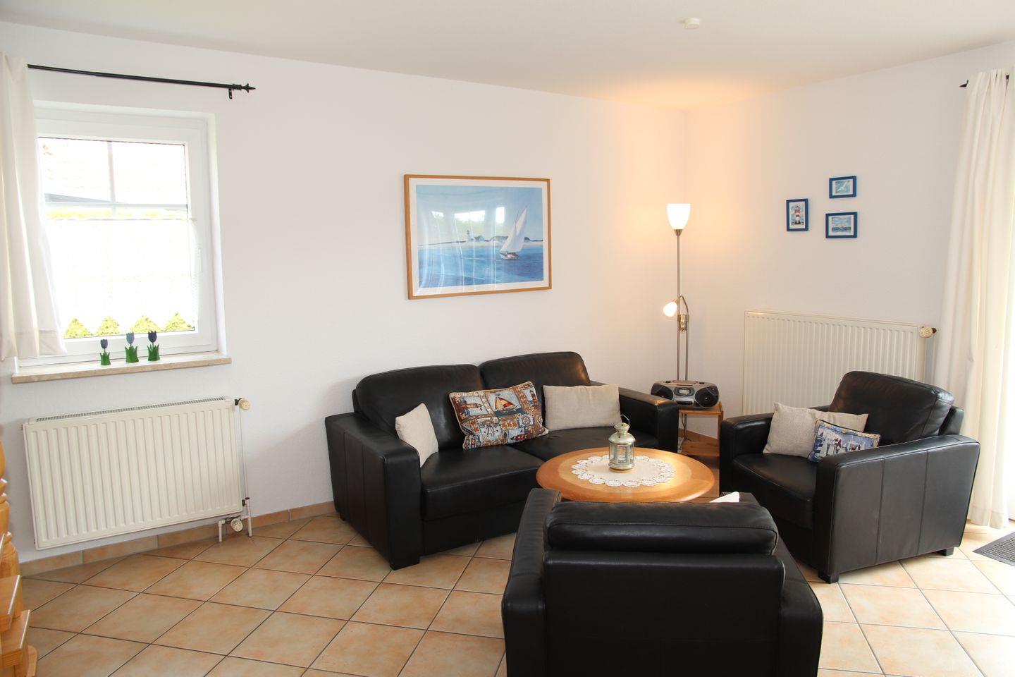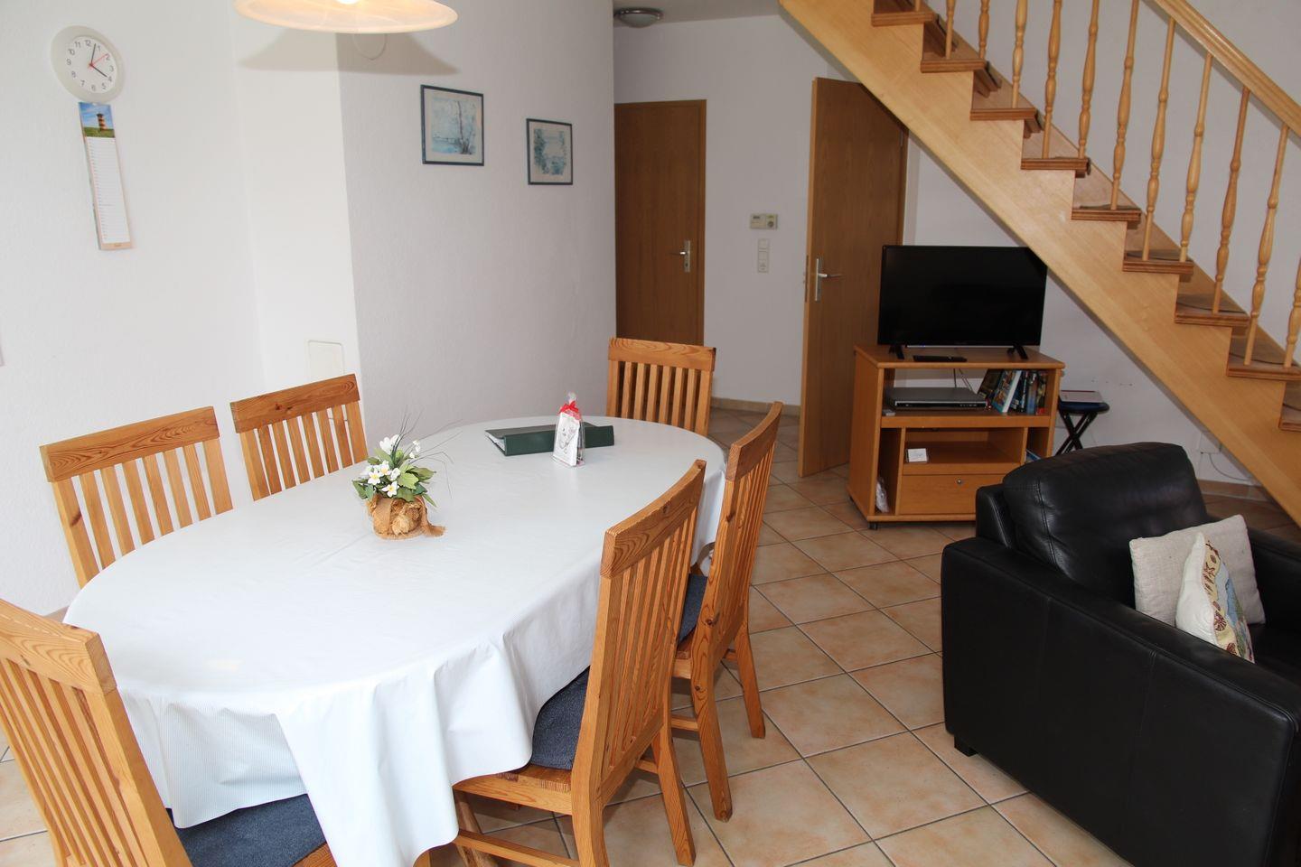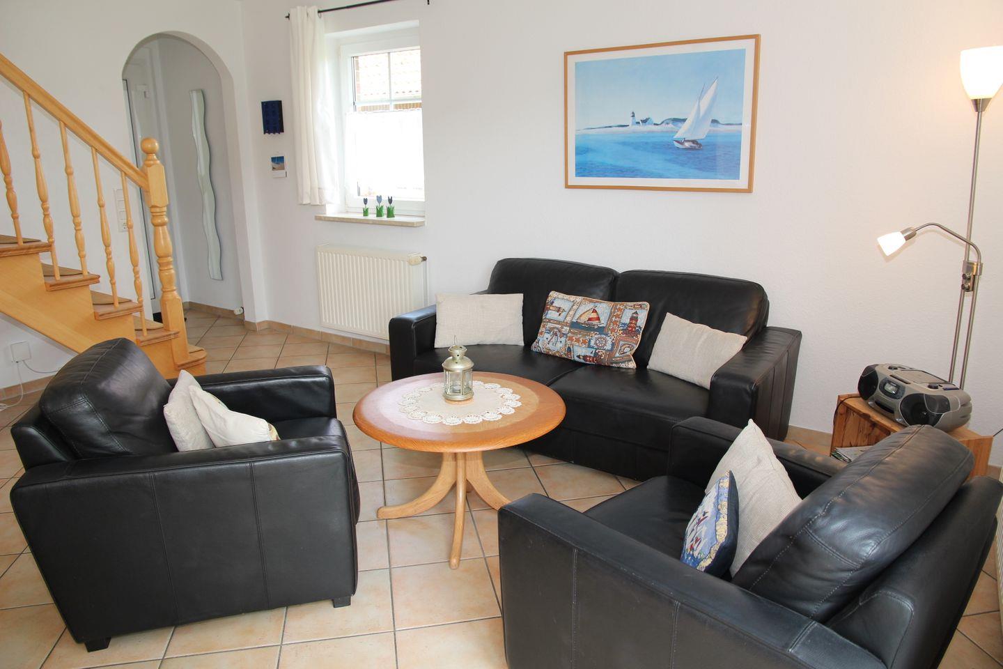 Das komfortable Haus bietet mit seinen 3 Schlafzimmern und 2 Badezimmern auf 2 Etagen genügend Platz für bis zu 6 Personen (+ 1 Kleinkind). Ein Schlafzimmer mit Doppelbett und Kleiderschrank befindet sich im Erdgeschoss. Die zwei weiteren Schlafzimmer (einmal Doppelbett mit Babybett und einmal zwei Einzelbetten) befinden sich im Obergeschoss. Auf jeder Etage finden Sie ein vollwertiges Duschbad. Im Erdgeschoss finden Sie einen großen Wohnbereich mit Sofa, Sesseln und Fernseher. Angrenzend befindet sich der Esstisch mit sechs Stühlen, sowie die sehr gut ausgestattete Küche (Herd/Backofen, Mikrowelle, Spülmaschine, Kühlschrank mit Gefrierfach, Kaffeemaschine, Wasserkocher, Toaster, Handmixer, Geschirr und Besteck (12-teilig)).