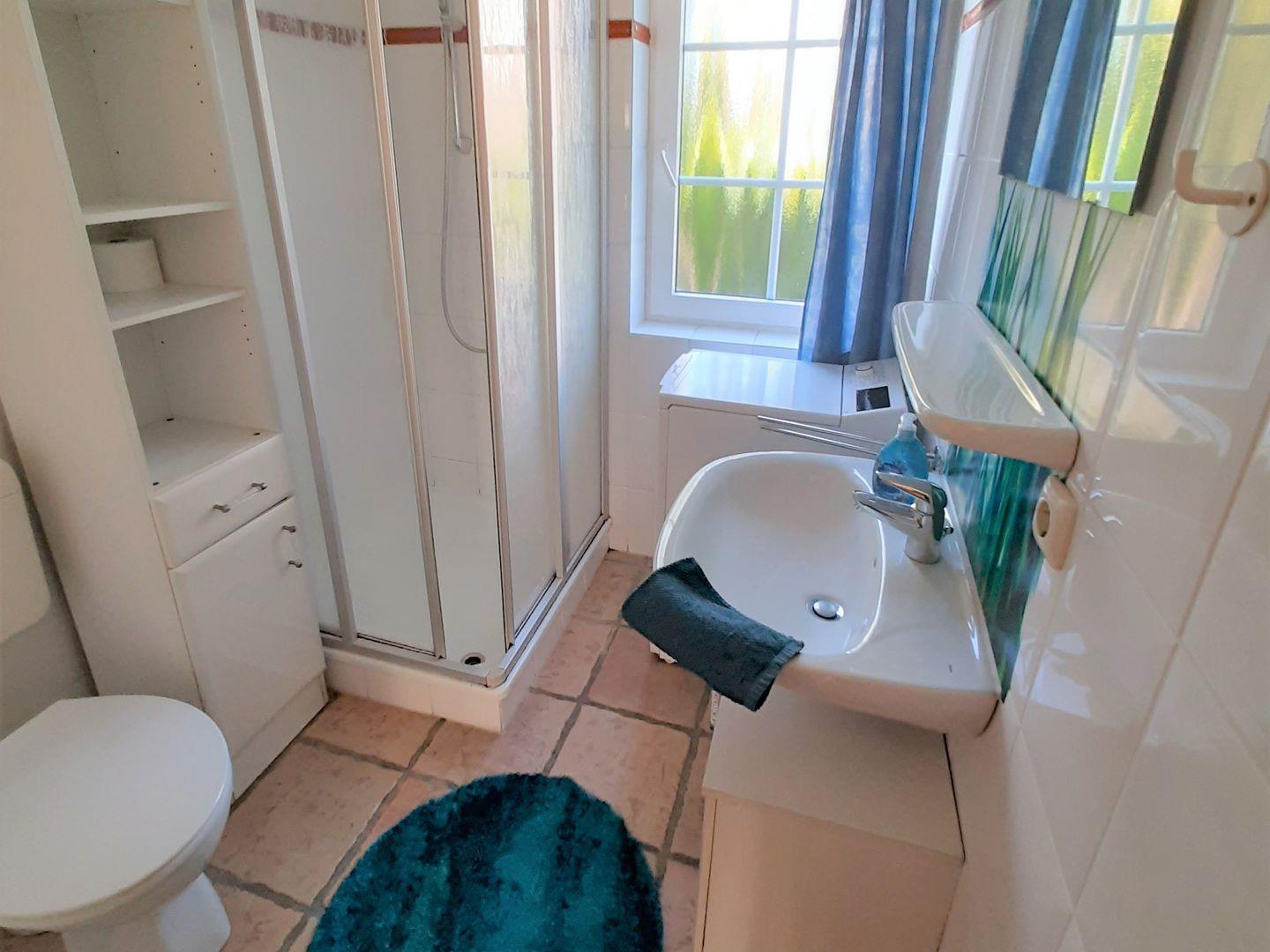Ferner sind im Erdgeschoss noch ein Schlafzimmer mit einem Boxspringbett (160×200) sowie ein helles und freundliches Bad mit Dusche. Hier können Sie den Tag perfekt starten