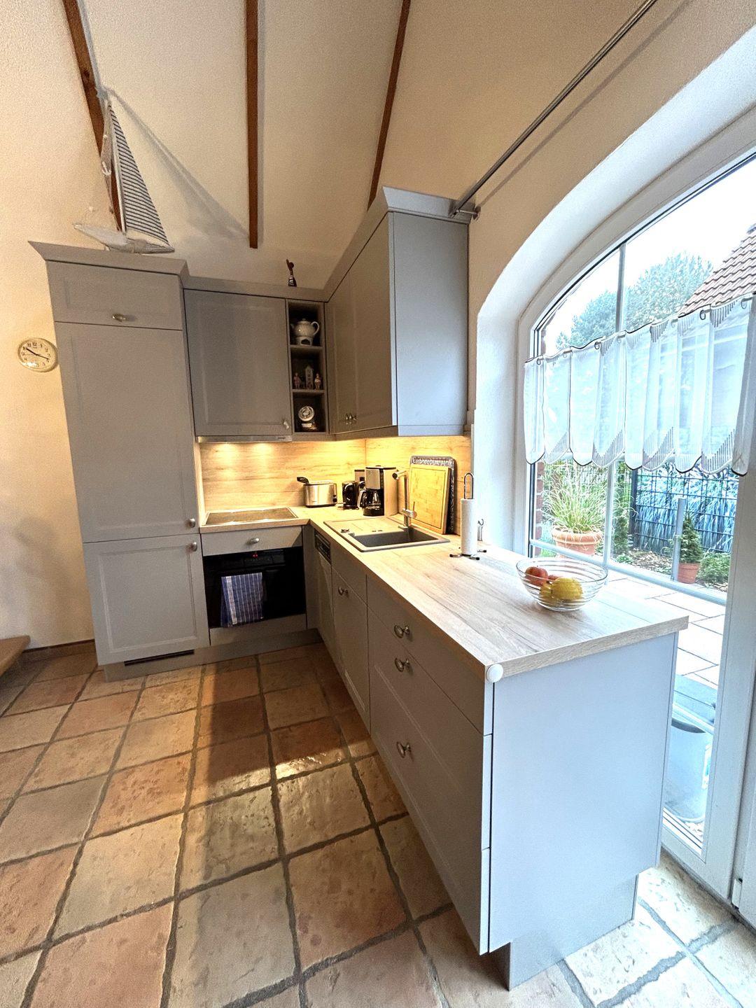Das Friesenhaus verfügt über eine neue NOBILIA-Küche mit einer Kühl-/Gefrierkombination mit 2 Gefrierfächern und einen Mikrowellen-Kompaktbackofen