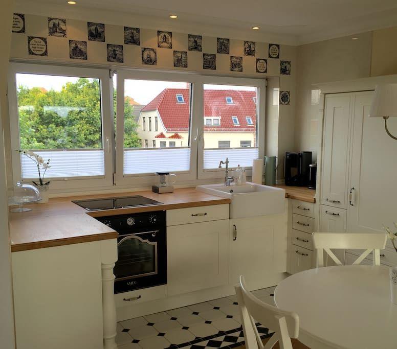 Die Wohnung ist in einem traditionell gestalteten Ambiente gehalten und verfügt über ein einladendes Wohnzimmer mit Parkettboden und einer bequemen Sofaecke, die perfekt für entspannte Abende ist. Die offene Küche ist komplett ausgestattet, sodass Sie Ihre kulinarischen Fähigkeiten voll entfalten können. Mit modernen Geräten wie einem Induktionsherd, einer Spülmaschine und einem Kühlschrank mit Gefrierfach ist das Kochen hier ein Vergnügen. Genießen Sie Ihre Mahlzeiten am Esstisch, der genug Platz für gesellige Abende bietet.