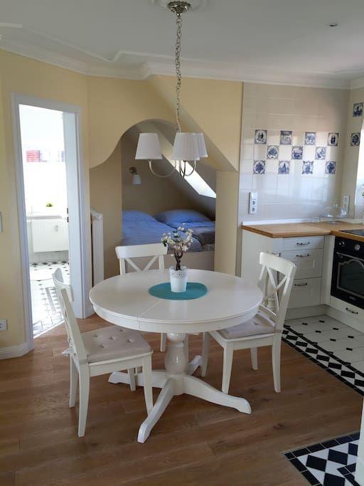 Obwohl der Strand etwa 5 Kilometer entfernt liegt, bietet die Ausstattung der Ferienwohnung alles, was Sie für einen erholsamen Aufenthalt benötigen. Für die Anreise steht Ihnen ein eigener, privater Parkplatz zur Verfügung, und die gute Anbindung an öffentliche Verkehrsmittel macht ein Auto nicht zwingend erforderlich.