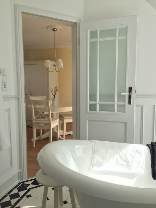 Ein besonderes Highlight dieser Ferienwohnung ist der Balkon mit Gartenblick auf den Fluß und auf zwei historische Mühlen.. Die Unterkunft ist sowohl als Nichtraucher- als auch für Allergiker geeignet.