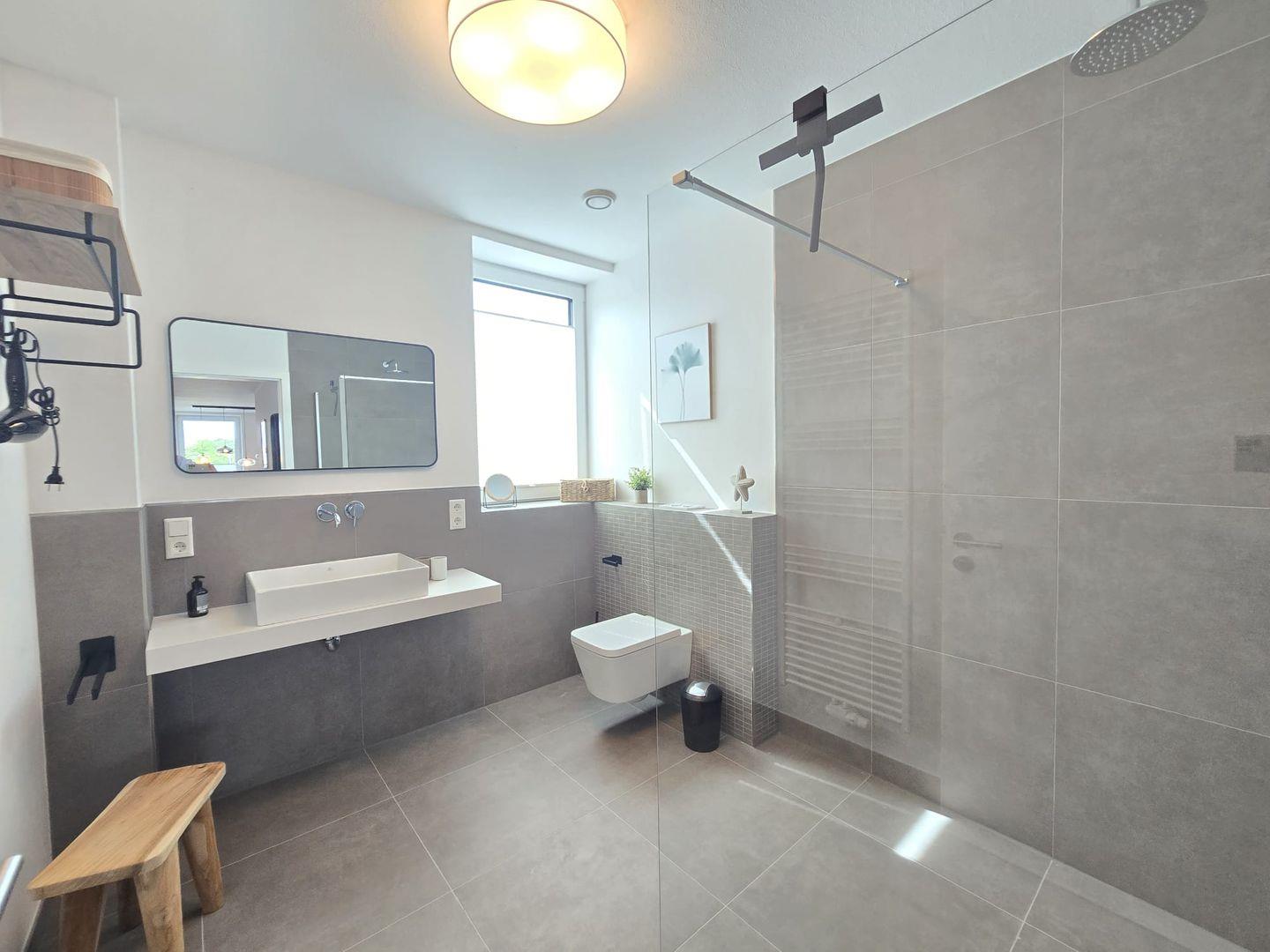 Das Badezimmer ist hell und zeitgemäß gestaltet. Hochwertige Materialien und ein gepflegtes Ambiente sorgen für zusätzlichen Komfort.