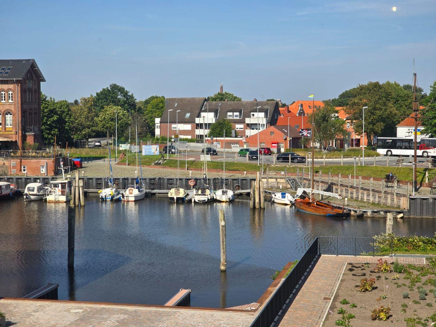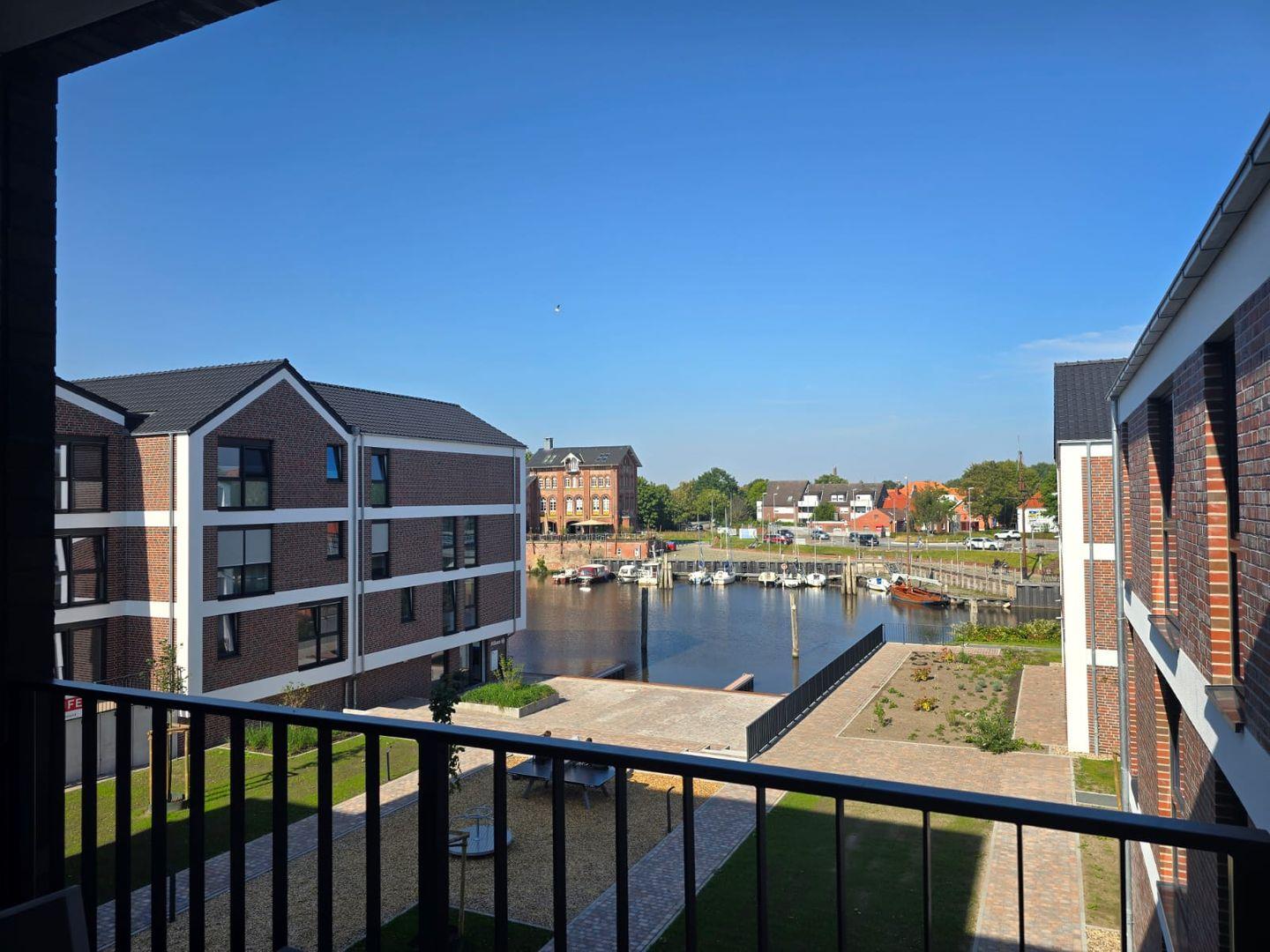 Der großzügige Balkon mit Blick auf die Norder Marina lädt zu entspannten Stunden im Freien ein. Genießen Sie den maritimen Ausblick beim Frühstück, beim Lesen oder am Abend in ruhiger Atmosphäre.