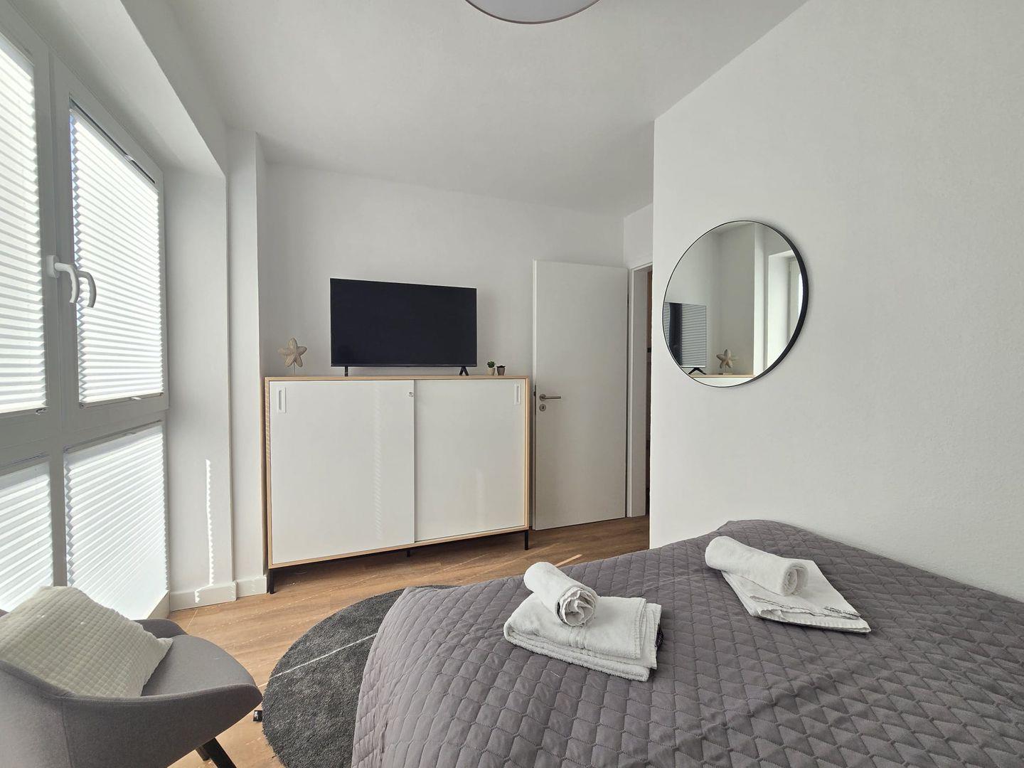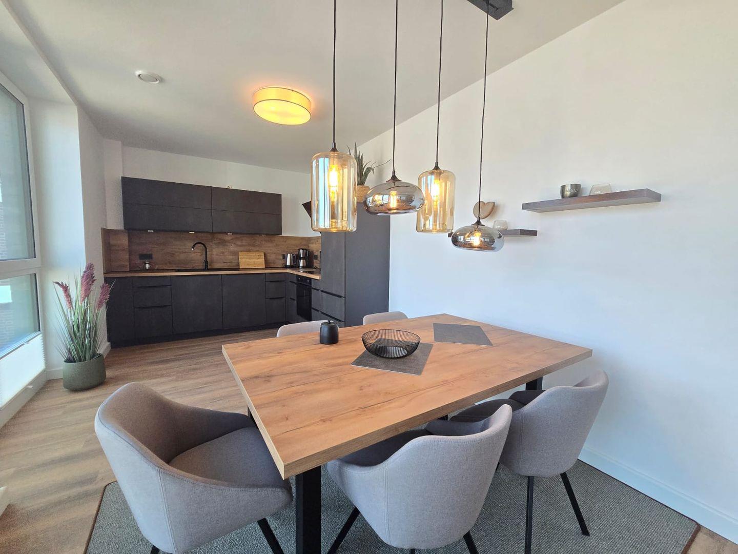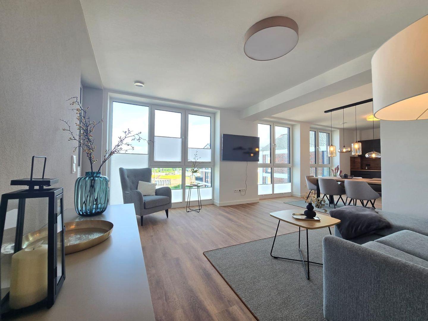 Die Wohnung überzeugt durch ein helles, modernes Raumkonzept. Große Fensterfronten sorgen für viel Tageslicht und schaffen eine freundliche, offene Atmosphäre. Der Wohnbereich ist stilvoll eingerichtet und lädt mit bequemen Sitzmöbeln zum Entspannen ein. Hier finden Sie den idealen Ort, um gemeinsame Abende zu genießen oder nach einem Ausflug zur Ruhe zu kommen.