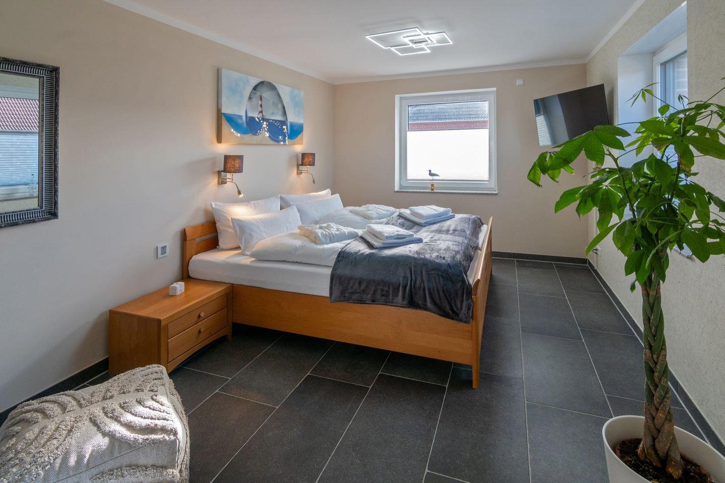 Offener Wohnbereich: Stilvoll eingerichtet mit bequemen Sofas und einem großen Flachbildfernseher. Ideal für entspannte Abende nach einem Tag an der Nordsee.