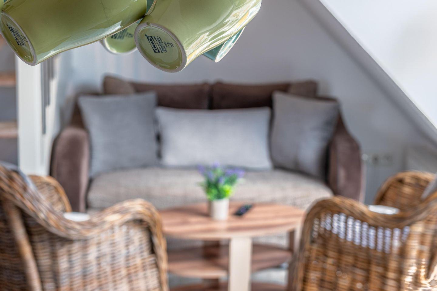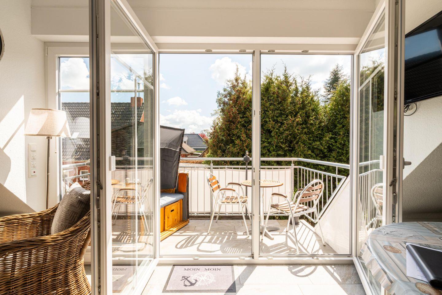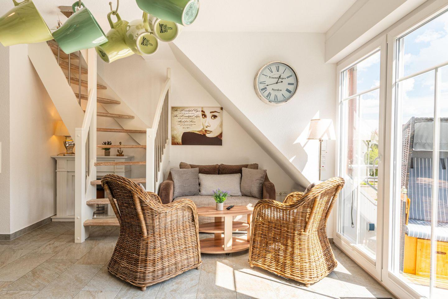 Das offene Wohnzimmer lädt mit einer komfortablen Sofaecke, einem Essbereich und einem TV zu entspannten Abenden ein. Vom angrenzenden Balkon genießt du den Blick in den Garten und kannst die frische Meeresluft bei einem Frühstück oder einem Glas Wein auskosten.