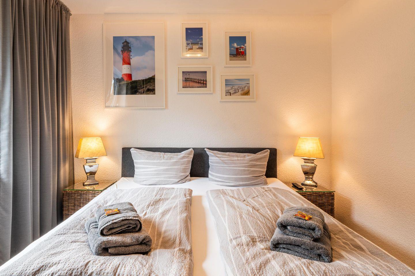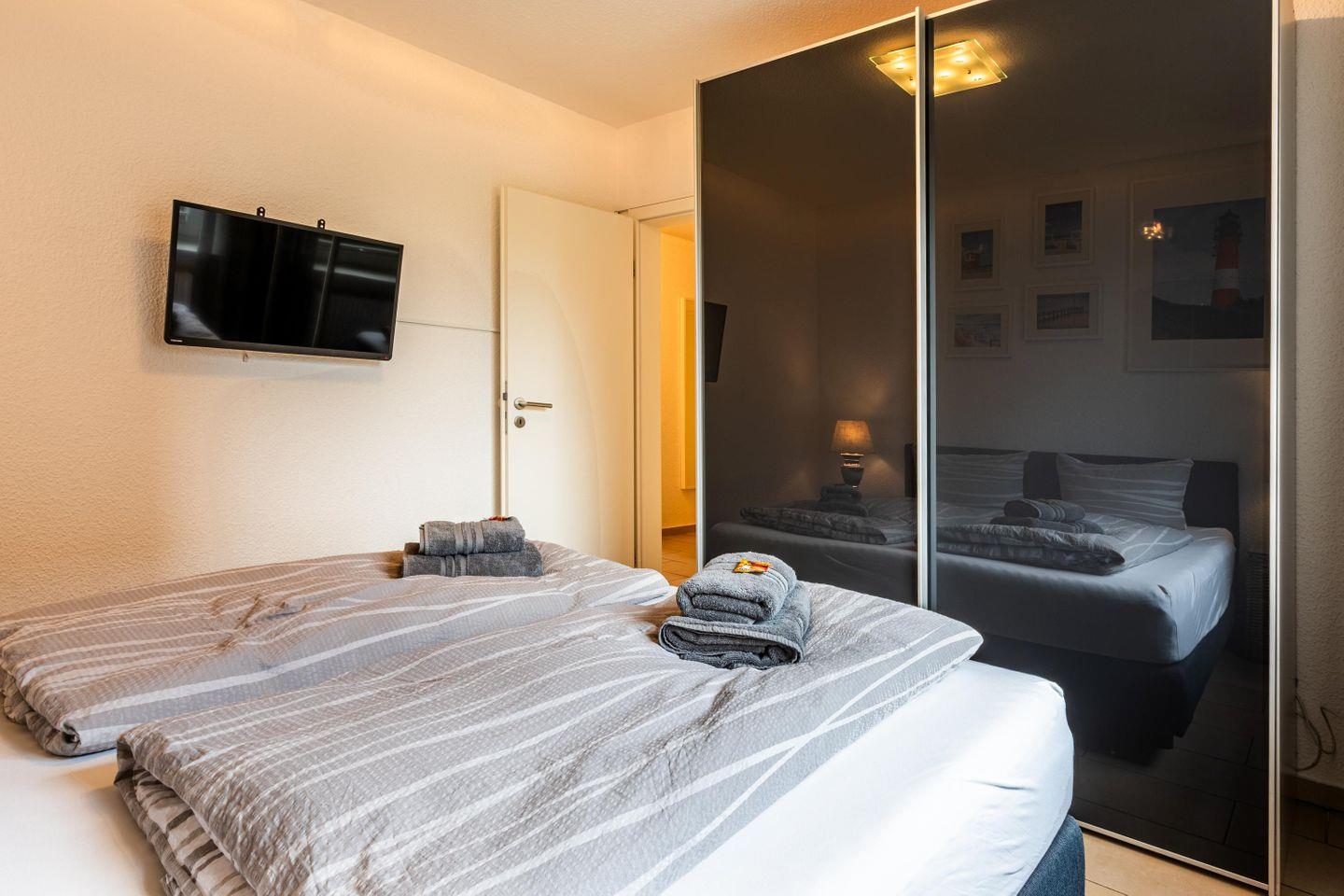 Zwei liebevoll eingerichtete Schlafzimmer sorgen für erholsame Nächte, während das einladende Wohnzimmer mit Sofaecke und TV perfekt für gemütliche Abende ist. Die geschlossene, voll ausgestattete Küche mit Herd, Backofen, Geschirrspüler und Kühlschrank lässt keine Wünsche offen.