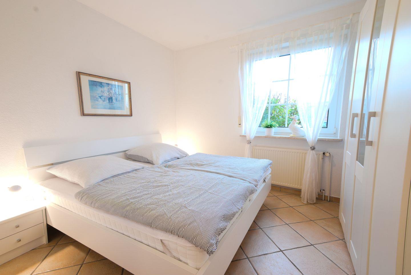Die Wohnung Möwe 3 befindet sich im Erdgeschoss eines ruhig gelegenen Wohnhauses. Die Wohnung ist freundlich hell eingerichtet und verfügt über zwei Schlafzimmer. In einem ein Doppelbett und Kleiderschrank. Im anderen zwei Einzelbetten und Kleiderschrank.