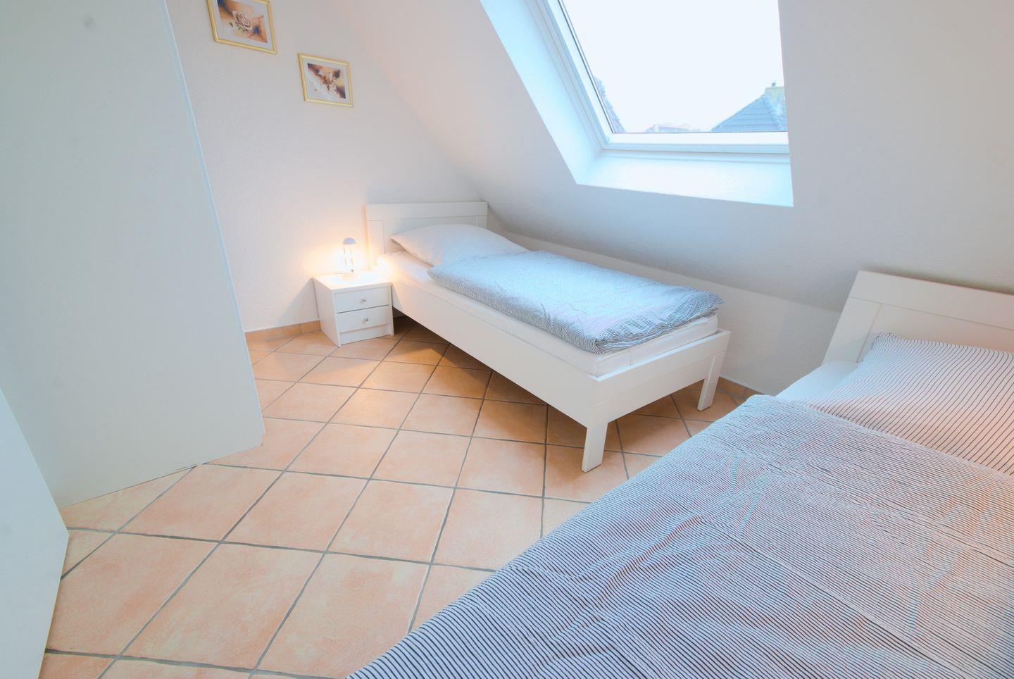 Die Wohnung Möwe 4 befindet sich im Obergeschoss eines ruhig gelegenen Wohnhauses. Die Wohnung ist freundlich hell eingerichtet und verfügt über zwei Schlafzimmer. In einem ein Doppelbett und Kleiderschrank. Im anderen zwei Einzelbetten und Kleiderschrank.