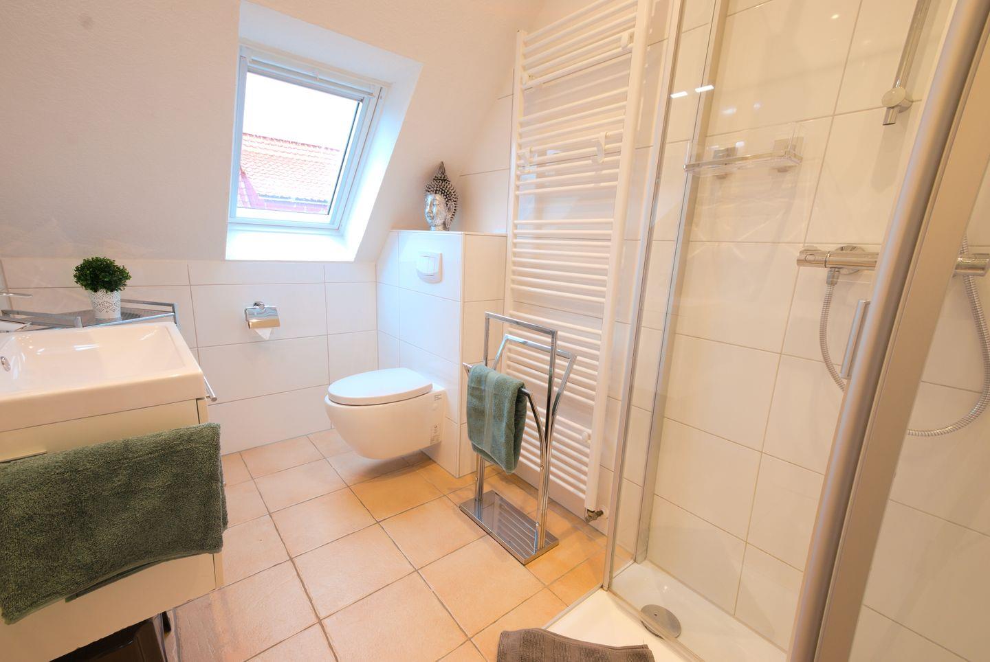 Im Badezimmer ist eine Dusche mit flachem Einstieg. Das große Wohnzimmer ist mit zwei Ledercouches, sowie TV ausgestattet.