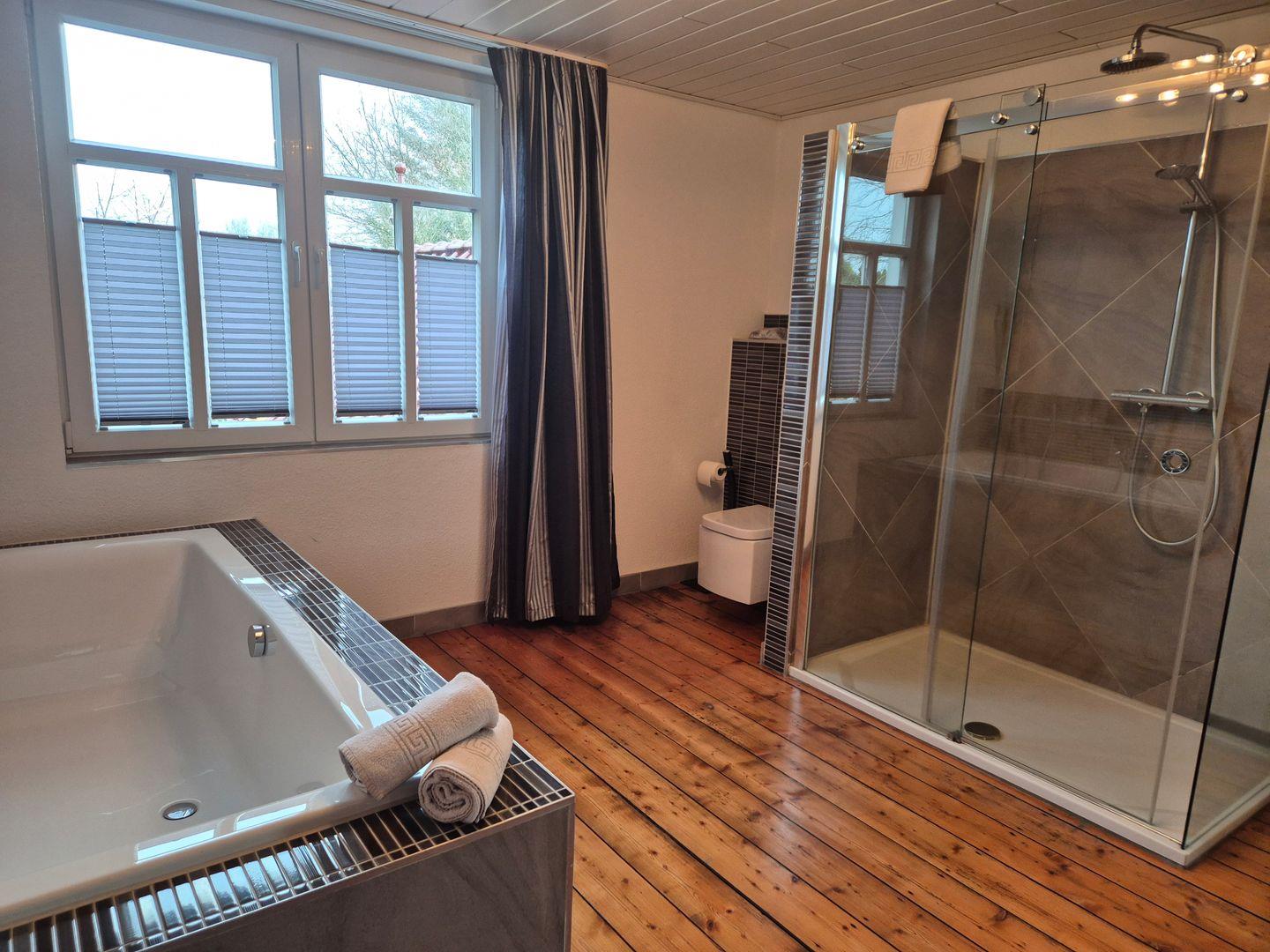 Das Ferienhaus verfügt über zwei Badezimmer, jeweils mit Dusche, Waschbecken, Spiegel und Fenster – eines davon ist zudem mit einer super schönen Badewanne ausgestattet. Ein Kosmetikspiegel und ein Haartrockner sind ebenfalls vorhanden.