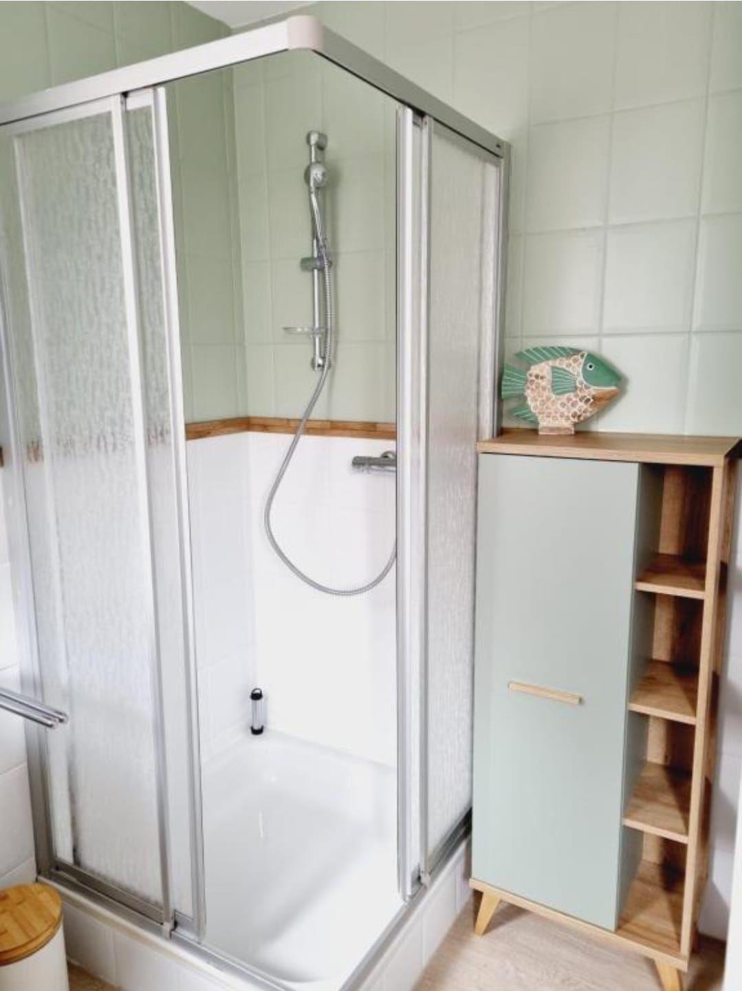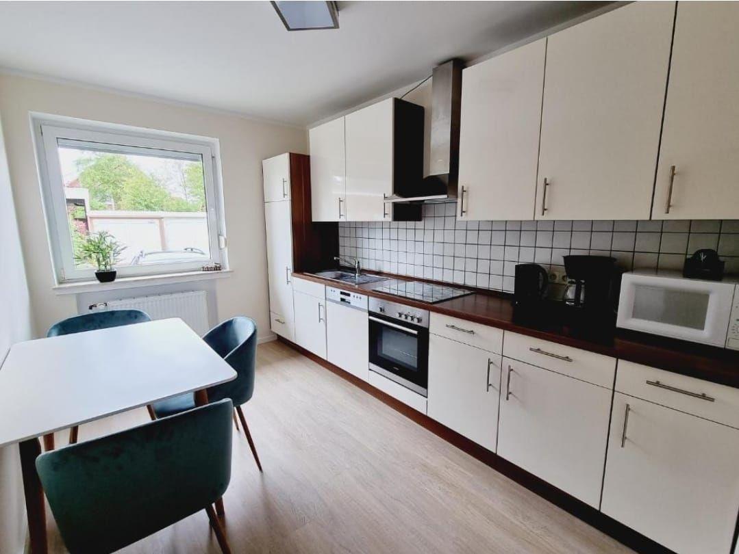In der separaten Küche mit Esstisch ist alles vorhanden, was du für entspanntes Kochen brauchst: Backofen, Spülmaschine, Mikrowelle, Kaffeemaschine, Wasserkocher und Toaster. Frühstück selbst zubereiten, mittags ein Fischbrötchen vom Hafen holen und abends auf der eigenen Terrasse grillen. So kann ein Tag in Norddeich aussehen. Der Garten lädt zum Verweilen ein, und der Grill sorgt für das richtige Urlaubsgefühl unter freiem Himmel.