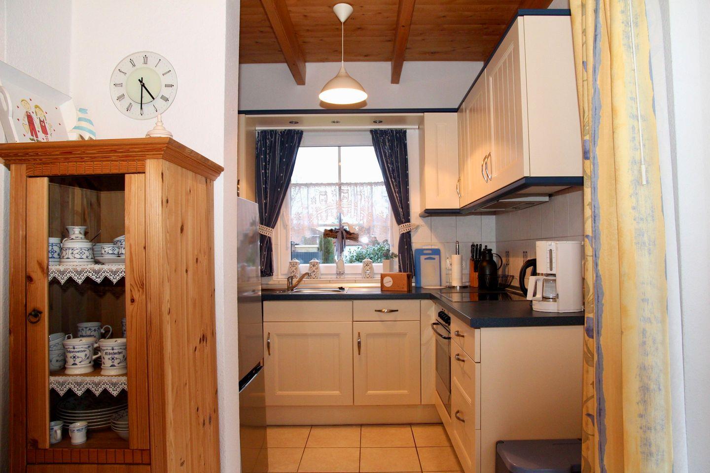 Beim Betreten des Hauses gelangen Sie nach dem Eingangsbereich direkt in den großzügigen Wohn- und Essbereich mit hoher Decke und darüber liegender Galerie mit kleinem Sitzplatz. Sie finden im Erdgeschoss zwei Sofas mit einem Sessel, Kaminofen, TV mit HiFi-Anlage und DVD-Player (zahlreiche DVDs sind vorhanden), Spiele, Bücher, den Essplatz und die direkt angrenzende Küche. In der gut ausgestatteten Küche gibt es u.a. Herd mit Backofen, eine kleine Spülmaschine, Kühlschrank mit Gefrierschrank, Kaffeemaschine, Wasserkocher, Mikrowelle und Eierkocher. Von hier können Sie auch auf die überdachte und möblierte Terrasse mit angrenzendem Garten hinaustreten. Der Garten ist fast vollständig umzäunt, aber nicht komplett ausbruchssicher.