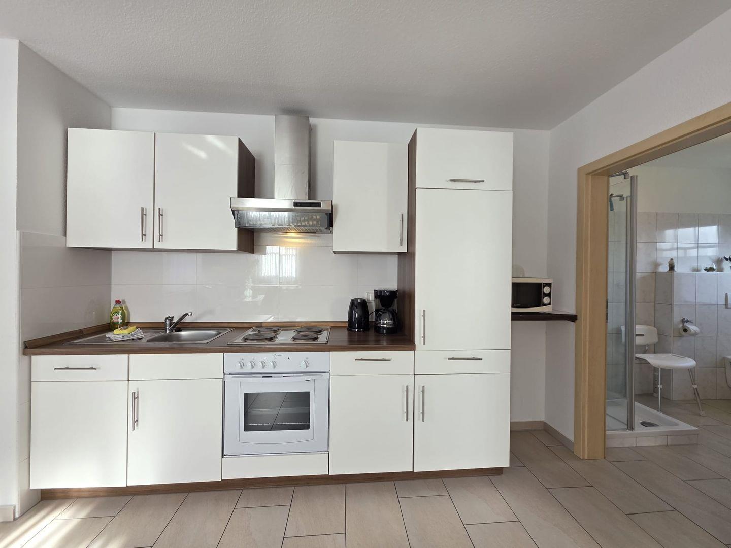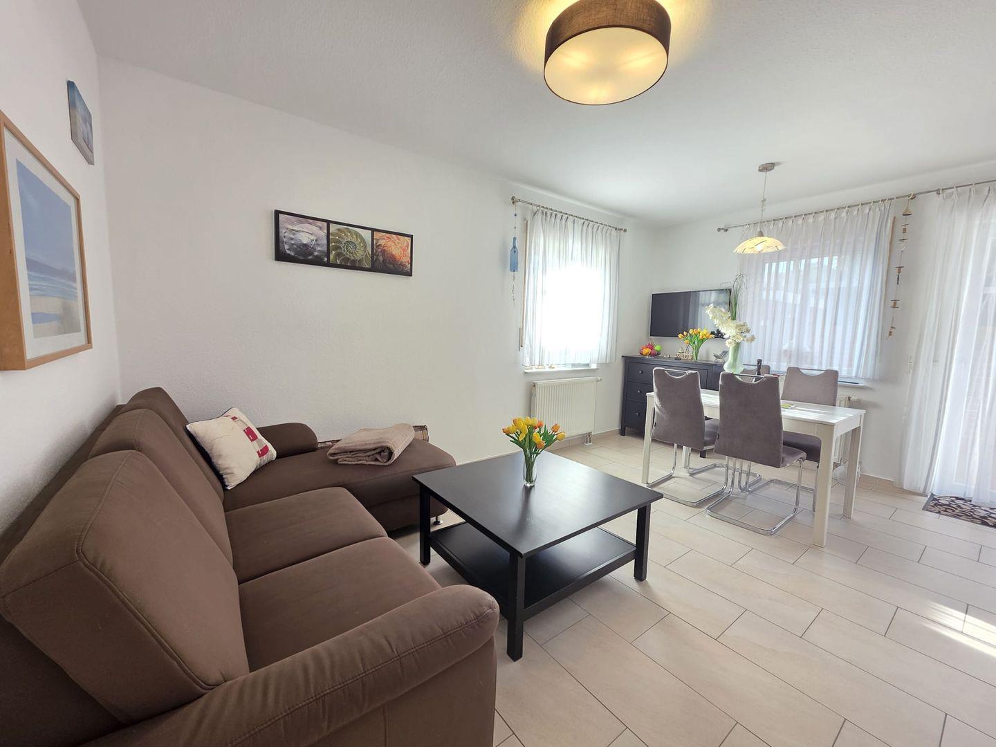 Helles Wohnzimmer mit integrierter Küche – voll ausgestattet mit Spülmaschine, Backofen, Herd, Kühlschrank, Mikrowelle, Kaffeemaschine, Wasserkocher und Toaster – perfekt für Selbstverpfleger.