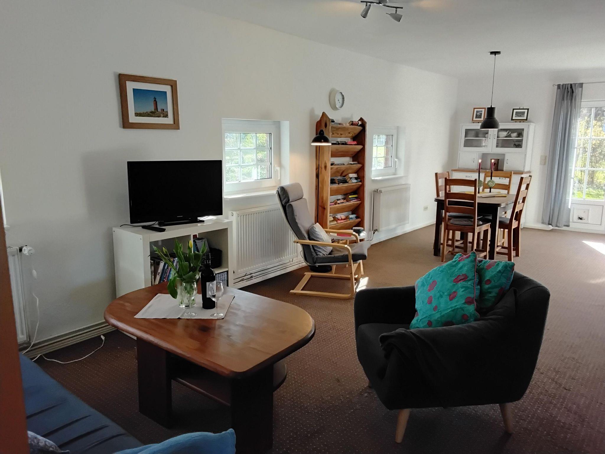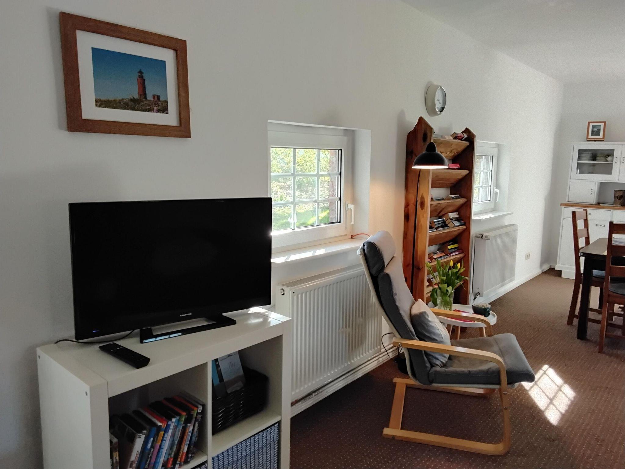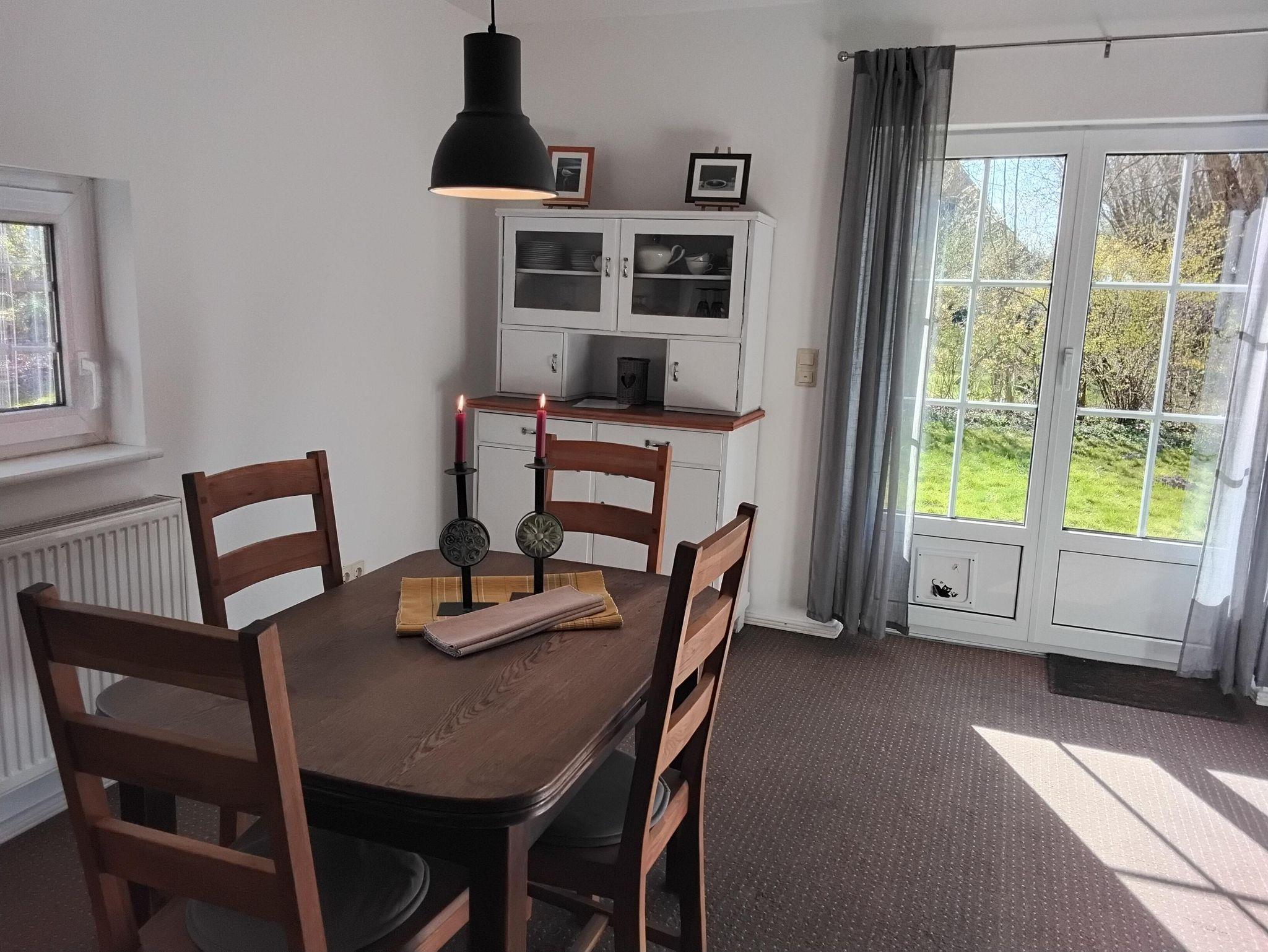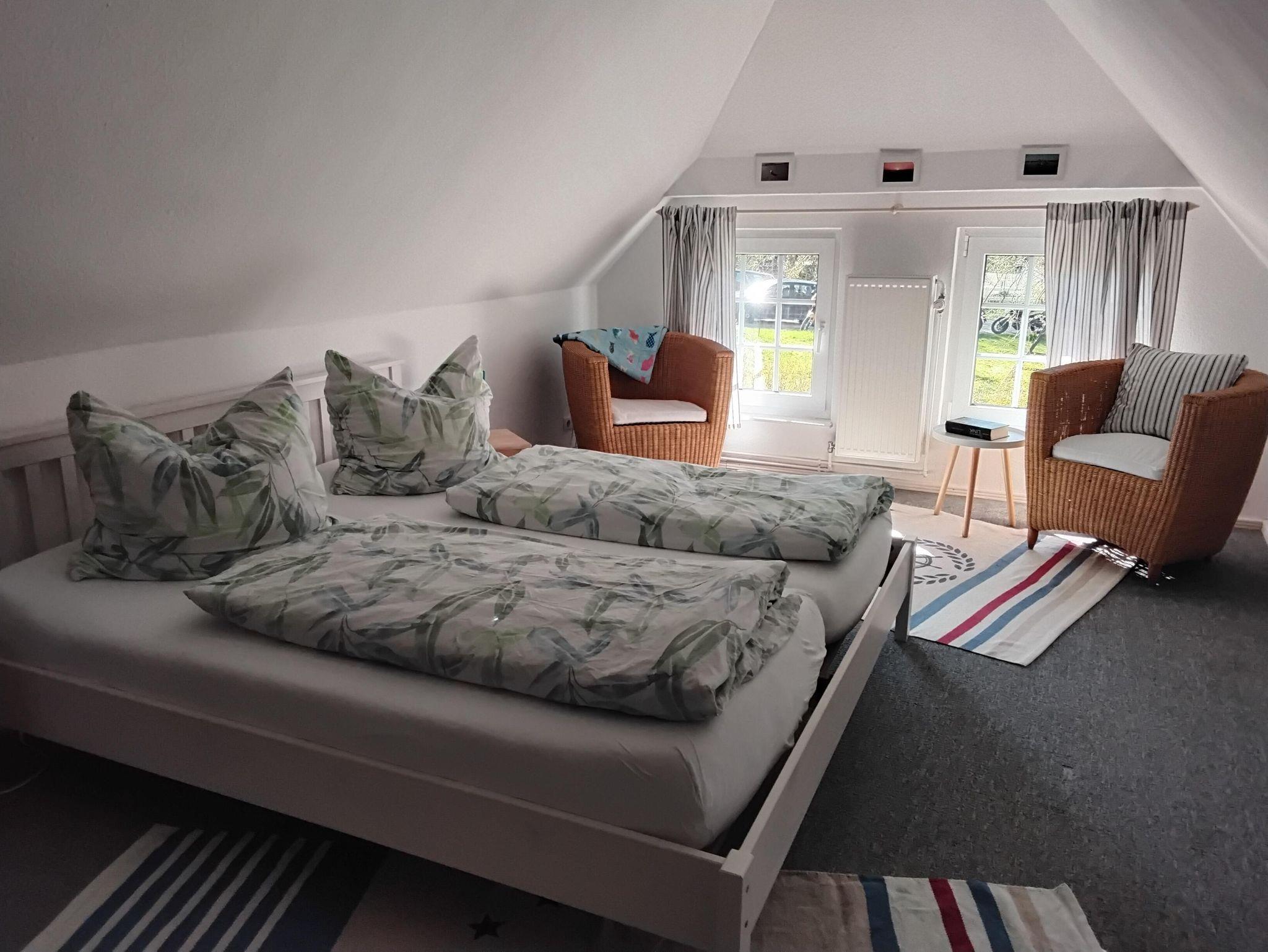 Das Lütte Hus bietet auf einer Fläche von ca. 75 qm Platz für 4 Personen. Im Erdgeschoss befinden sich der Wohn-/Essbereich mit Sofa-Ecke, Essgruppe, SAT-TV,DVD-Player, sowie die in in den Wohnraum integrierte, komplett ausgstattete Küche mit Elektro-Herd, Backofen, Geschirrspüler, Kühl-Gefrierkombination und allem, was man für die Urlaubsküche braucht. Das Badezimmer ist mit einer Dusche und WC ausgestattet und befindet sich ebenfalls im Erdgeschoss. Über eine steile Treppe gelangt man in das Obergeschoß mit den zwei Schlafräumen. Der erste Schlafraum verfügt über ein französisches Bett (1,40 x 2,00 m, mit Fußende) und einer Kommode, der zweite Schlafraum ist mit einem Doppelbett (1,80 x 2,00 m, mit Fußende) einer Kommode und Kleiderschrank eingerichtet. Einen Kinderhochstuhl und ein Kinderbett stellen wir Ihnen kostenlos zur Verfügung.