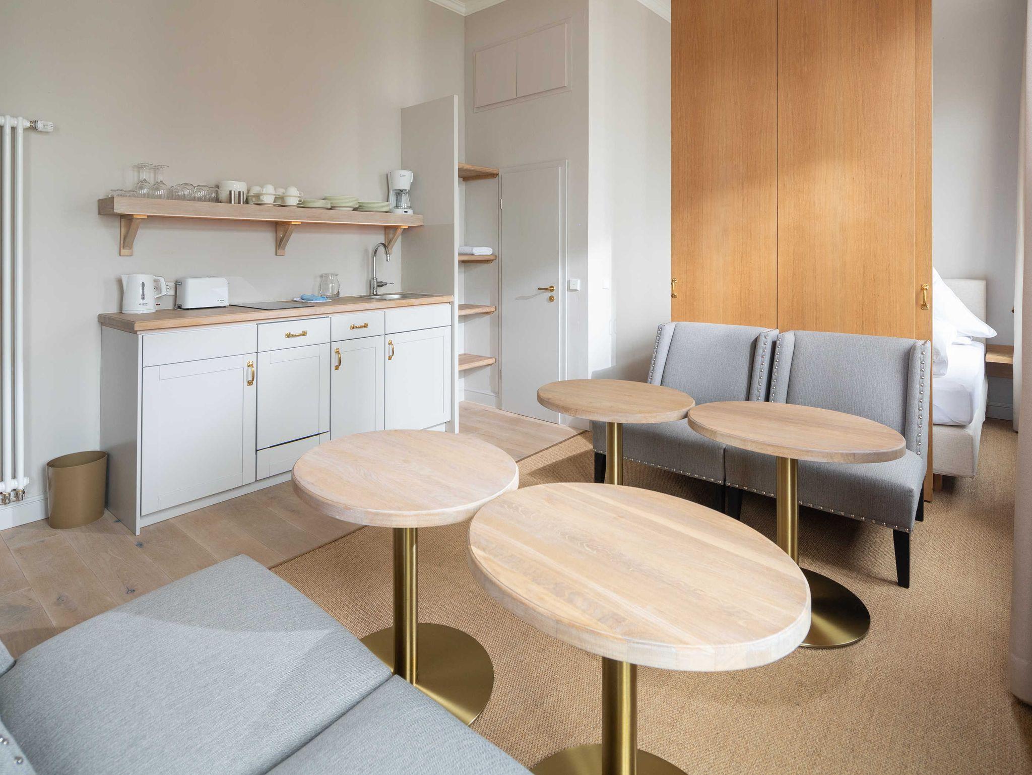 In diesem Ein-Raum-Appartement erwarten Sie zwei 1,80 x 2,10 m großes Premium-Boxspringbetten, eine Kochnische sowie ein modernes Badezimmer. Der Boden des Appartements ist mit einem Sisal-Teppich ausgestattet, vor der Küchenzeile finden Sie Echtholzboden vor.