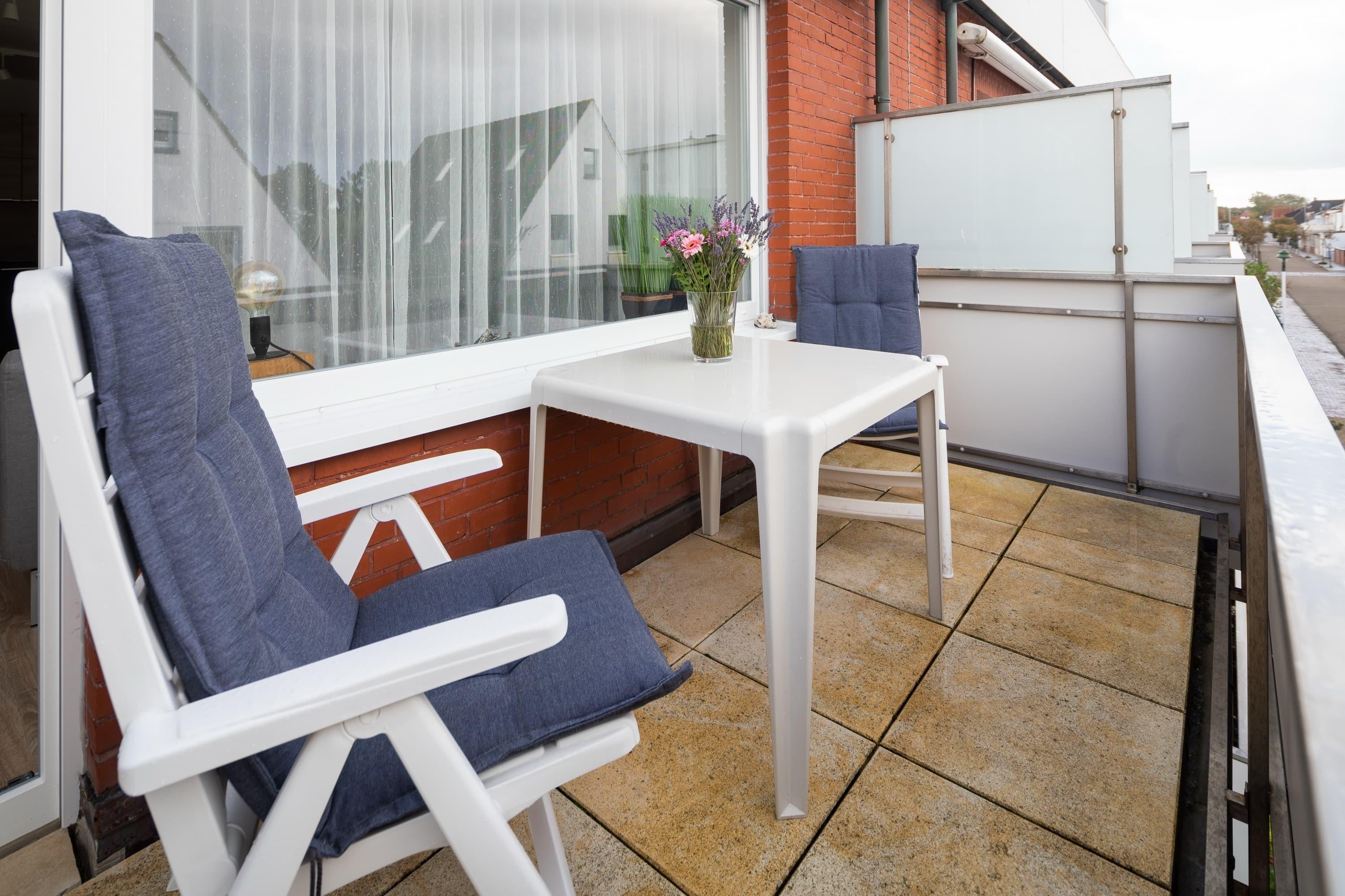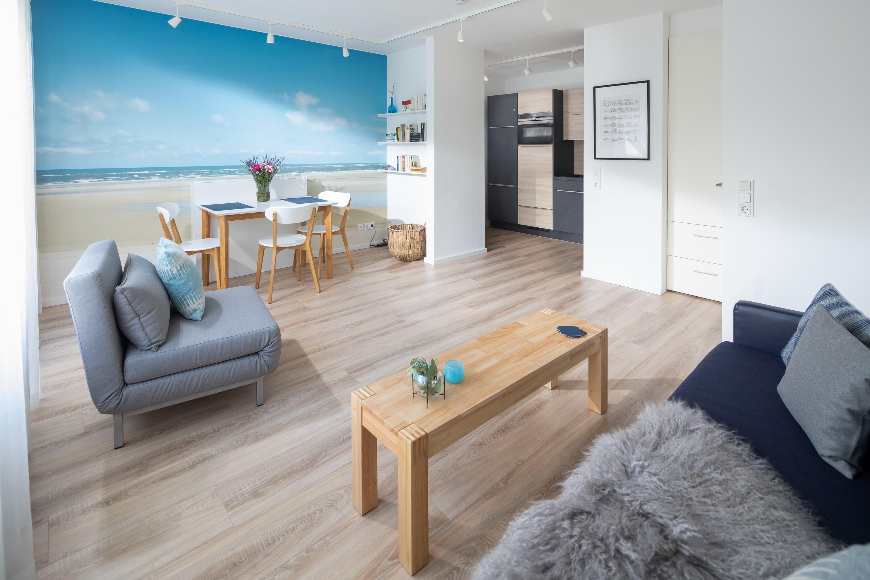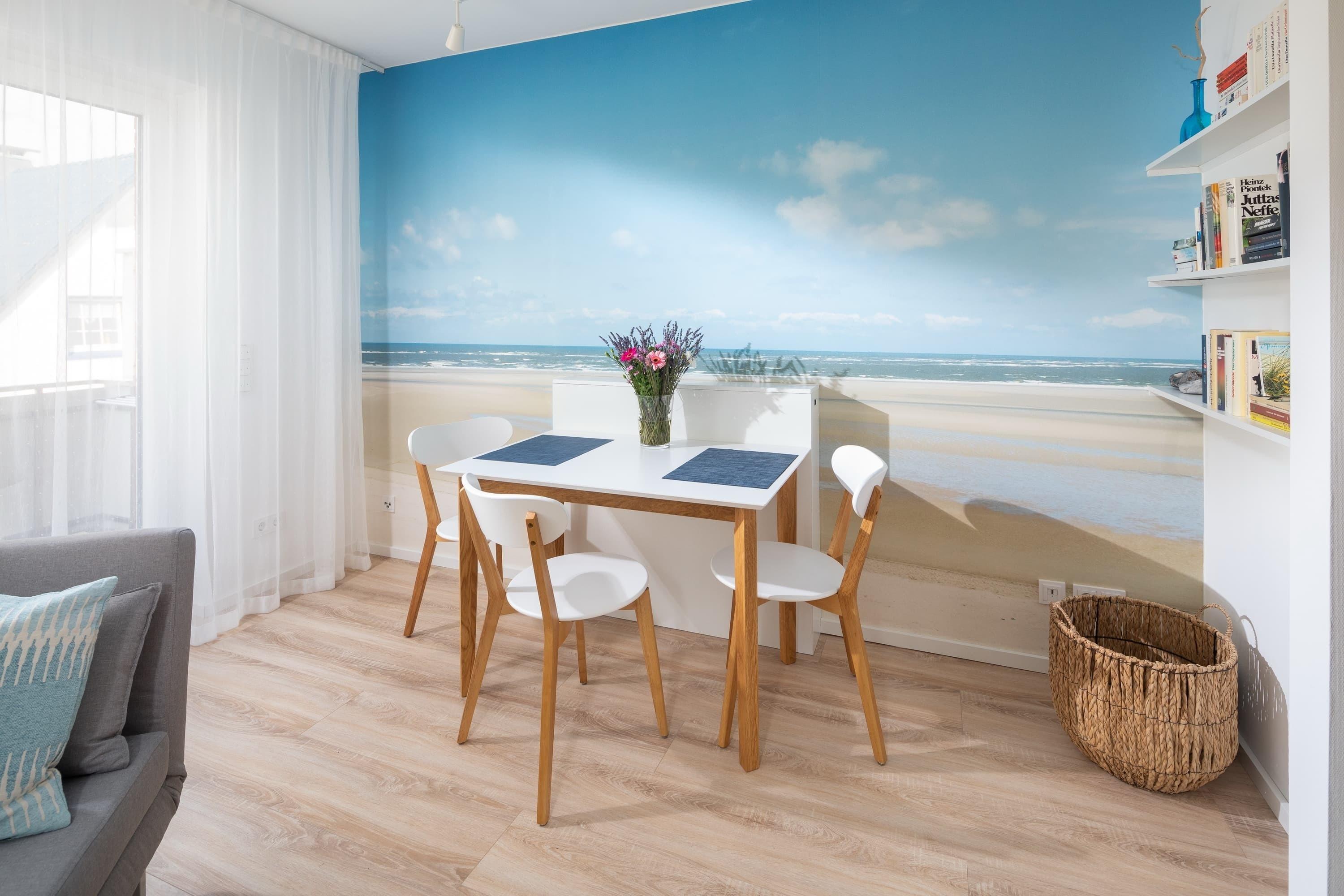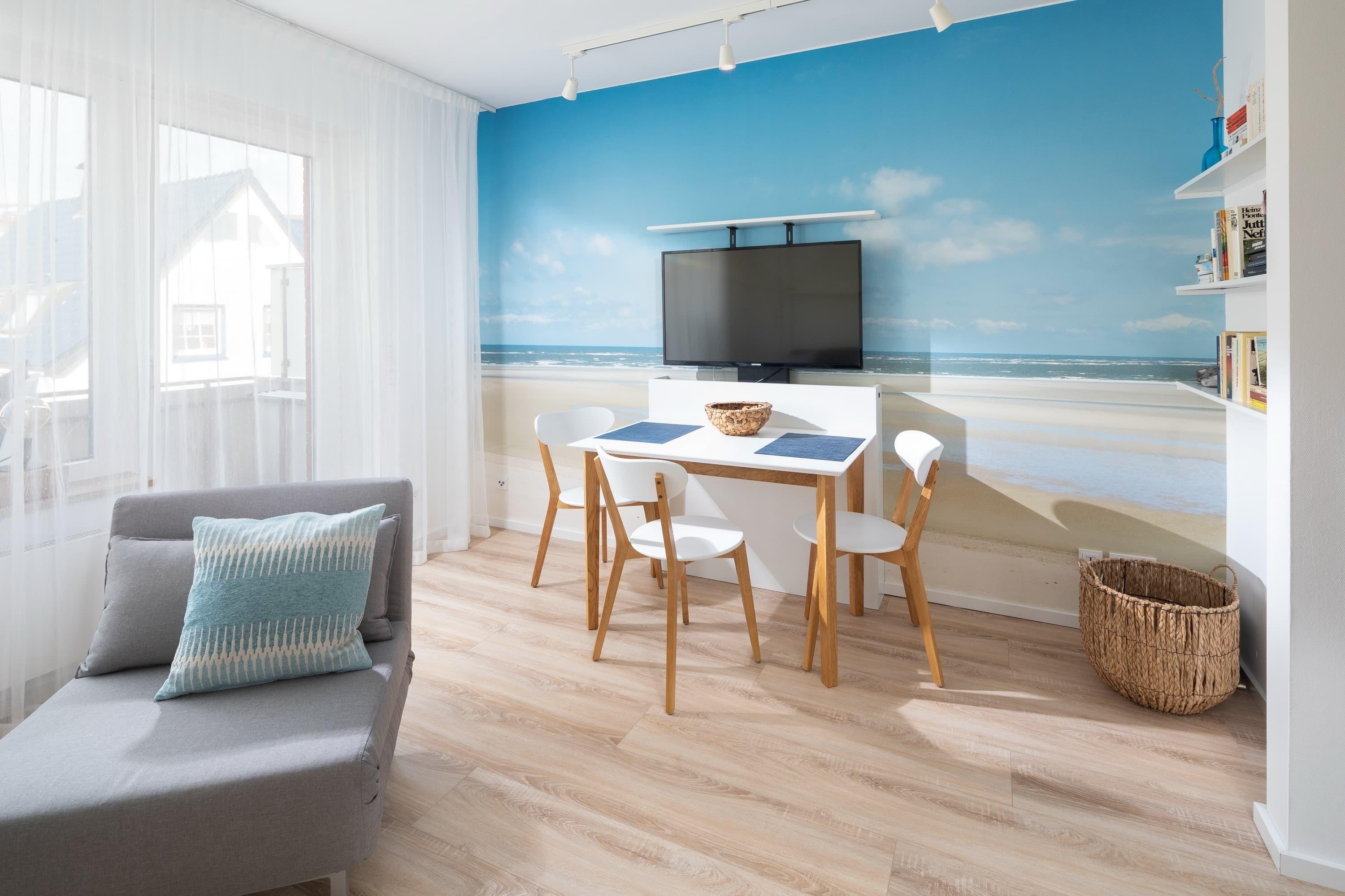 Die Ferienwohnung wurde 2019 komplett saniert. Der helle Wohn- und Schlafraum bietet ein hochwertiges Schrankbett mit integriertem Sofa. Am Esstisch können Sie gemeinsam frühstücken oder im gemütlichen Sessel etwas lesen. Die schöne Fototapete sorgt auch bei Nieselregen für Urlaubsgefühl! Die Küche bietet alle gängigen Elektrogeräte und wird auch Kochliebhabern gerecht. Vom Wohn- und Schlafraum aus gelangen Sie auf den geräumigen Balkon, von dem aus Sie die Dünen des Nordstrandes sehen können. Nur 50m sind es bis zum beliebten „Januskopf“ mit Surfcafé und Cornelius.
