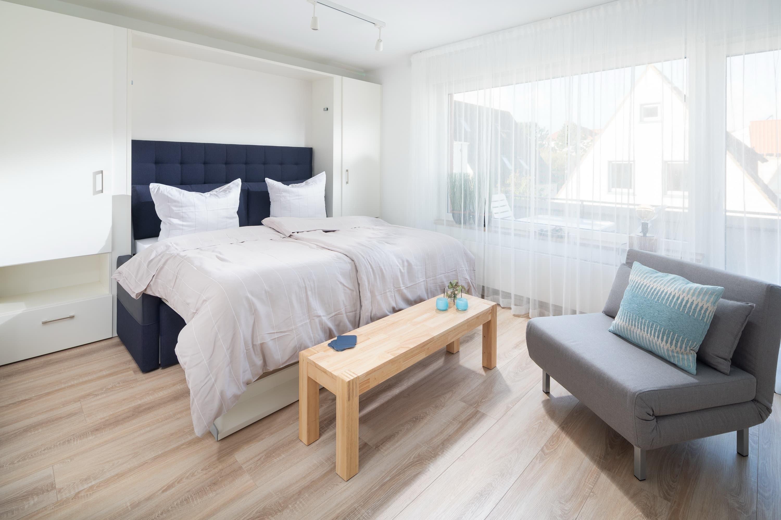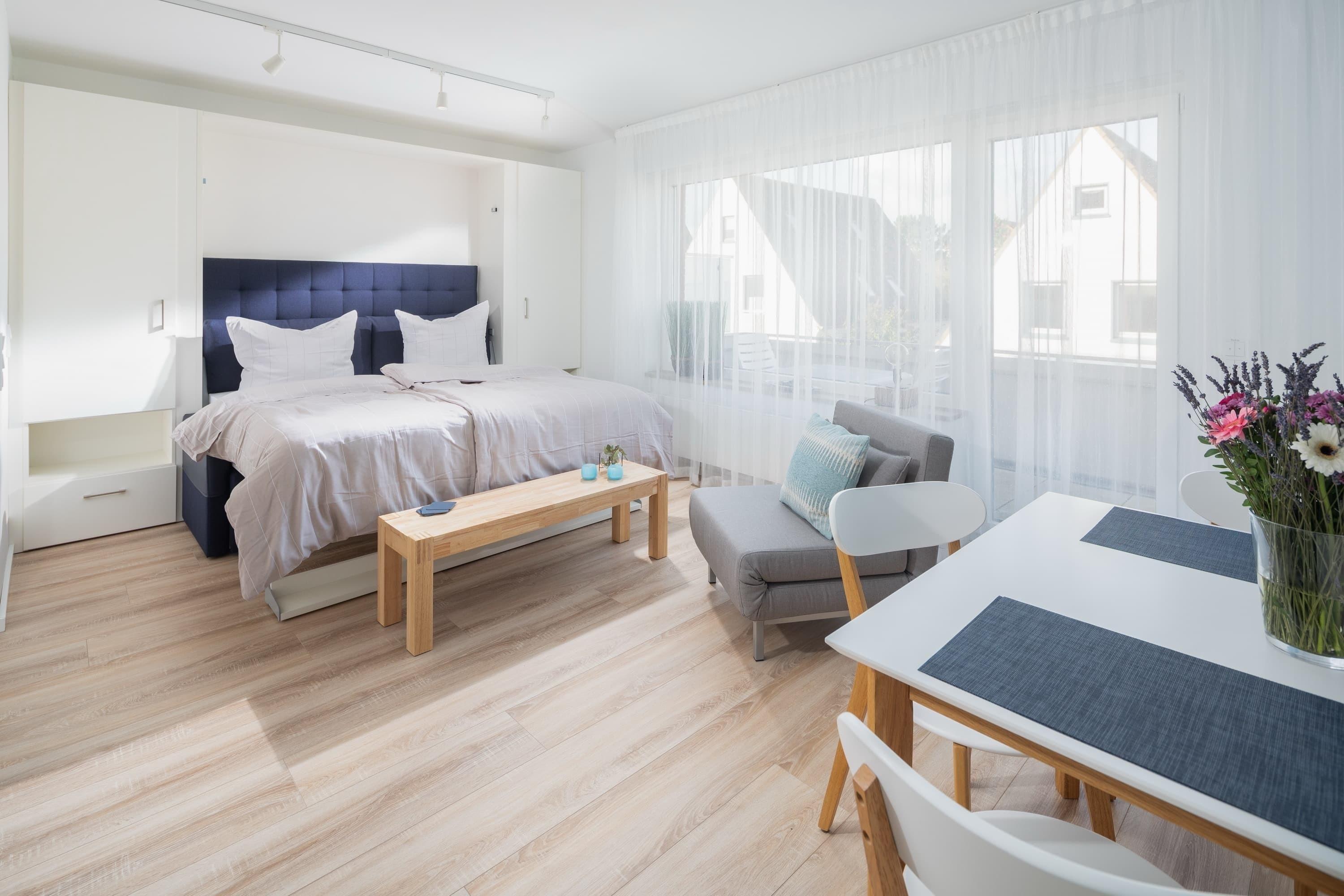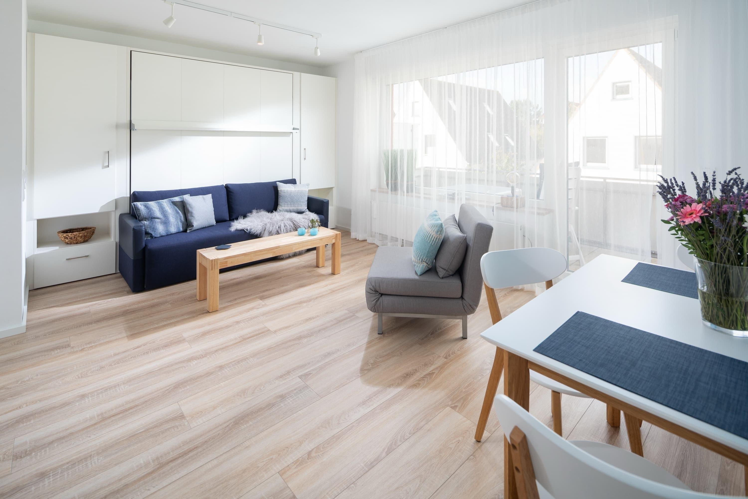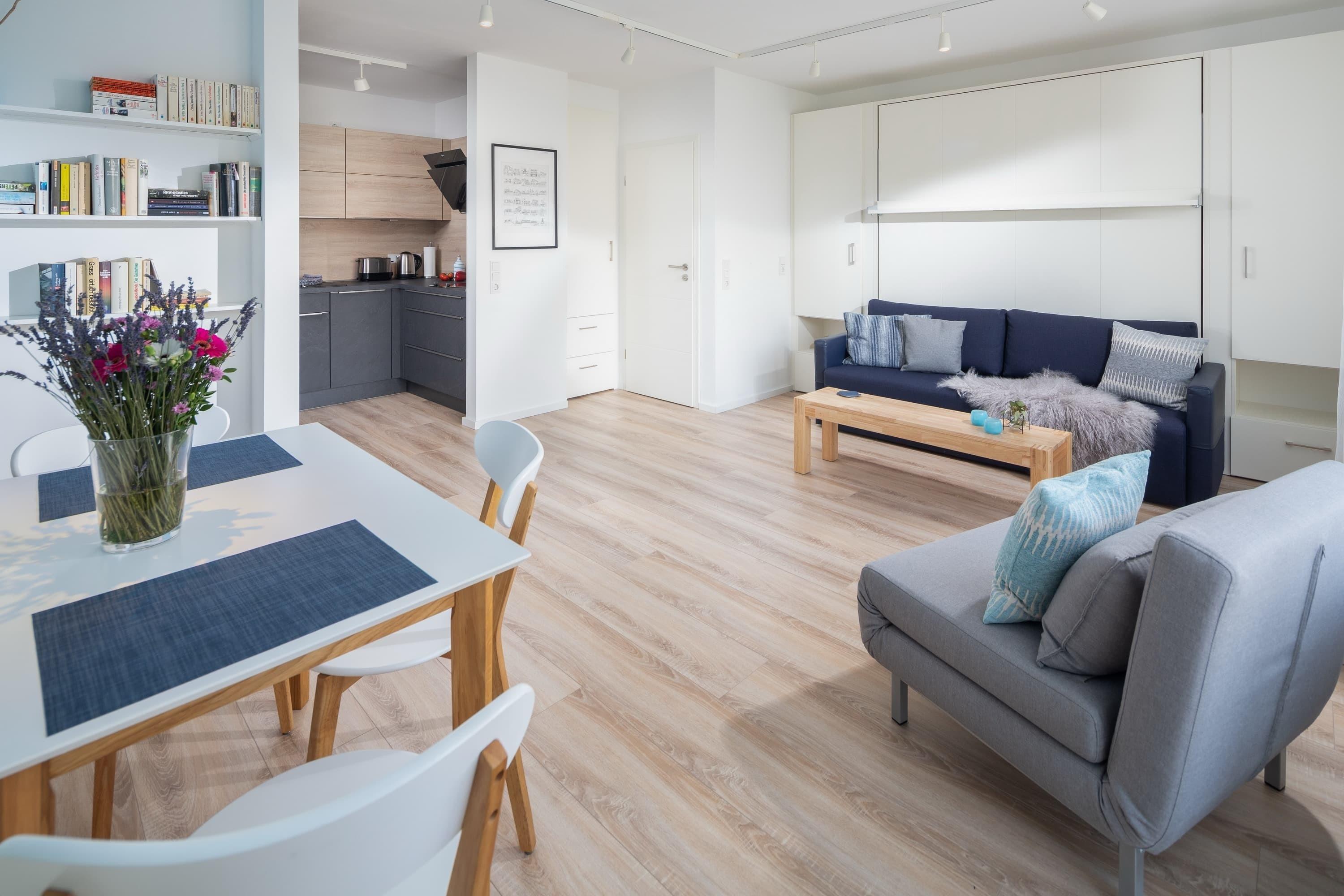 Die Ferienwohnung wurde 2019 komplett saniert. Der helle Wohn- und Schlafraum bietet ein hochwertiges Schrankbett mit integriertem Sofa. Am Esstisch können Sie gemeinsam frühstücken oder im gemütlichen Sessel etwas lesen. Die schöne Fototapete sorgt auch bei Nieselregen für Urlaubsgefühl! Die Küche bietet alle gängigen Elektrogeräte und wird auch Kochliebhabern gerecht. Vom Wohn- und Schlafraum aus gelangen Sie auf den geräumigen Balkon, von dem aus Sie die Dünen des Nordstrandes sehen können. Nur 50m sind es bis zum beliebten „Januskopf“ mit Surfcafé und Cornelius.