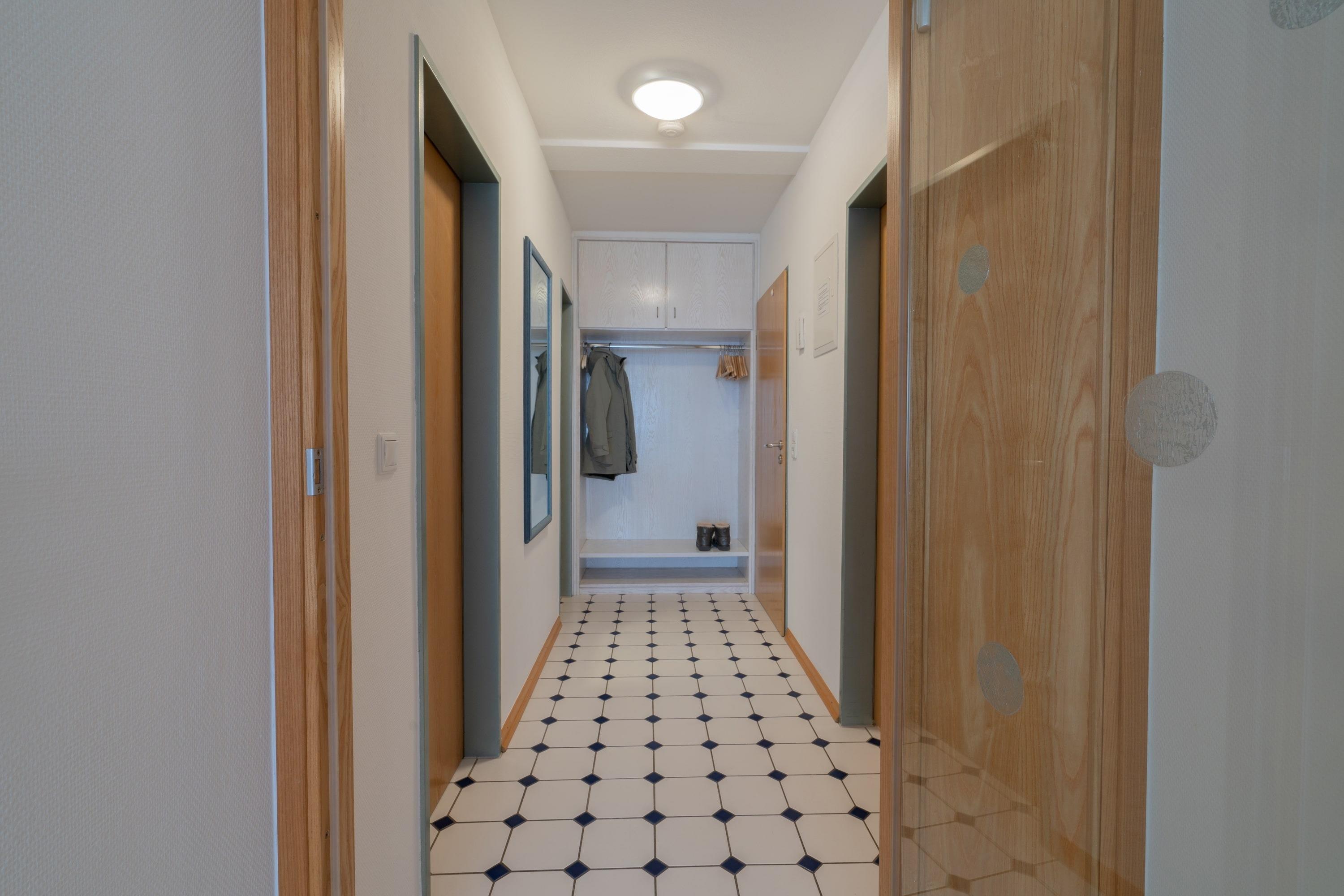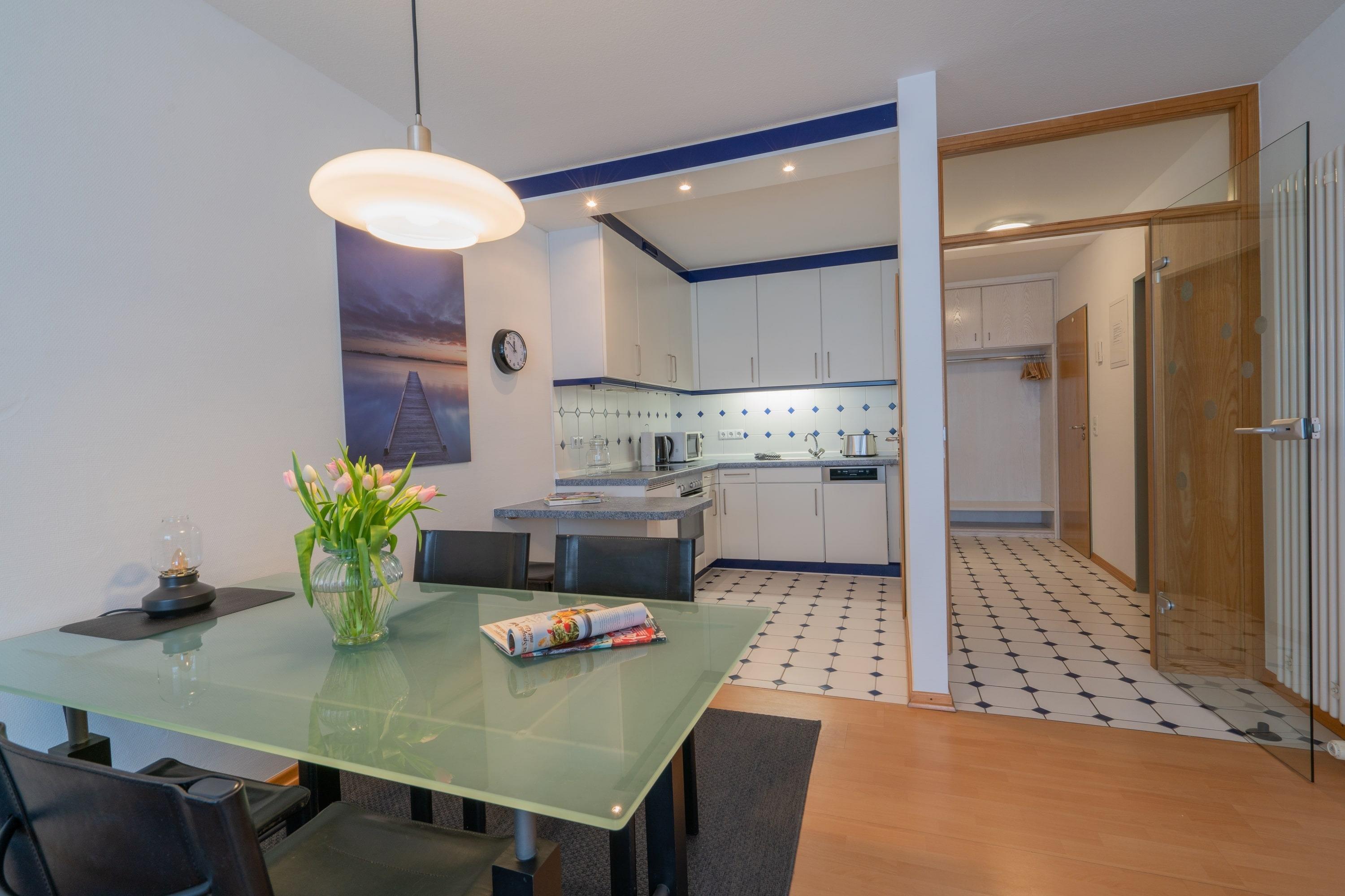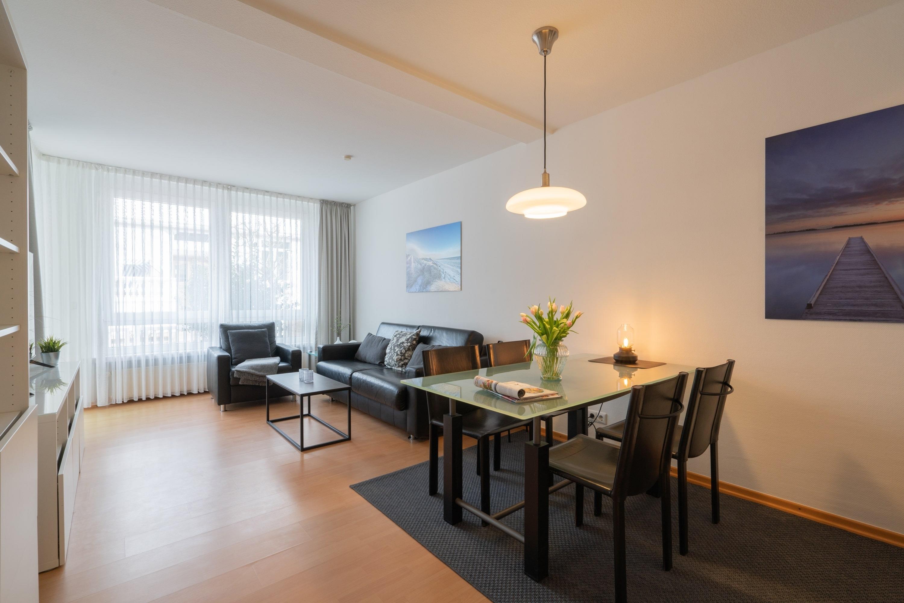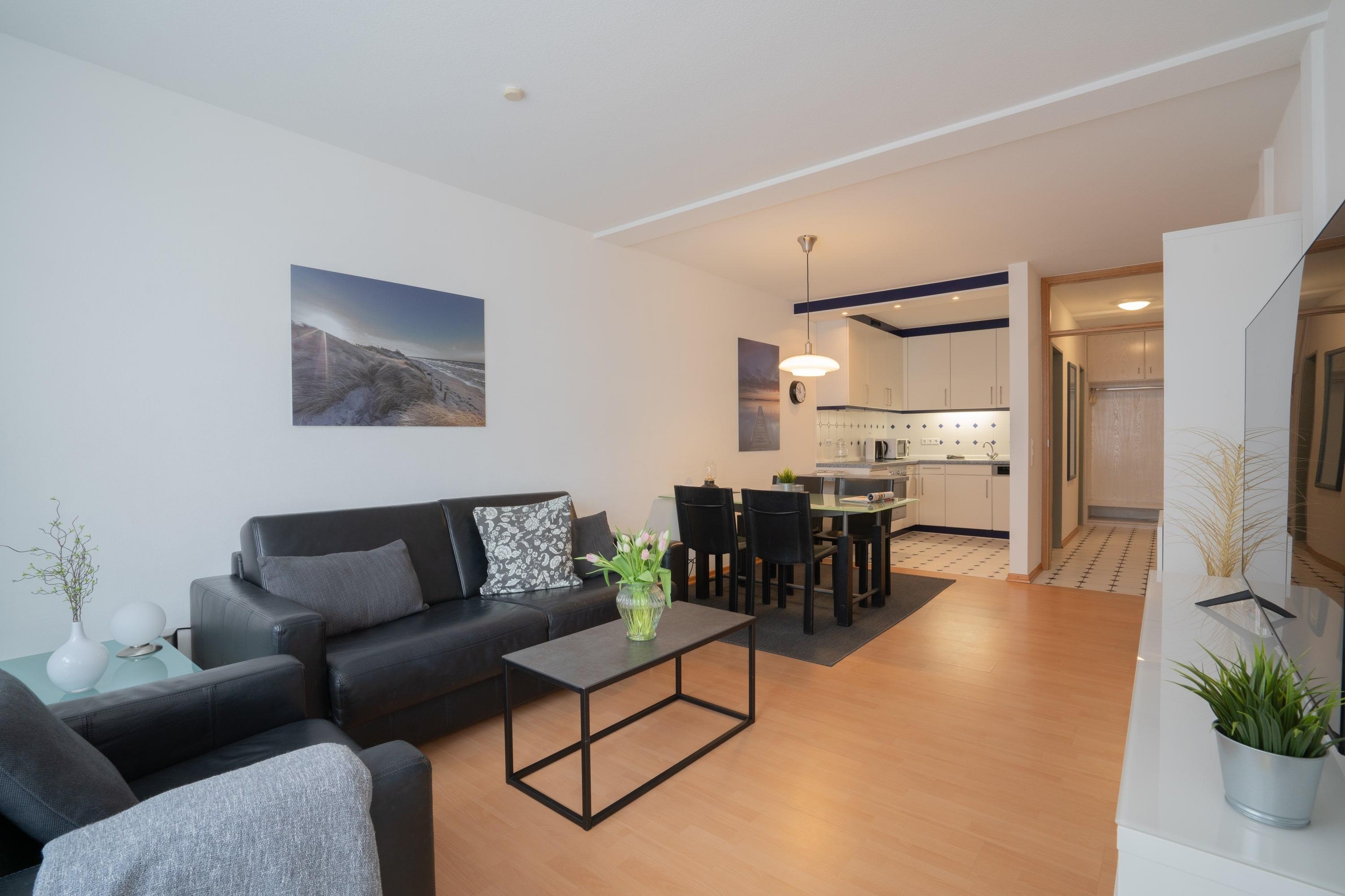 Die Wohnung überzeugt mit einer offenen Gestaltung. Das separate Schlafzimmer mit einem gemütlichen Doppelbett sorgt für erholsame Nächte, während das Schlafsofa im Wohnzimmer zusätzlichen Platz für Ihre Mitreisenden bietet. Der Wohnbereich ist hell und freundlich gestaltet – ideal, um nach einem Tag am Meer die Beine hochzulegen. Die offene Küche ist voll ausgestattet, sodass Sie sich kulinarisch austoben können.