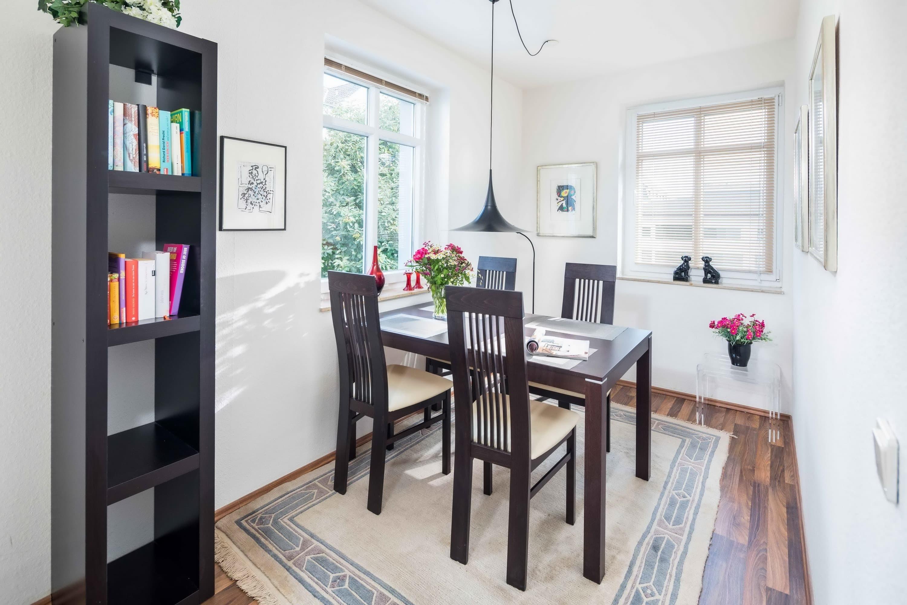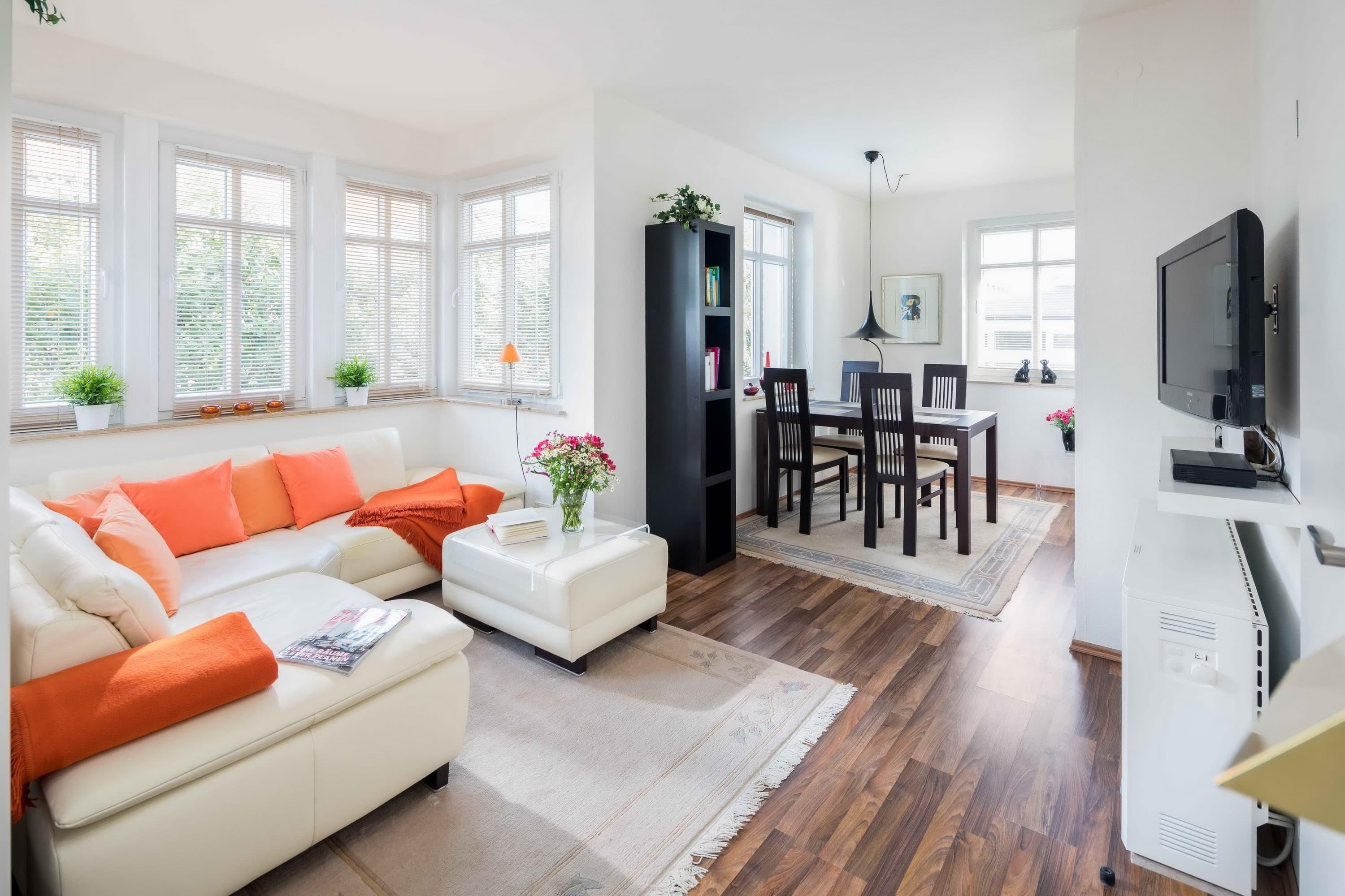 Die modern eingerichtete Ferienwohnung bietet auf 48qm einen hellen und gemütlichen Wohn-und Essbereich. Eine offene Küche und ein geräumiger Esstisch laden zum Entspannen und Genießen ein. Das separate Schlafzimmer bietet ein Doppelbett mit 1,80m Breite und einen geräumigen Kleiderschrank. Das Duschbad bietet für 2 Personen reichlich Platz und hat ein Doppelwaschbecken.