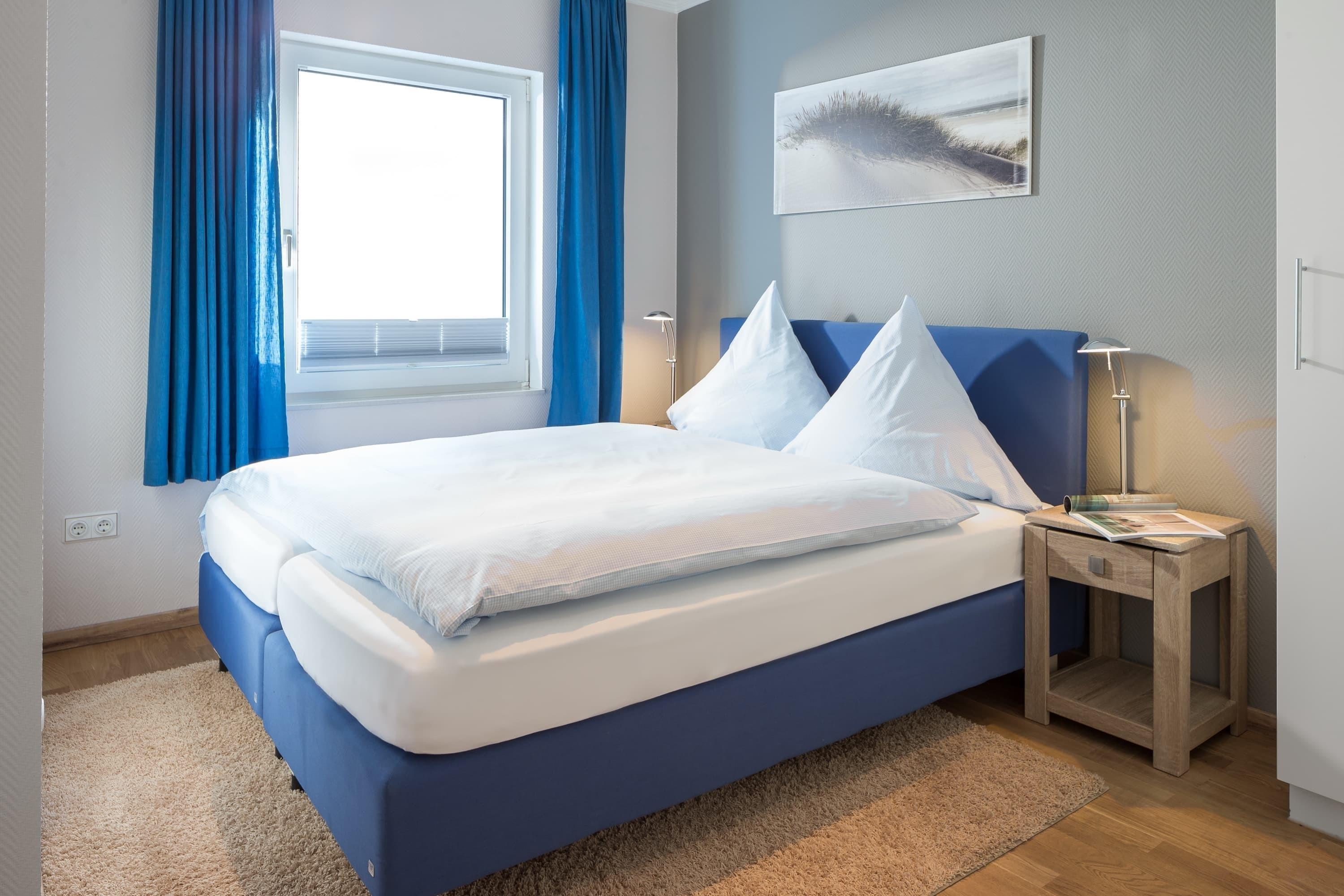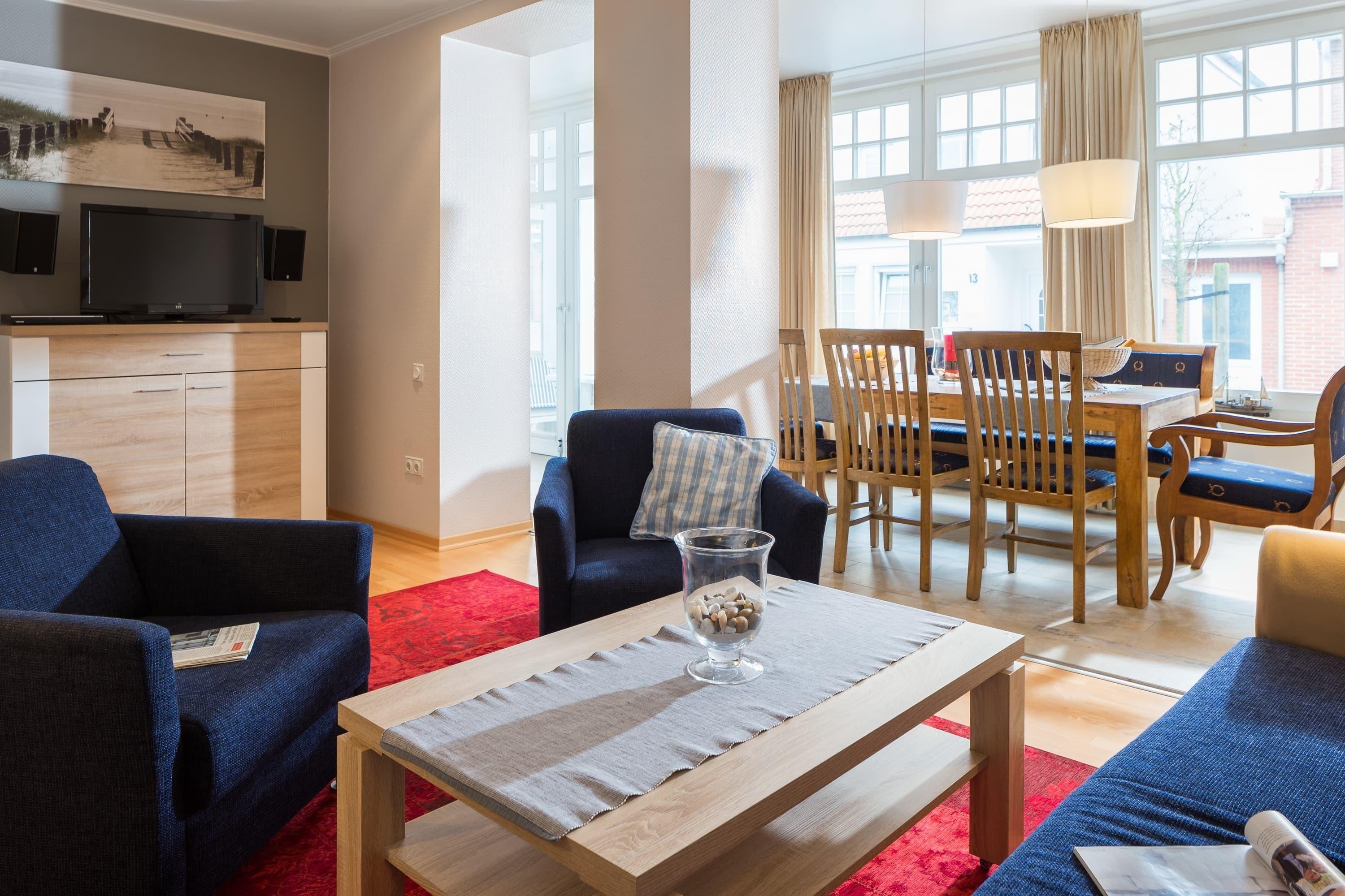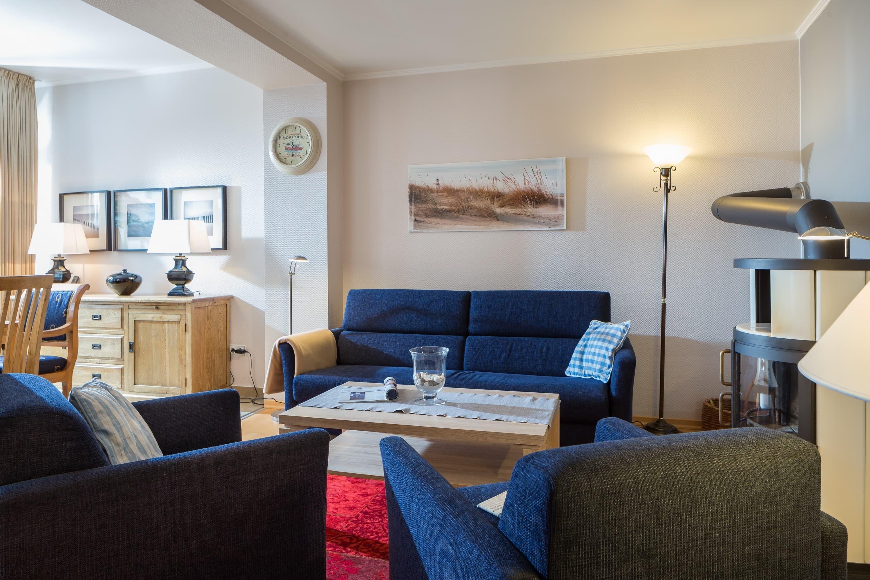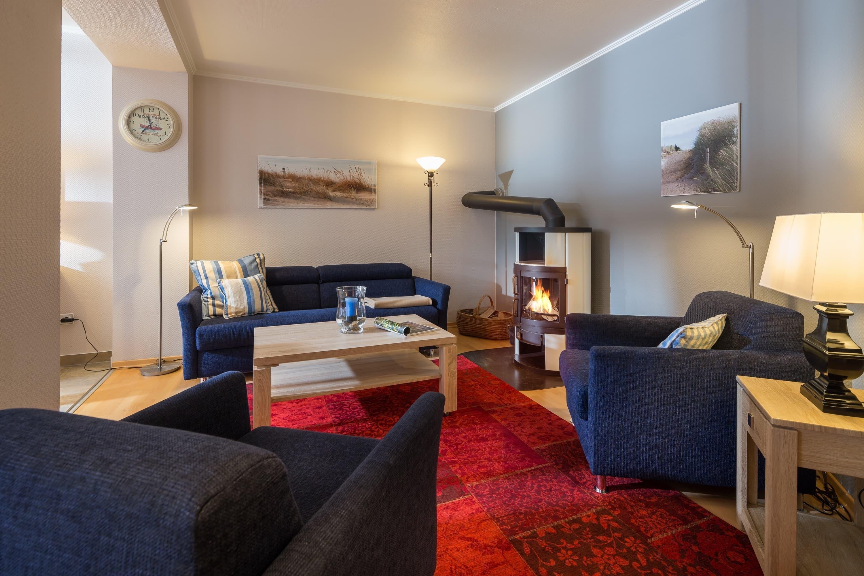 Die großzügige 80 m² EG-Wohnung mit einem 8 m² Lichthof bietet ausreichend Platz für bis zu 4 Personen. Die lichtdurchflutete Wohnküche mit großem, gemütlichem Essbereich verfügt über einen kleinen Freisitz im Außenbereich. Das komfortable Sofa im Wohnzimmer mit Kamin lädt zum gemütlichen Beisammen sein ein. Die beiden separaten Schlafzimmer verfügen je über ein Doppelbett. Ein Schlafzimmer hat zudem Zugang zum Lichthof. Die Wohnung mit Duschbad und separatem Gäste-WC ist für kleine, sowie große Familien ideal ausgestattet.