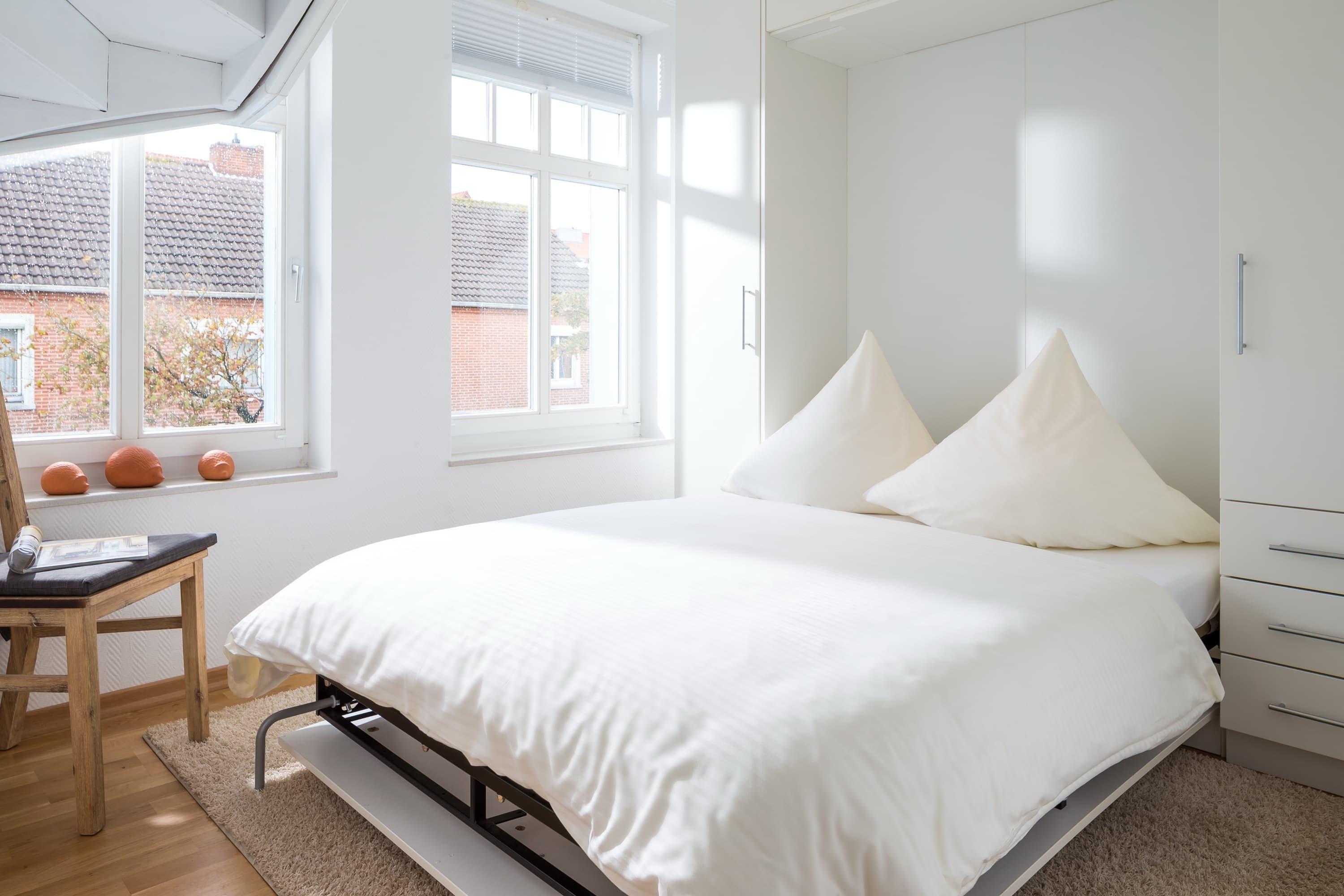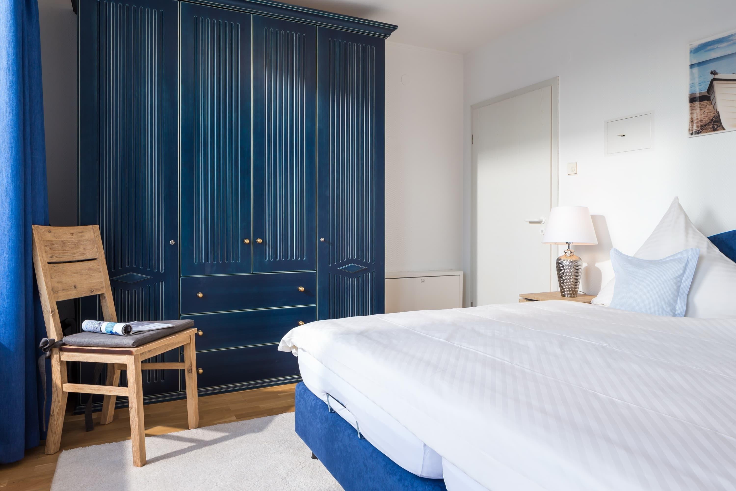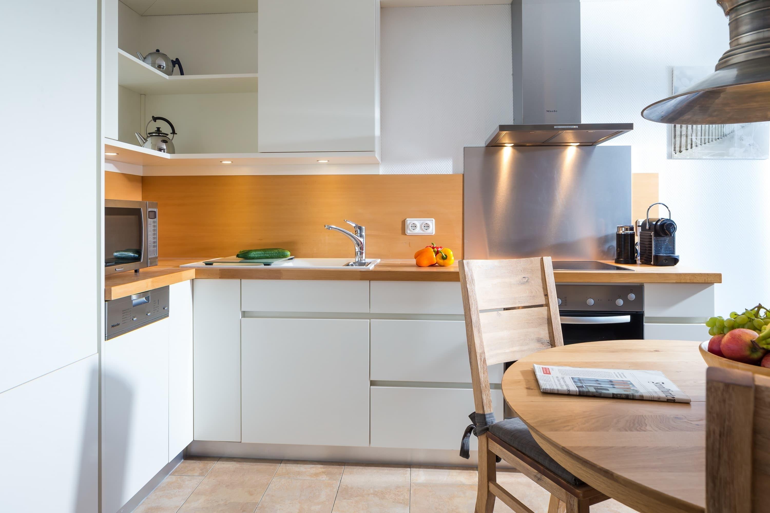 Die geräumige 85m² Maisonette – Wohnung mit einer 12m² Terrasse im 1. OG, sowie einer 42m² Dach-Terrasse bietet großzügigen Platz für bis zu 4 Personen. Ein Schlafzimmer verfügt über ein Doppelbett und das zweite über ein komfortables 1,40 Kingsize Schrankbett.
