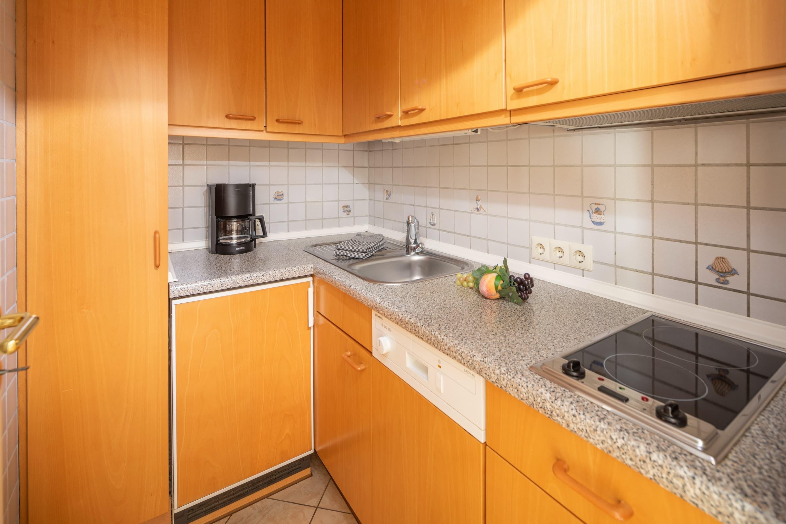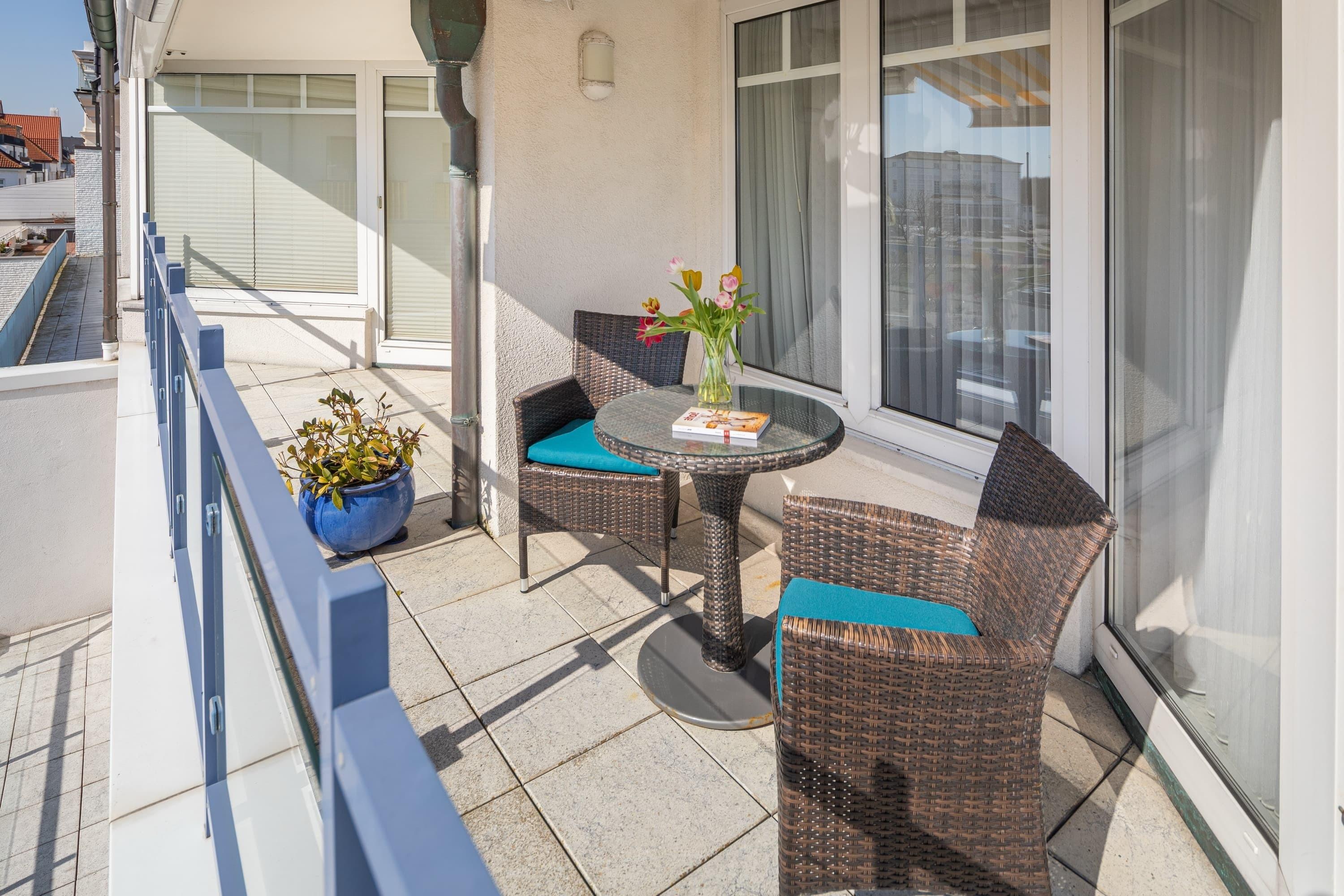 Die helle und freundliche Ferienwohnung verfügt über ein sehr geräumiges Wohnzimmer mit Esstisch und Couchgarnitur. Von dort aus betreten Sie auch den 11qm großen Südwestbalkon. Das Schlafzimmer verfügt über ein Doppelbett (180cm Breite) und hat ebenfalls Balkonzugang. Im Wohnzimmer befindet sich mit der Ausziehcouch eine alternative Schlafgelegenheit. Die Küche ist mit allen gängigen Geräten ausgestattet. Das weiß geflieste Duschbad ist hell und freundlich und geräumig.