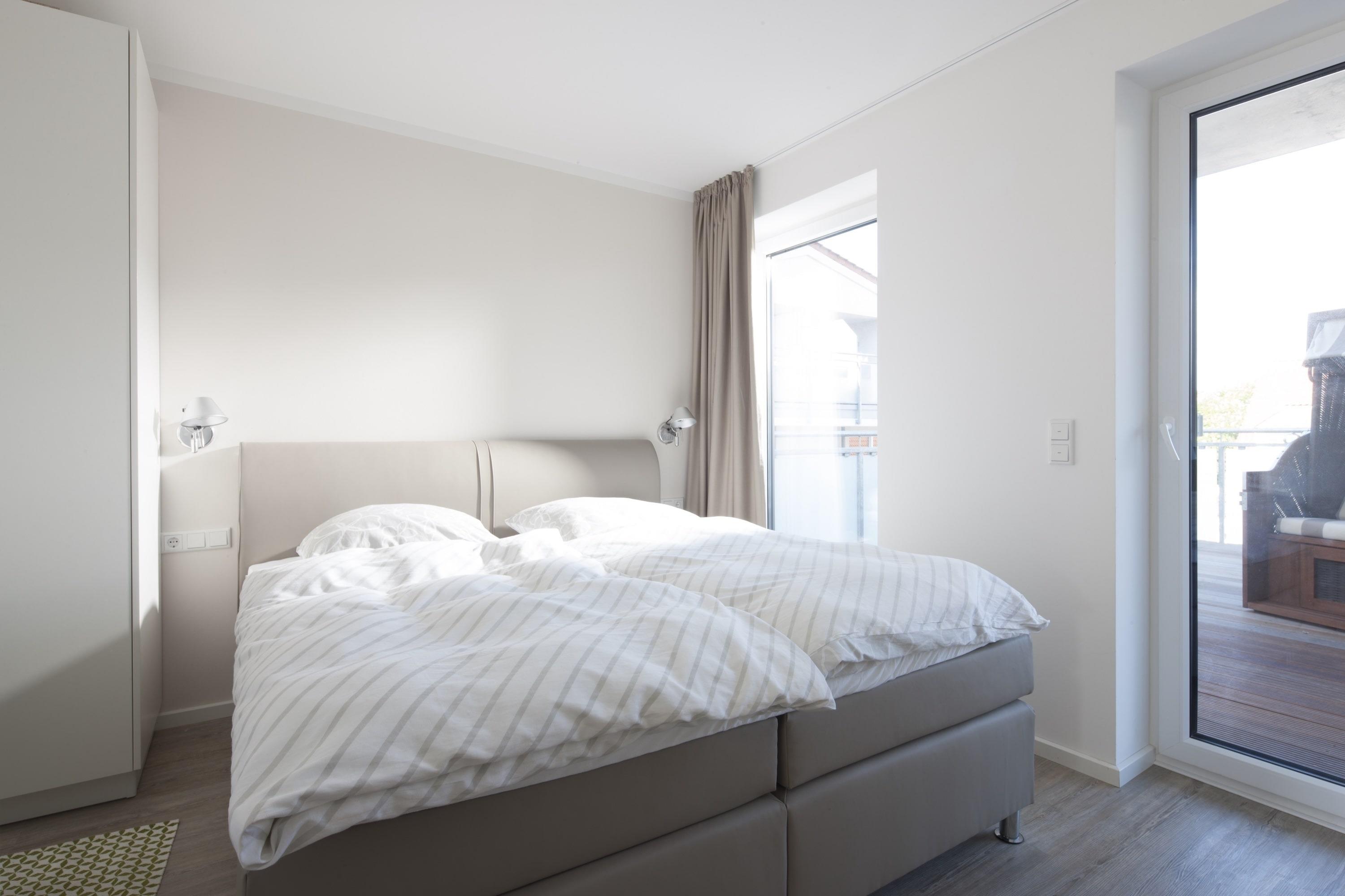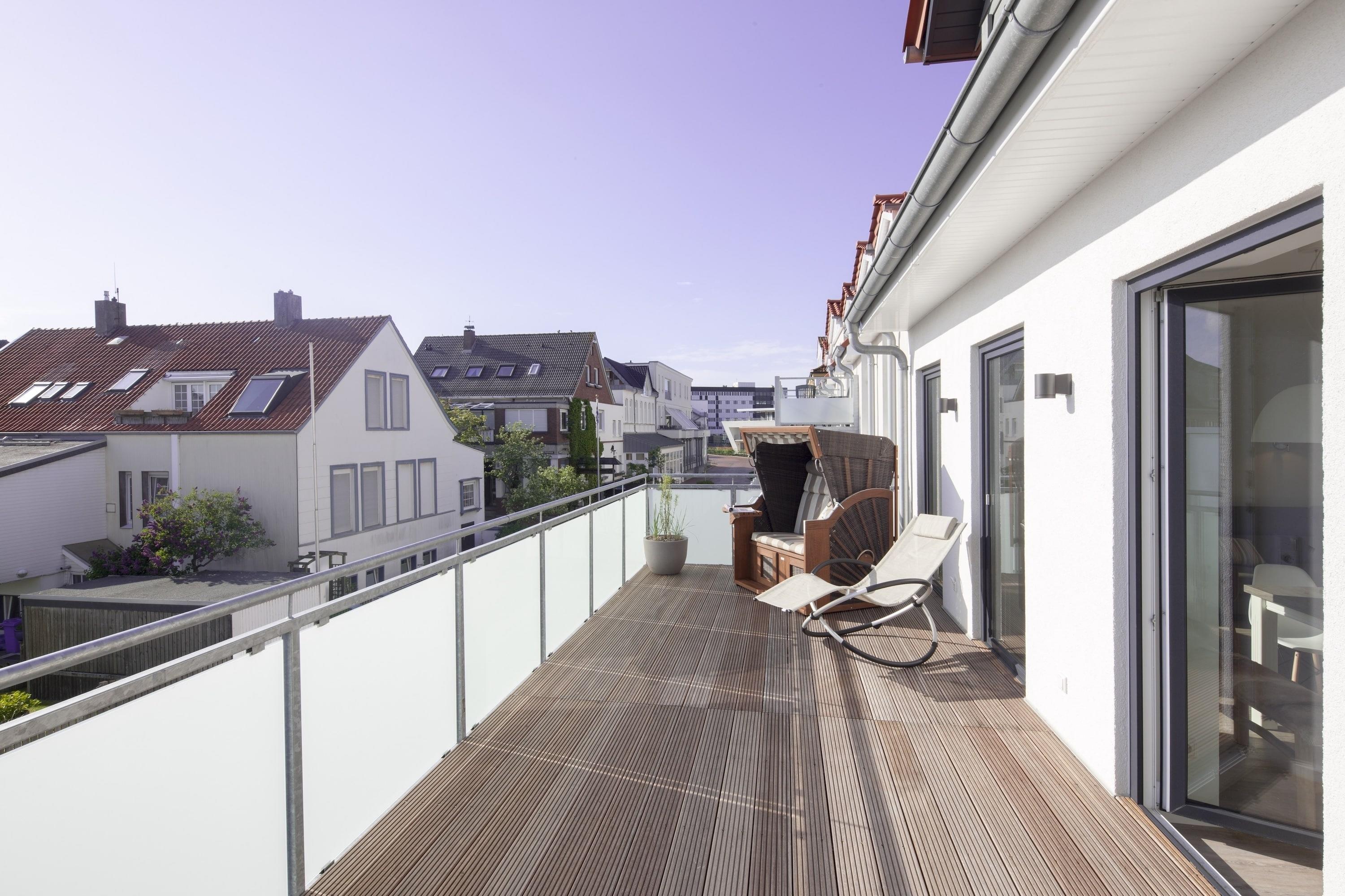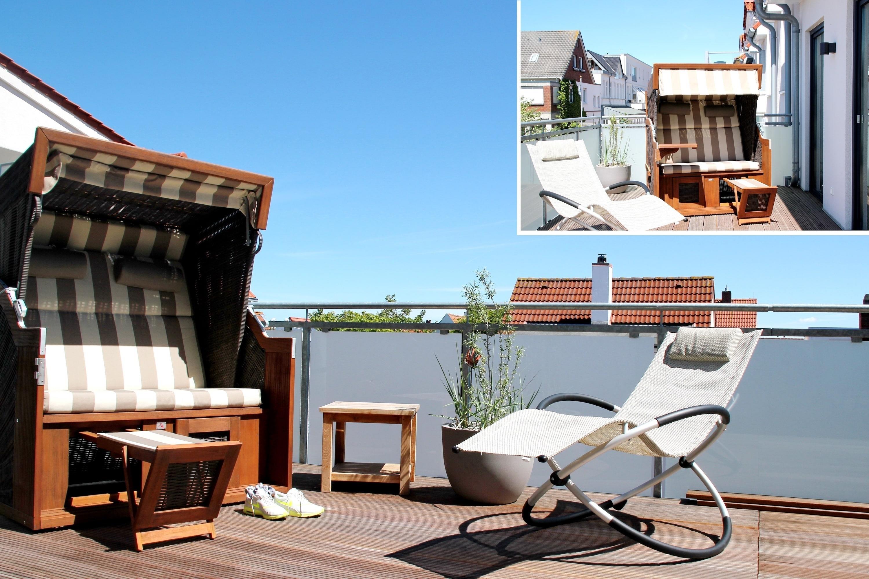 Besonders schön: Zwei große Terrassen – eine zur Ost- (24 qm), eine zur Westseite (34 qm) – schenken Ihnen Sonnenmomente zu jeder Tageszeit. Machen Sie es sich in den beiden Strandkörben bequem, lassen Sie den Tag mit einem Glas Wein ausklingen oder starten Sie mit einem Frühstück an der frischen Luft.