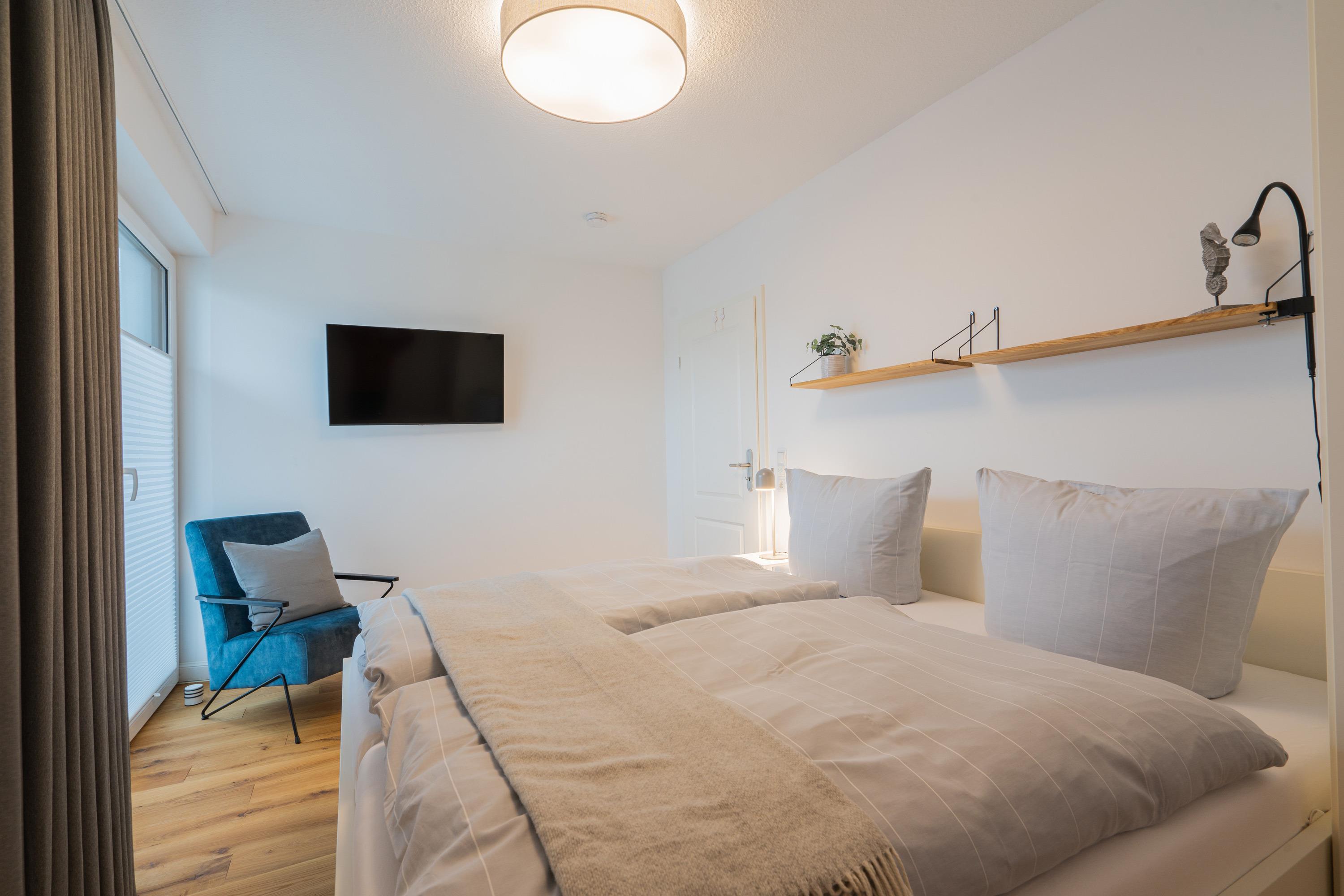 Das separate Schlafzimmer mit Doppelbett (180cm) bietet neben reichlich Stauraum und einem zweiten TV Zugang zum zweiten Balkon
