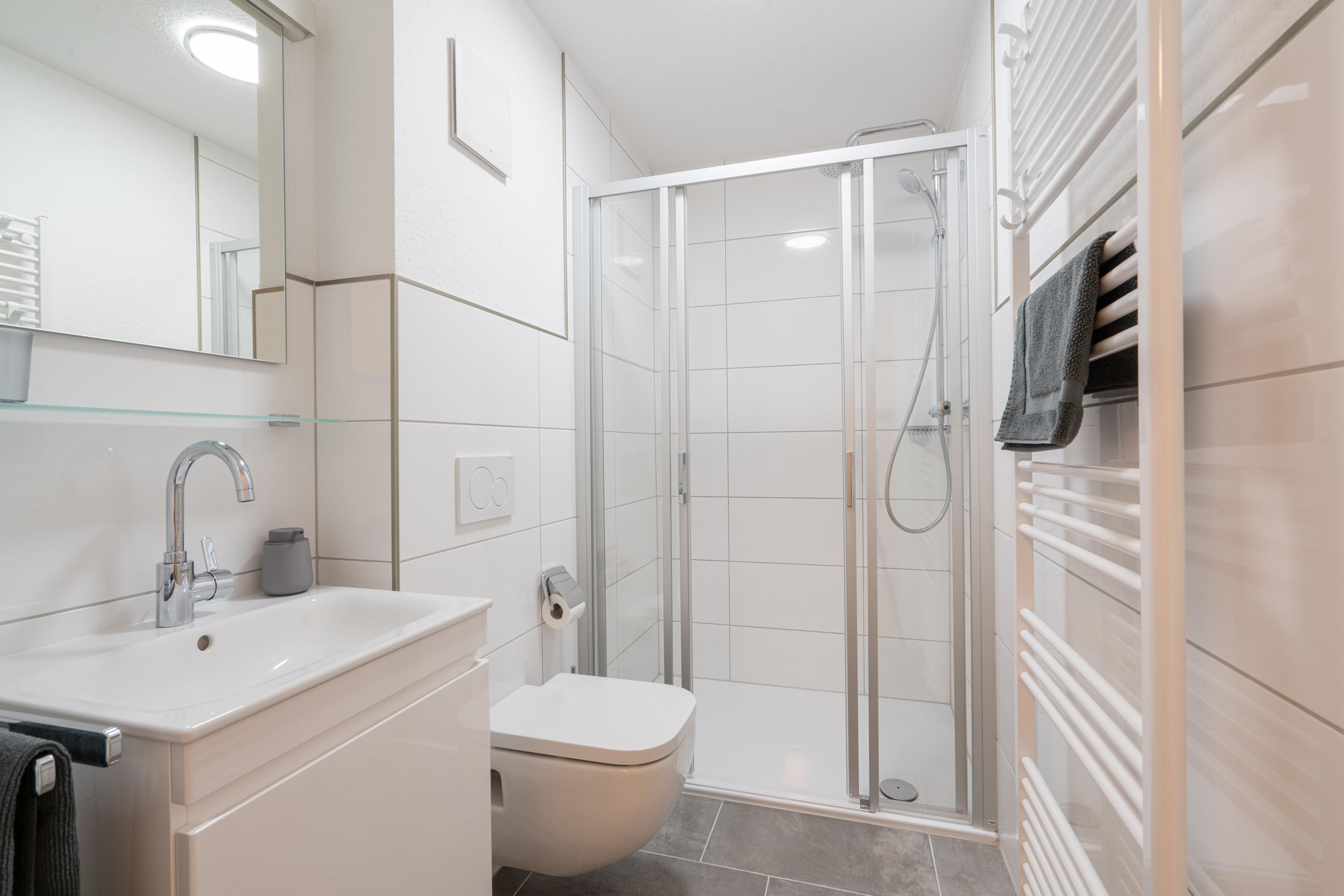 in den Innenhof mit weiterer Sitzmöglichkeit. Das Duschbad ist mit einer bodentiefen Duschwanne ausgestattet.