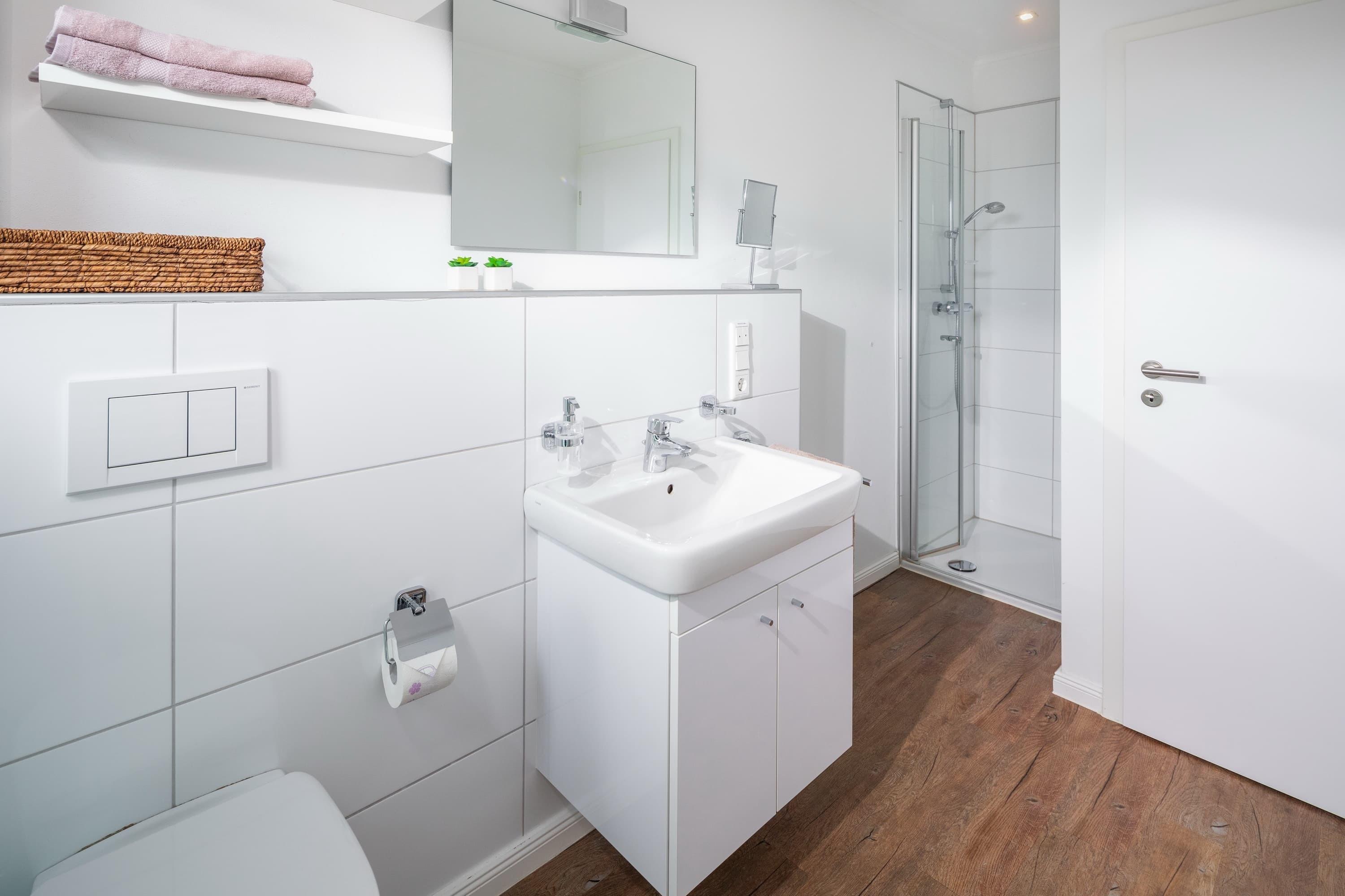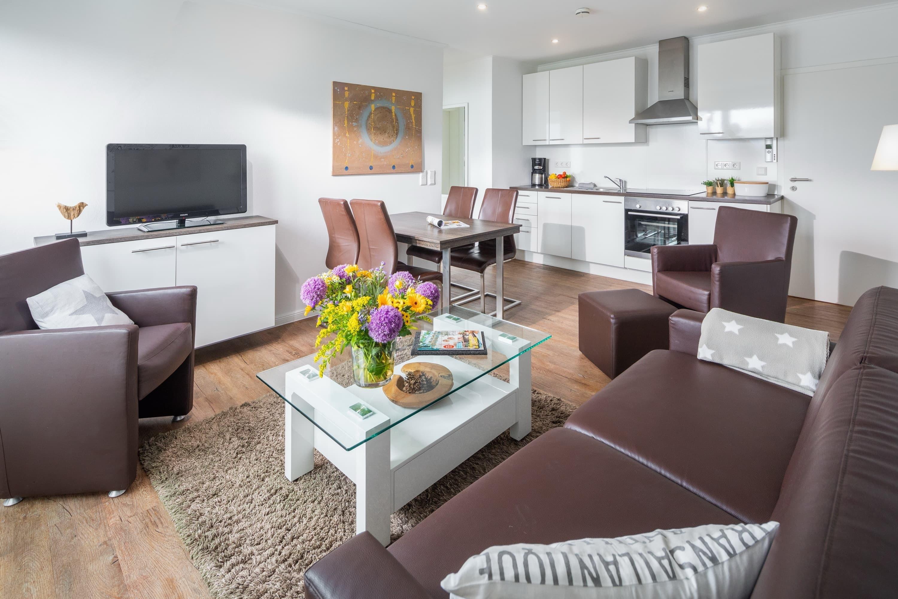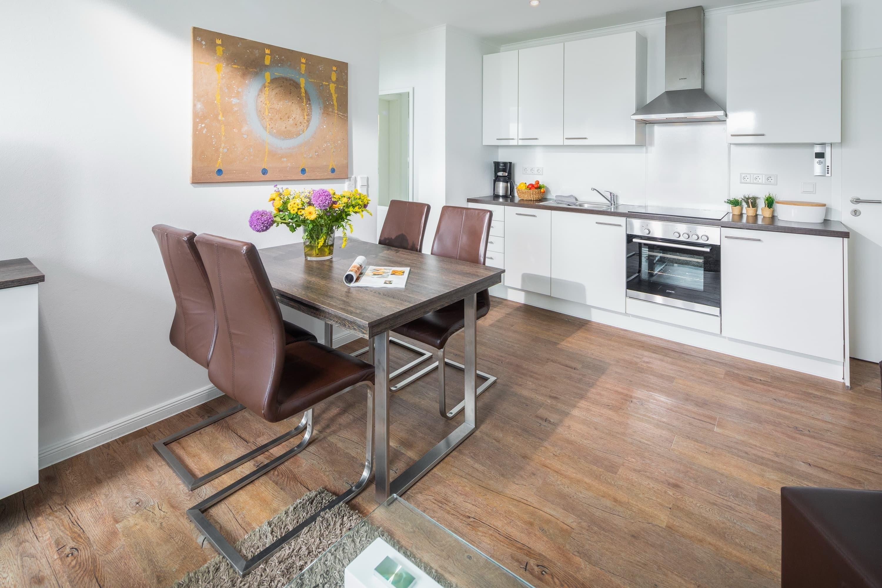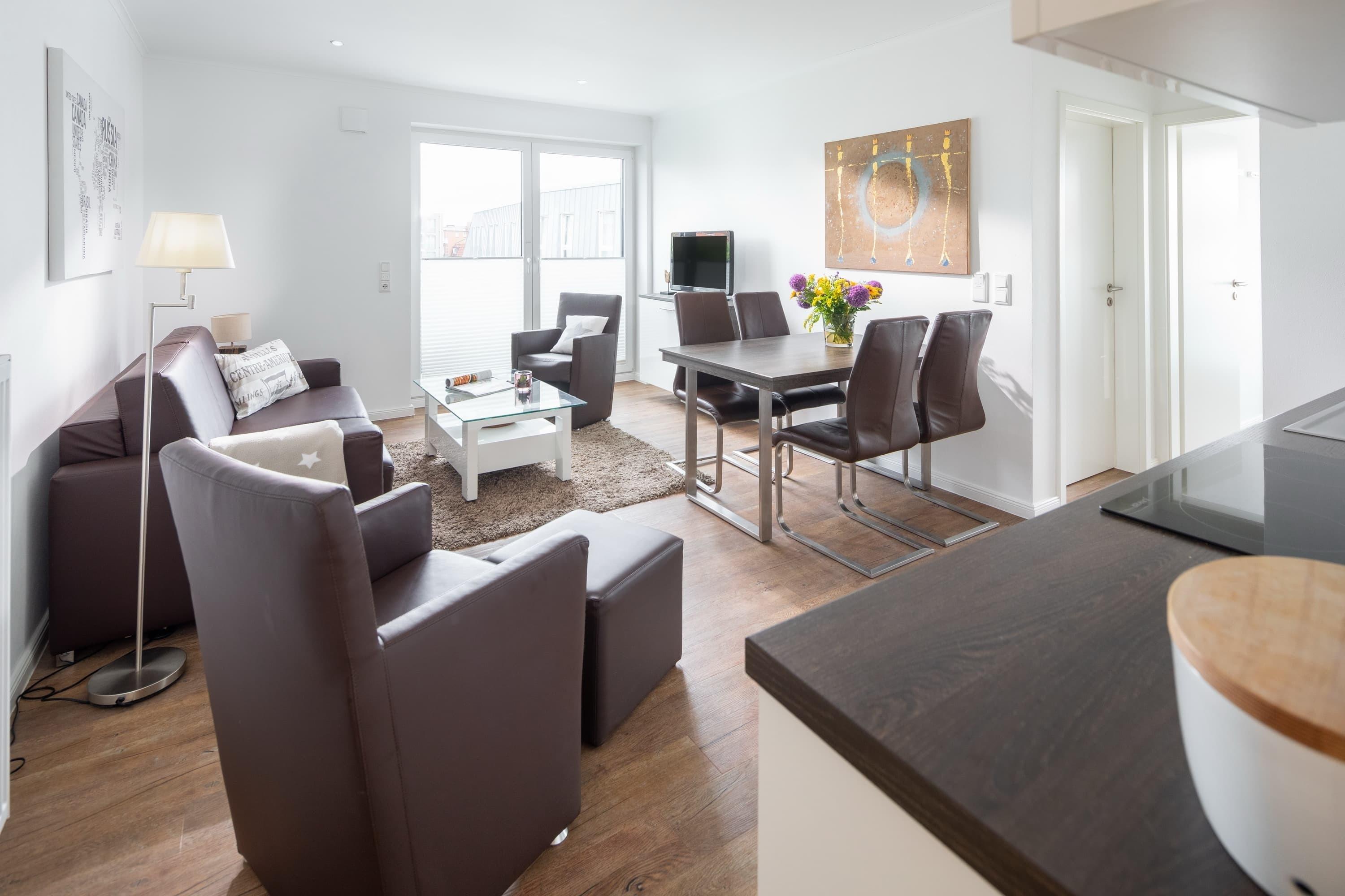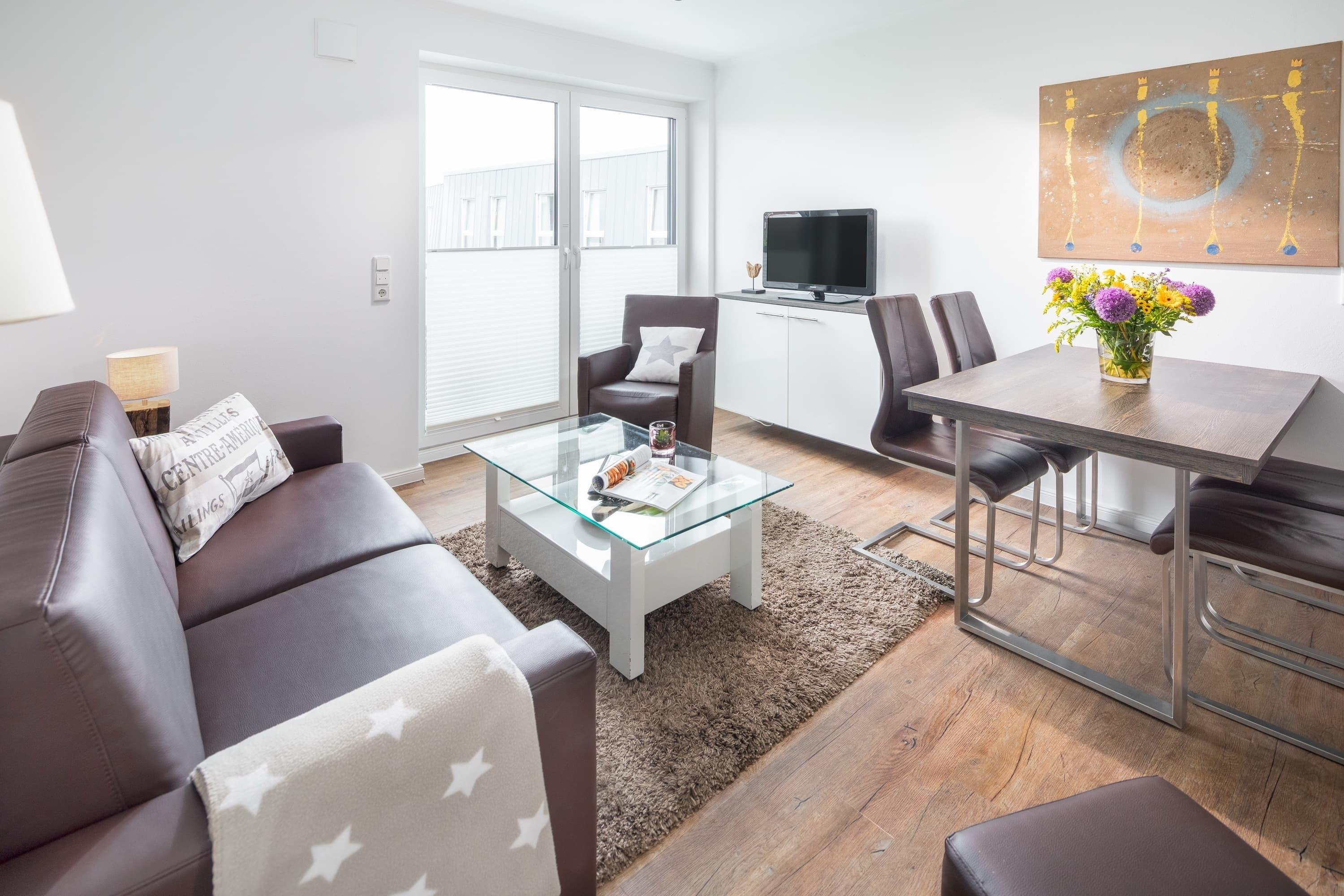 Sie verfügt über ca 45qm Wohnfläche und liegt im zweiten Stock. Sie bietet neben einem geräumigen Schlafzimmer mit Doppelbett einen modern und gemütlich gestalteten Wohnbereich mit Esstisch und angrenzender Küche. Im Wohnzimmer befindet sich eine hochwertige Schlafcouch – die mit wenigen Handgriffen zu einem vollwertigen Bett mit Matratze und Lattenrost ausgezogen werden kann.