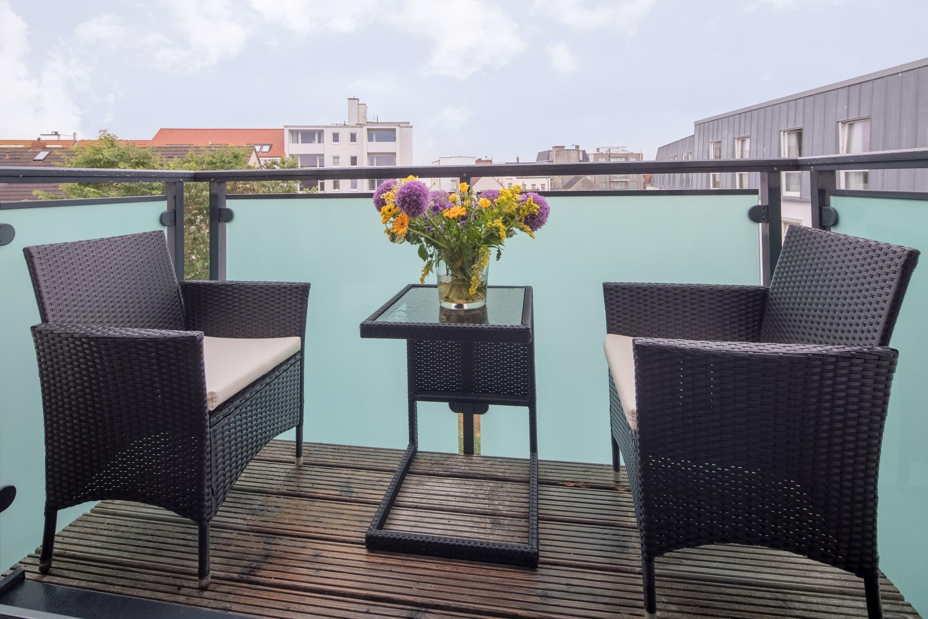 Vom kleinen Balkon am Wohnzimmer können Sie sogar einen kleinen Blick aufs Meer werfen.