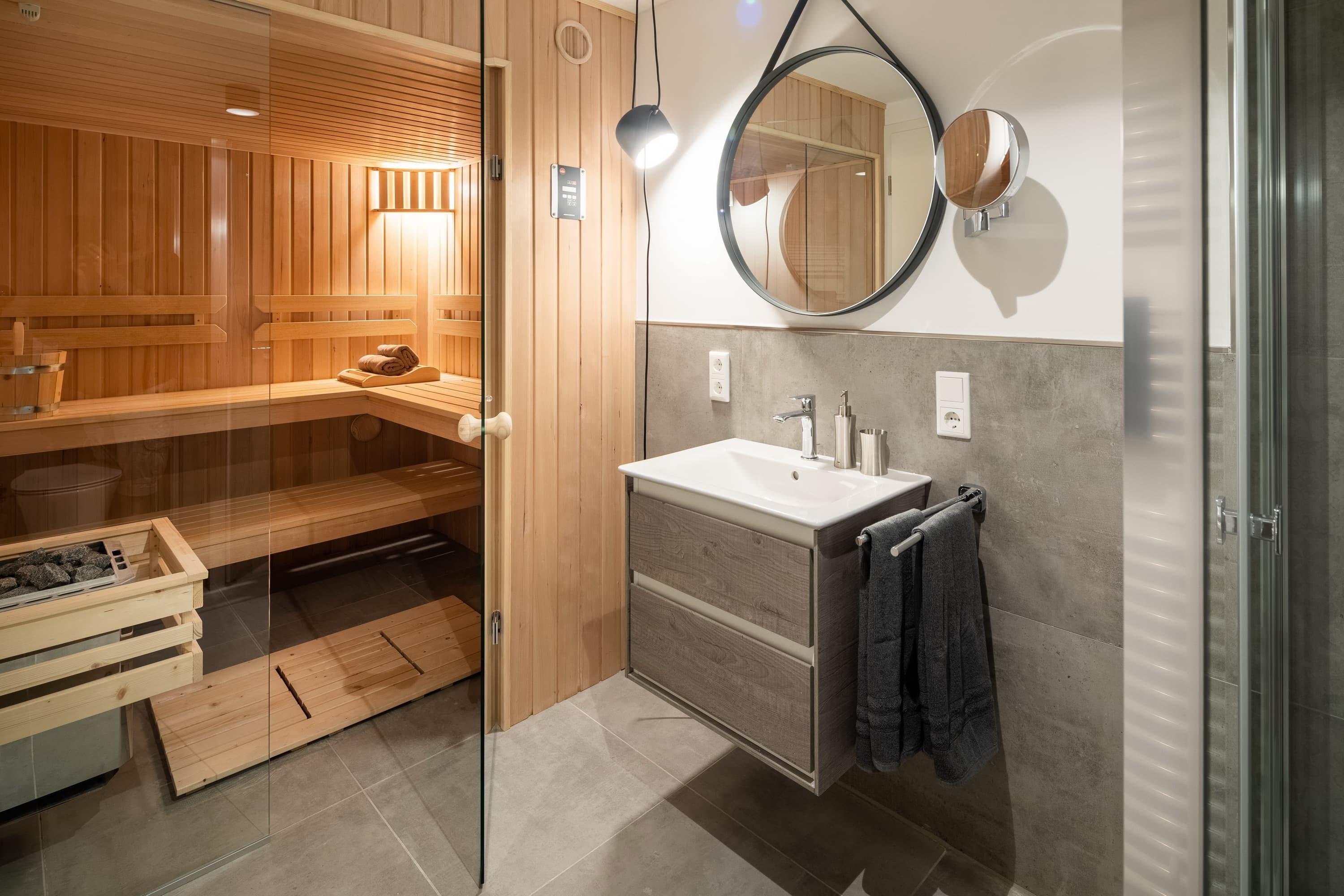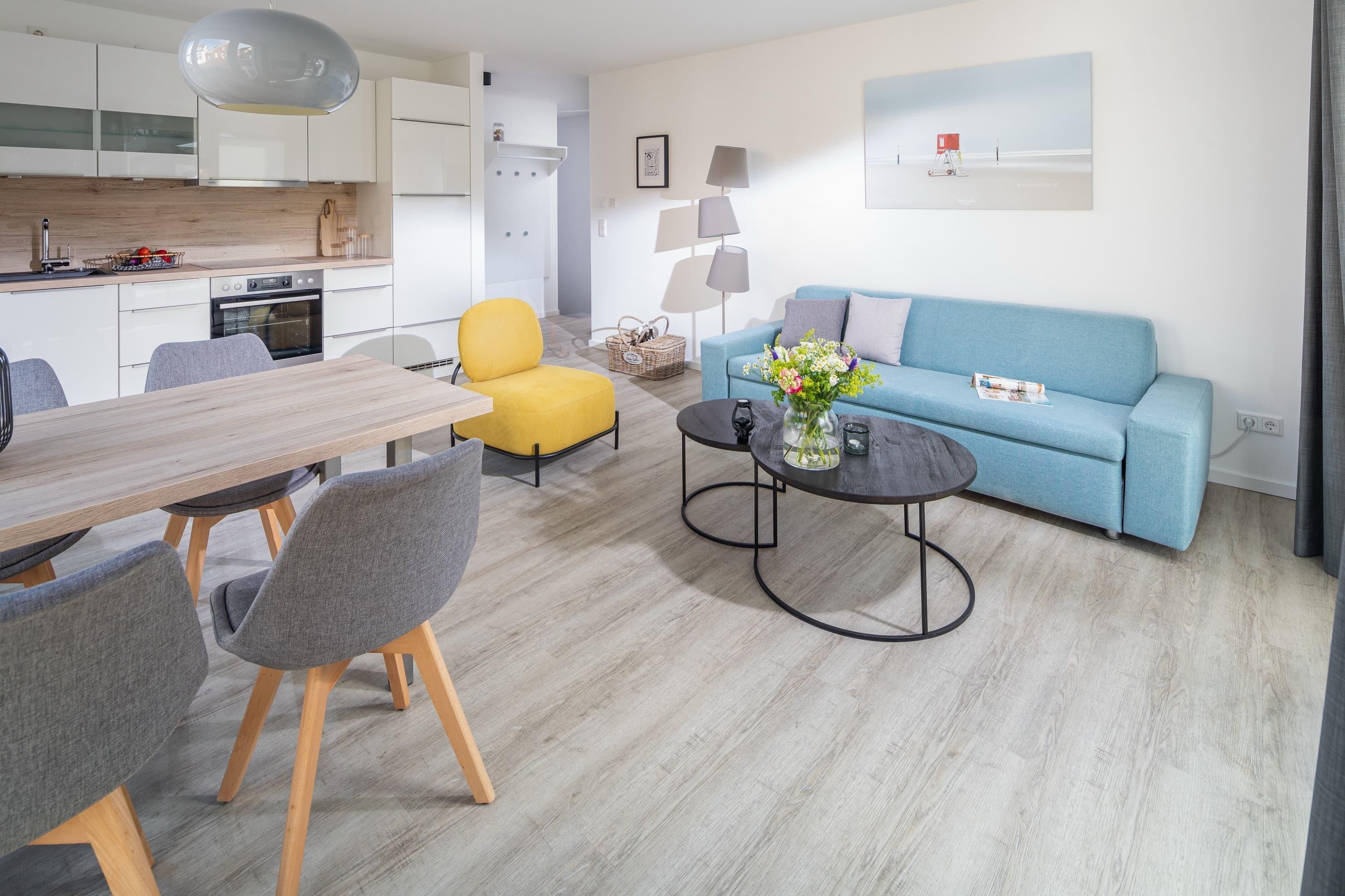 Die Meersuiten sind ein Neubau von 2020, gelegen am Rande der Norderneyer Innenstadt in einer ruhigen Seitenstraße, etwa 400m vom Nordstrand entfernt. Im Haus gibt es insgesamt 7 Wohneinheiten. Die Meersuite N°2 liegt im Erdgeschoss und Souterrain und verfügt im Erdgeschoss über ein Schlafzimmer mit Boxspringbett, ein Badezimmer (ebenerdige Dusche) und einen gemütlichen Wohnraum mit Sofa, Esstisch, offener Küche und Zugang zur Terrasse. Im Souterrain befindet sich das zweite Badezimmer (ebenerdige Dusche) mit Sauna. In dieser Wohnung sind Hunde herzlich willkommen!