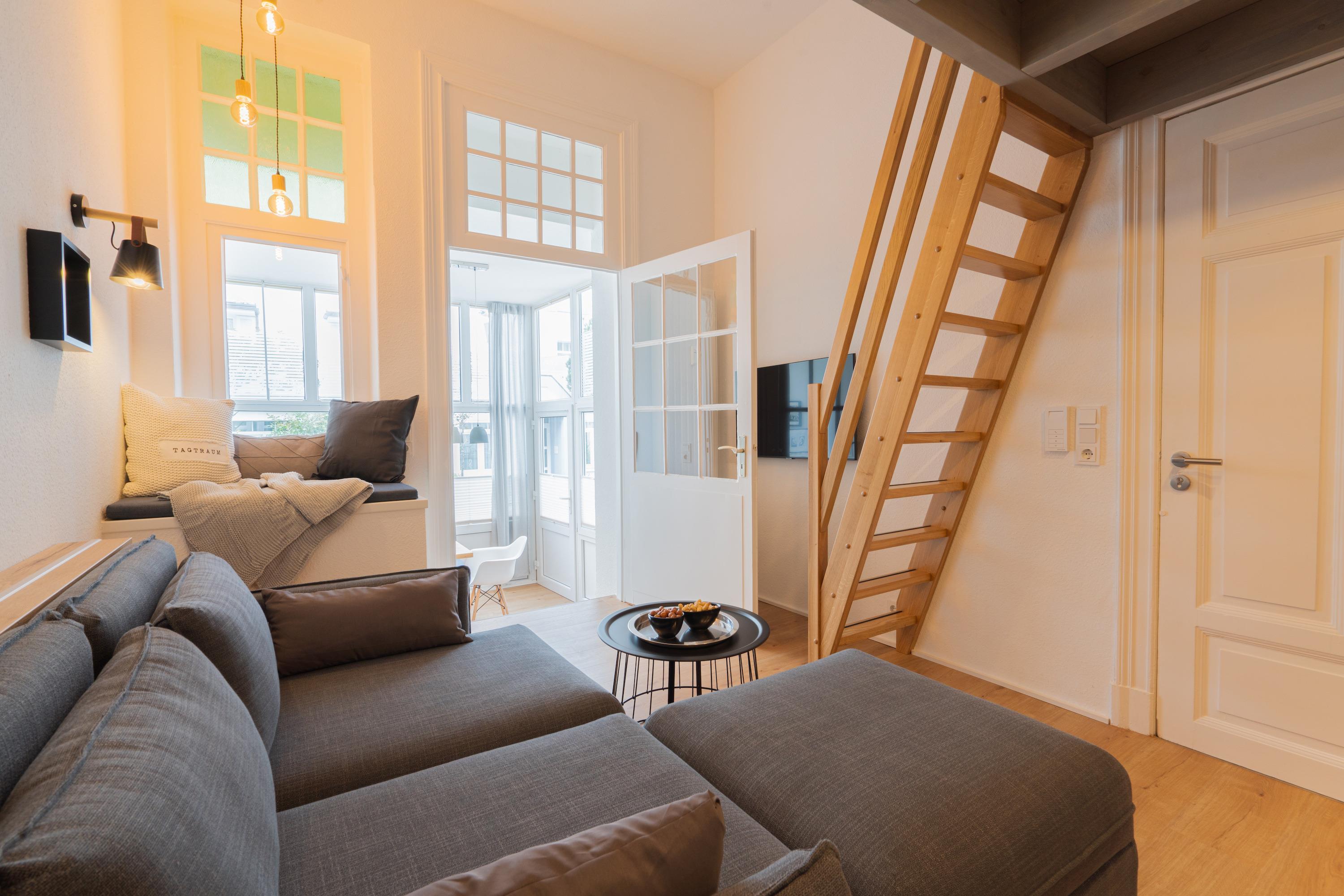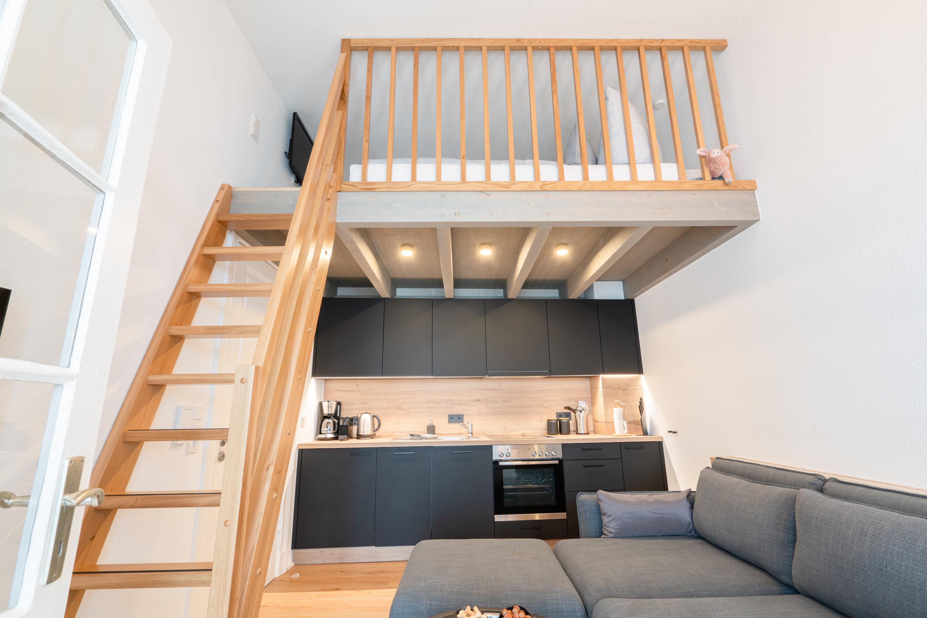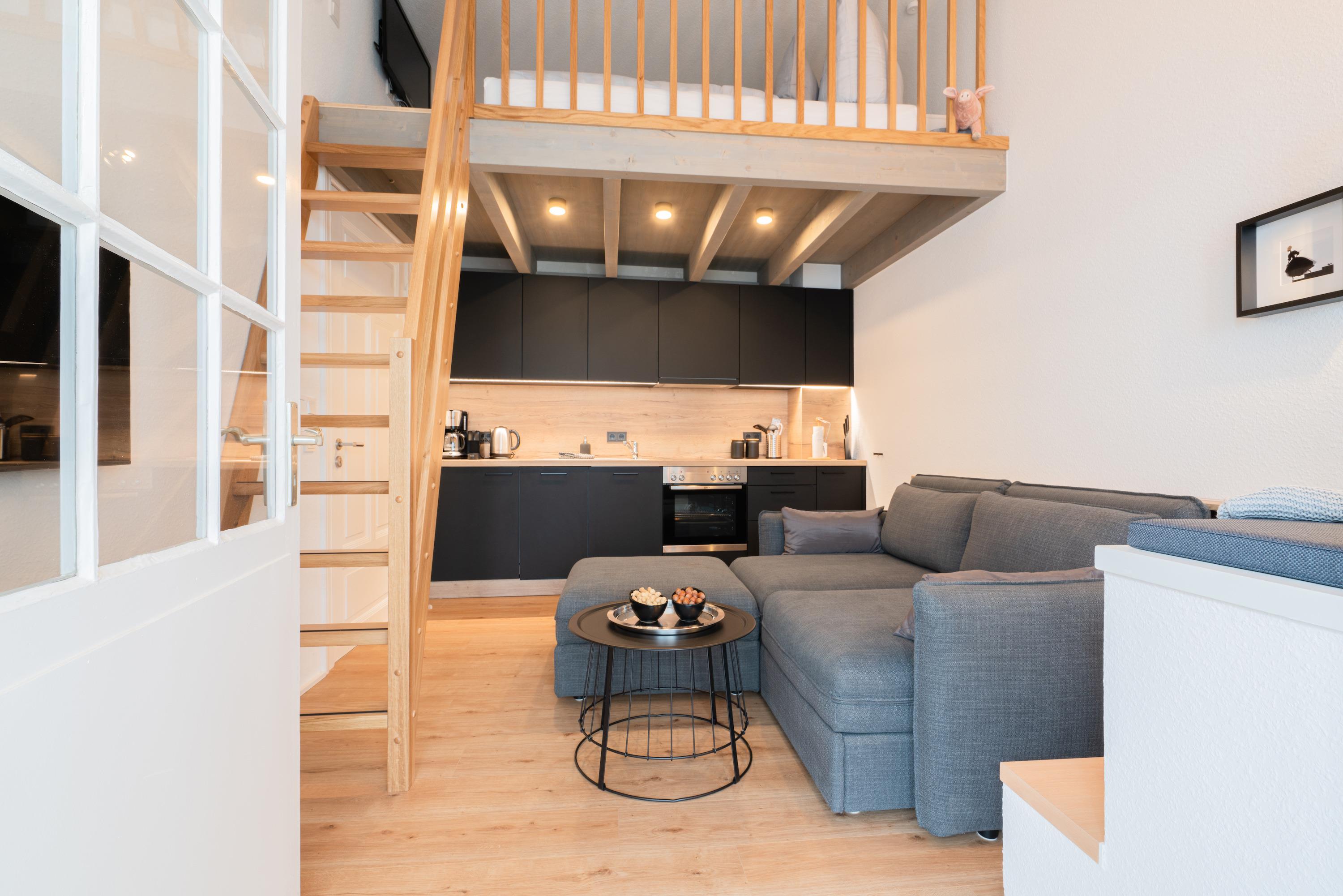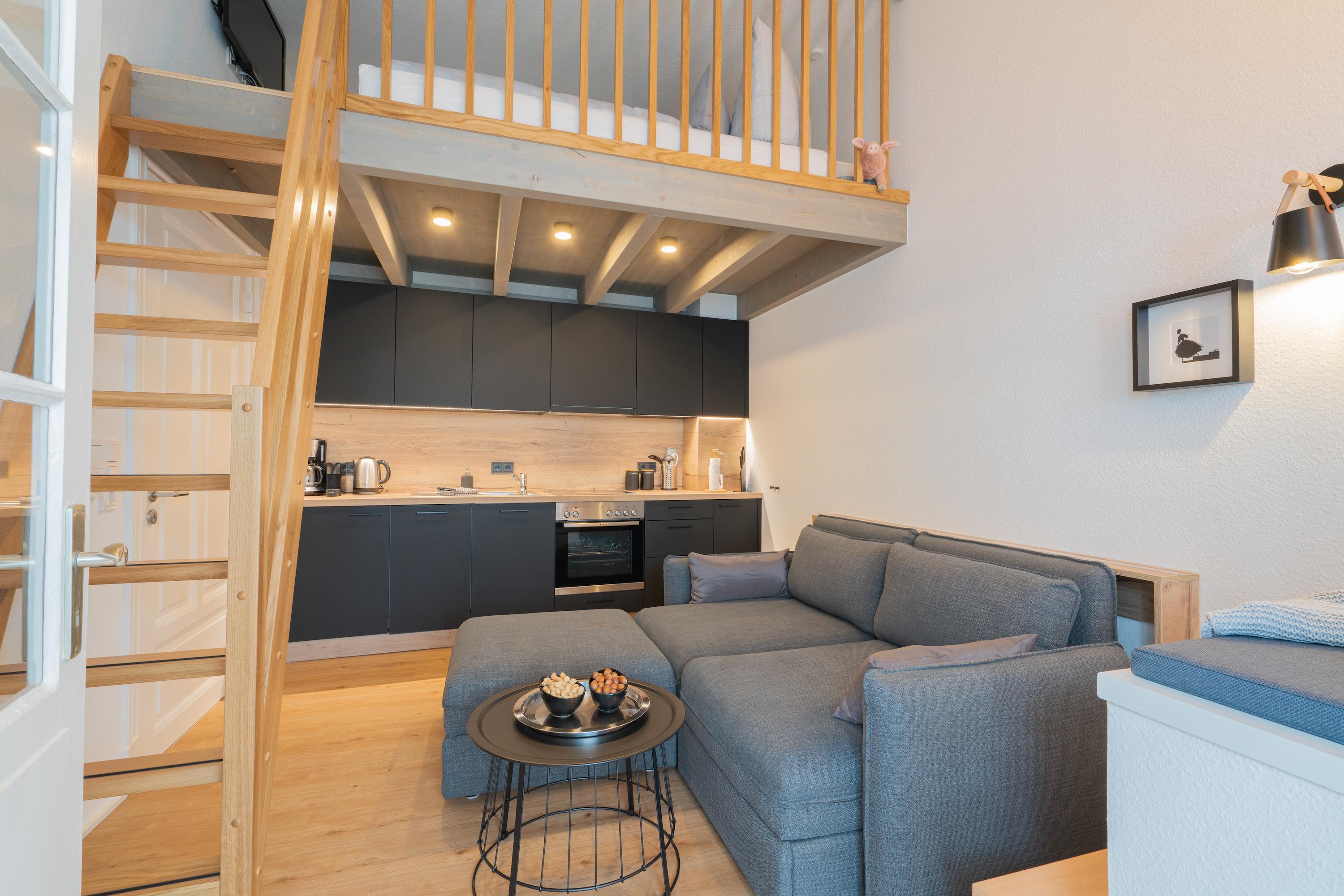Die 42m2 große Ferienwohnung „mein Meerchen“ wurde 2021 komplett saniert. Sie bietet ein gemütliches Urlaubserlebnis auf 4 Ebenen! Hinter der Eingangstür verbirgt sich der gemütliche Wohnbereich mit Couch, TV und angrenzender Küchenzeile. Ein echtes Highlight des Apartements ist das individuell eingebaute Hochbett im Wohnbereich. Zu diesem gelangen Sie über eine feste Treppe (Kinder sollten mindestens 6 Jahre bzw. kletterfest sein). Dort gibt es zwei 80x200cm Matratzen und einen TV für gemütliche Ruhezeiten. Im Wohnbereich ist zudem eine kleine Empore als gemütlicher Lesesitz vor einem innenliegenden Fenster eingerichtet. Vom Wohnbereich geht es über eine Treppe (4 Stufen) in den Erker der Wohnung. Am geräumigen Esstisch kann man gemeinsam essen und durch die Fenster des Treiben auf der Friedrichstraße beobachten. Alternativ kann man natürlich mit geschlossenen Plissees die Zeit einfach „unter sich“ geniessen. Das innenliegende Schlafzimmer erreichen Sie von dort über eine weitere Treppe. Dort gibt es ein Doppelbett (180x200cm) und einen dritten Fernseher. Von diesem Raum abgehend gibt es ein kleines Zimmerchen mit Kleiderschrank und ein klitzekleines Badezimmer – durch die praktische Schiebetür (Spiegel) kann man auf Wunsch einen der beiden Räume schließen. Das kleine, moderne Duschbad bietet Waschbecken und Dusche. Von dort geht eine Tür zum WC mit Abstellraum ab. Durch den ungewöhnlichen Schnitt hat die Ferienwohnung „mein Meerchen“ sehr viel Charme, ist aber eher für Familien mit Kindern oder Freunde, die sich sehr gut kennen, geeignet.