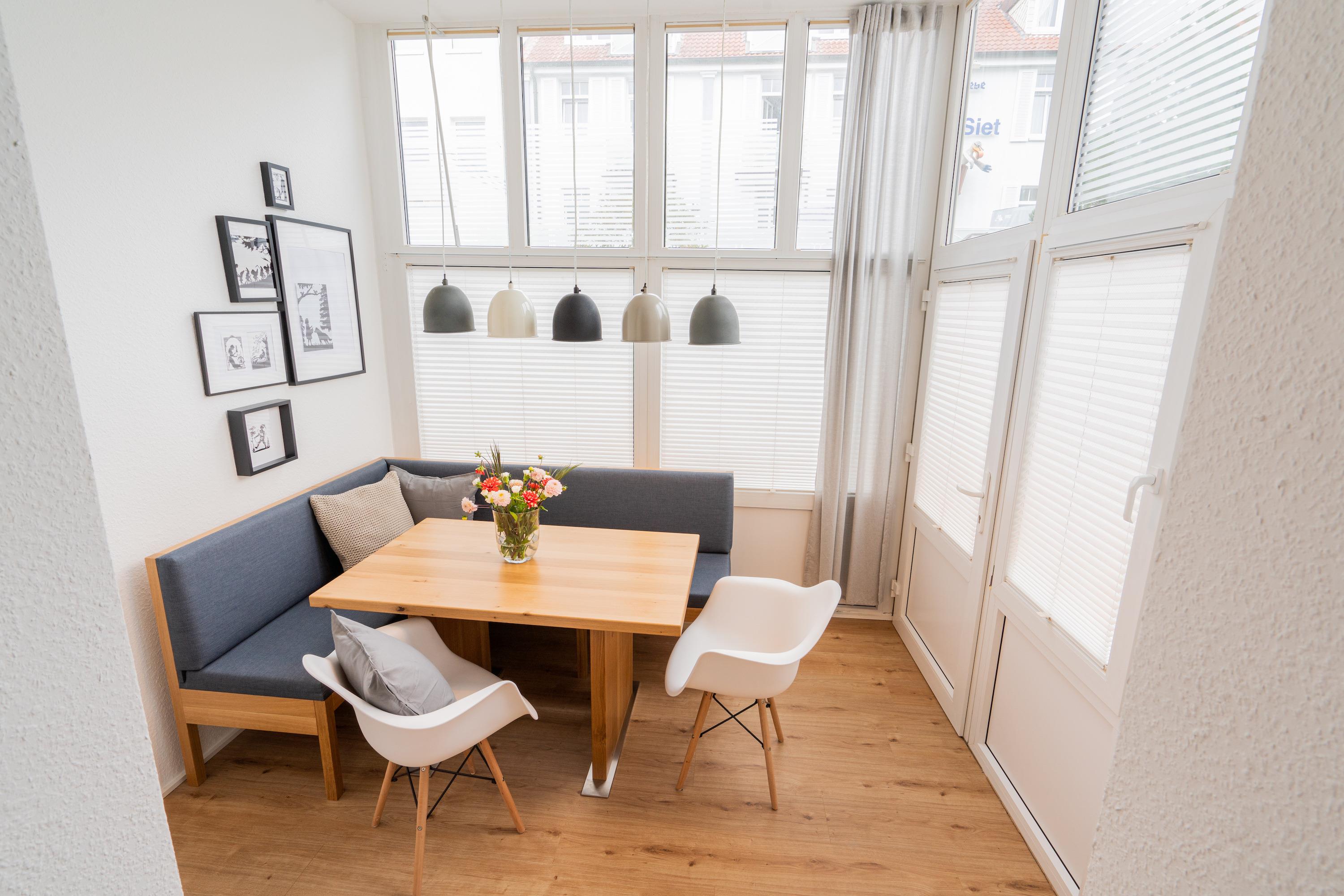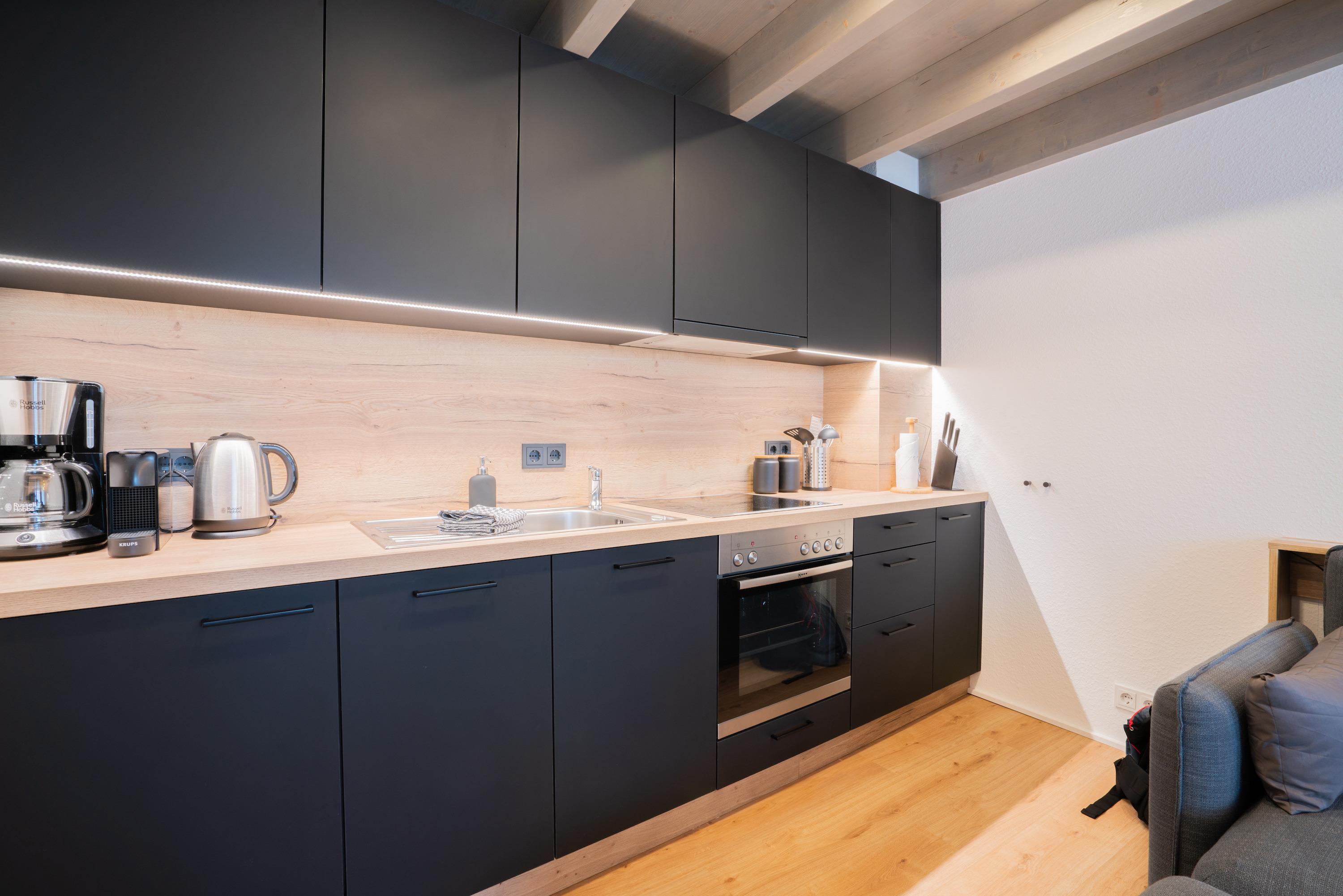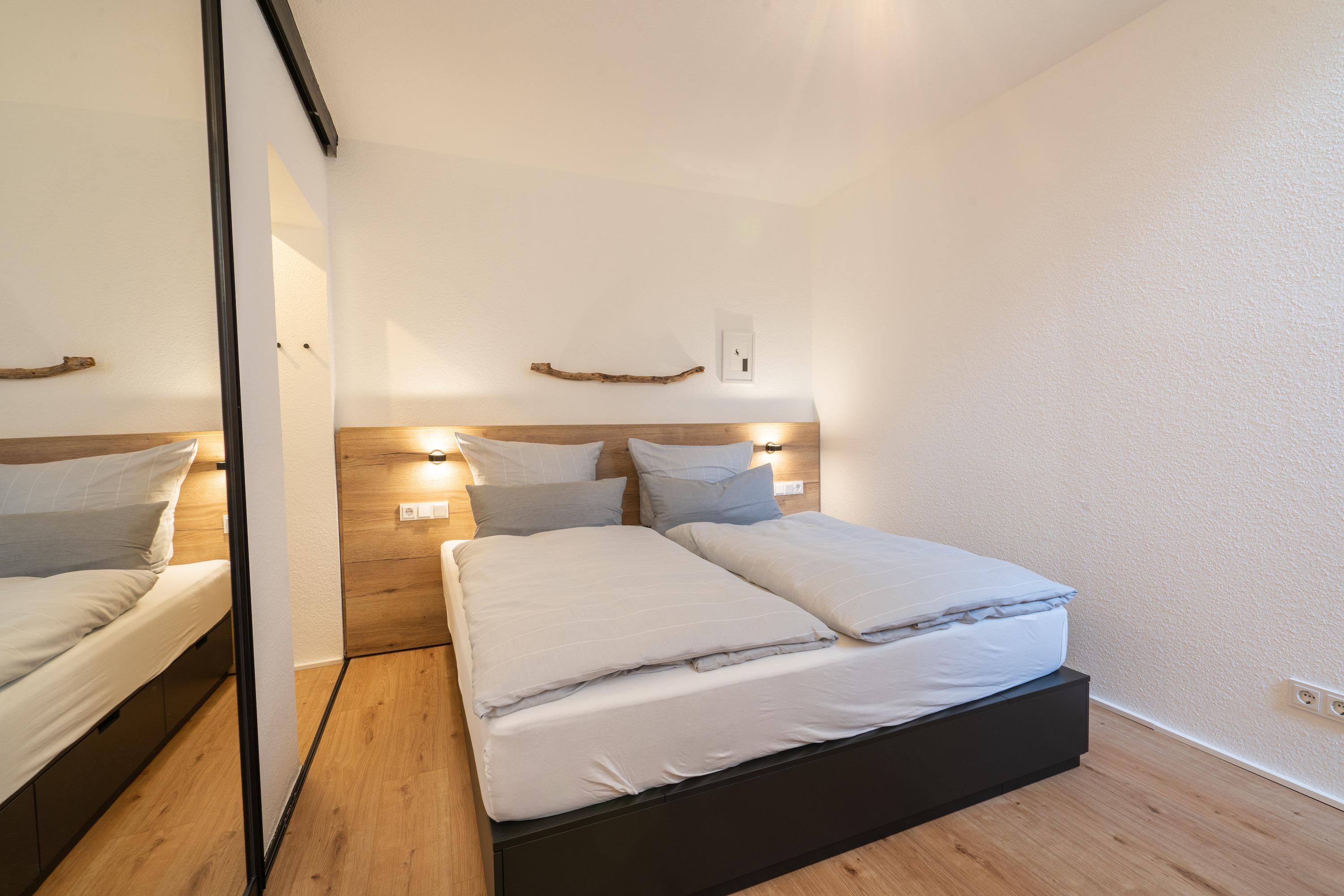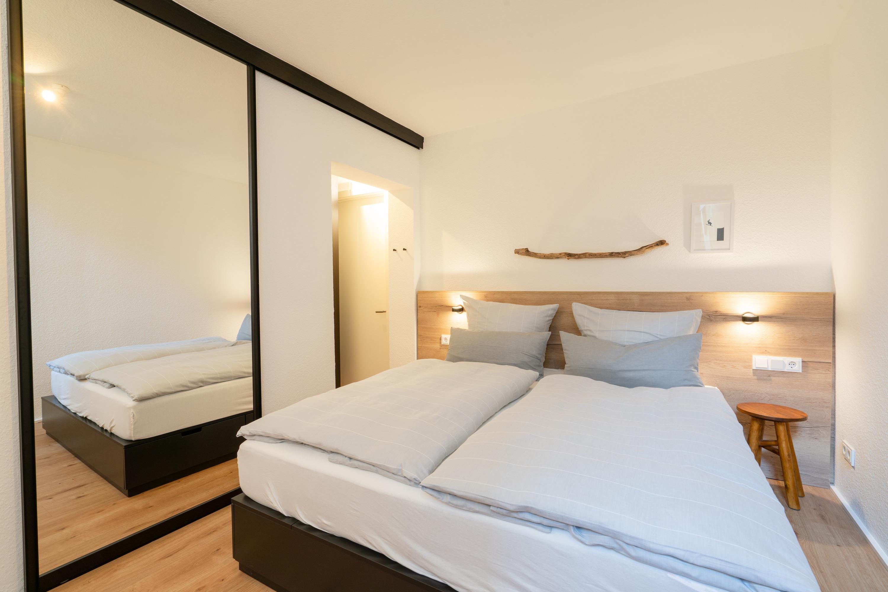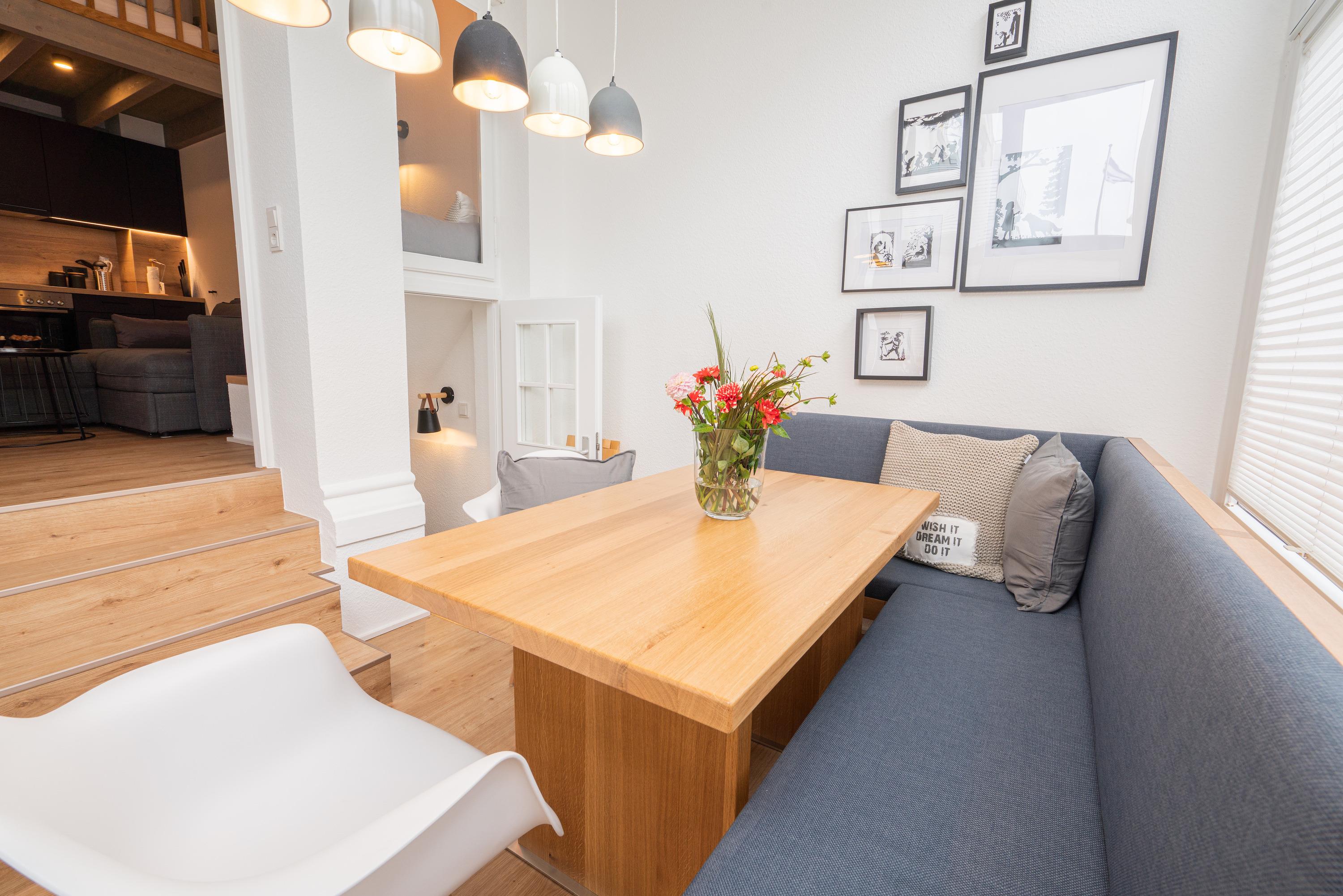 Die 42m2 große Ferienwohnung „mein Meerchen“ wurde 2021 komplett saniert. Sie bietet ein gemütliches Urlaubserlebnis auf 4 Ebenen! Hinter der Eingangstür verbirgt sich der gemütliche Wohnbereich mit Couch, TV und angrenzender Küchenzeile. Ein echtes Highlight des Apartements ist das individuell eingebaute Hochbett im Wohnbereich. Zu diesem gelangen Sie über eine feste Treppe (Kinder sollten mindestens 6 Jahre bzw. kletterfest sein). Dort gibt es zwei 80x200cm Matratzen und einen TV für gemütliche Ruhezeiten. Im Wohnbereich ist zudem eine kleine Empore als gemütlicher Lesesitz vor einem innenliegenden Fenster eingerichtet. Vom Wohnbereich geht es über eine Treppe (4 Stufen) in den Erker der Wohnung. Am geräumigen Esstisch kann man gemeinsam essen und durch die Fenster des Treiben auf der Friedrichstraße beobachten. Alternativ kann man natürlich mit geschlossenen Plissees die Zeit einfach „unter sich“ geniessen. Das innenliegende Schlafzimmer erreichen Sie von dort über eine weitere Treppe. Dort gibt es ein Doppelbett (180x200cm) und einen dritten Fernseher. Von diesem Raum abgehend gibt es ein kleines Zimmerchen mit Kleiderschrank und ein klitzekleines Badezimmer – durch die praktische Schiebetür (Spiegel) kann man auf Wunsch einen der beiden Räume schließen. Das kleine, moderne Duschbad bietet Waschbecken und Dusche. Von dort geht eine Tür zum WC mit Abstellraum ab. Durch den ungewöhnlichen Schnitt hat die Ferienwohnung „mein Meerchen“ sehr viel Charme, ist aber eher für Familien mit Kindern oder Freunde, die sich sehr gut kennen, geeignet.