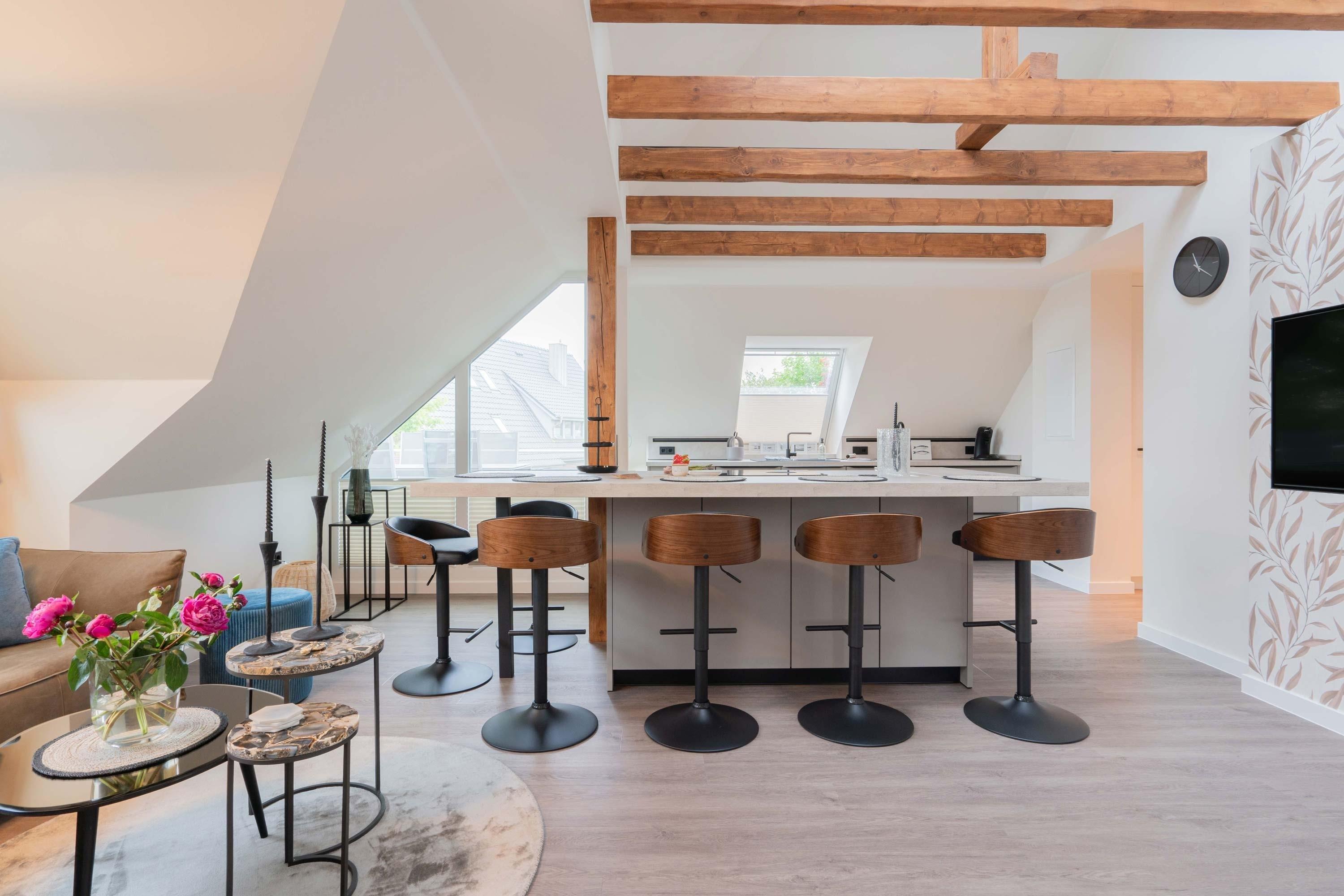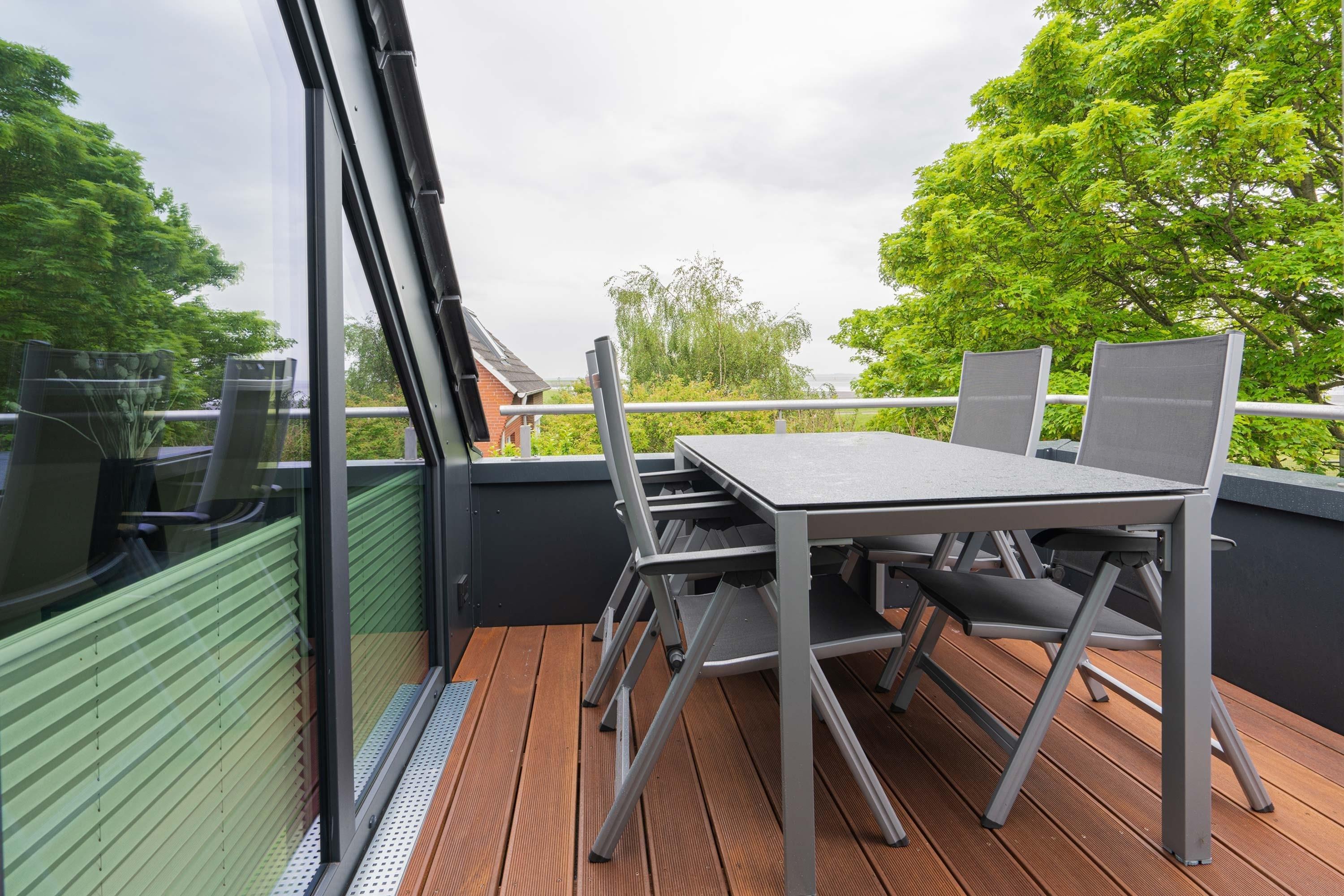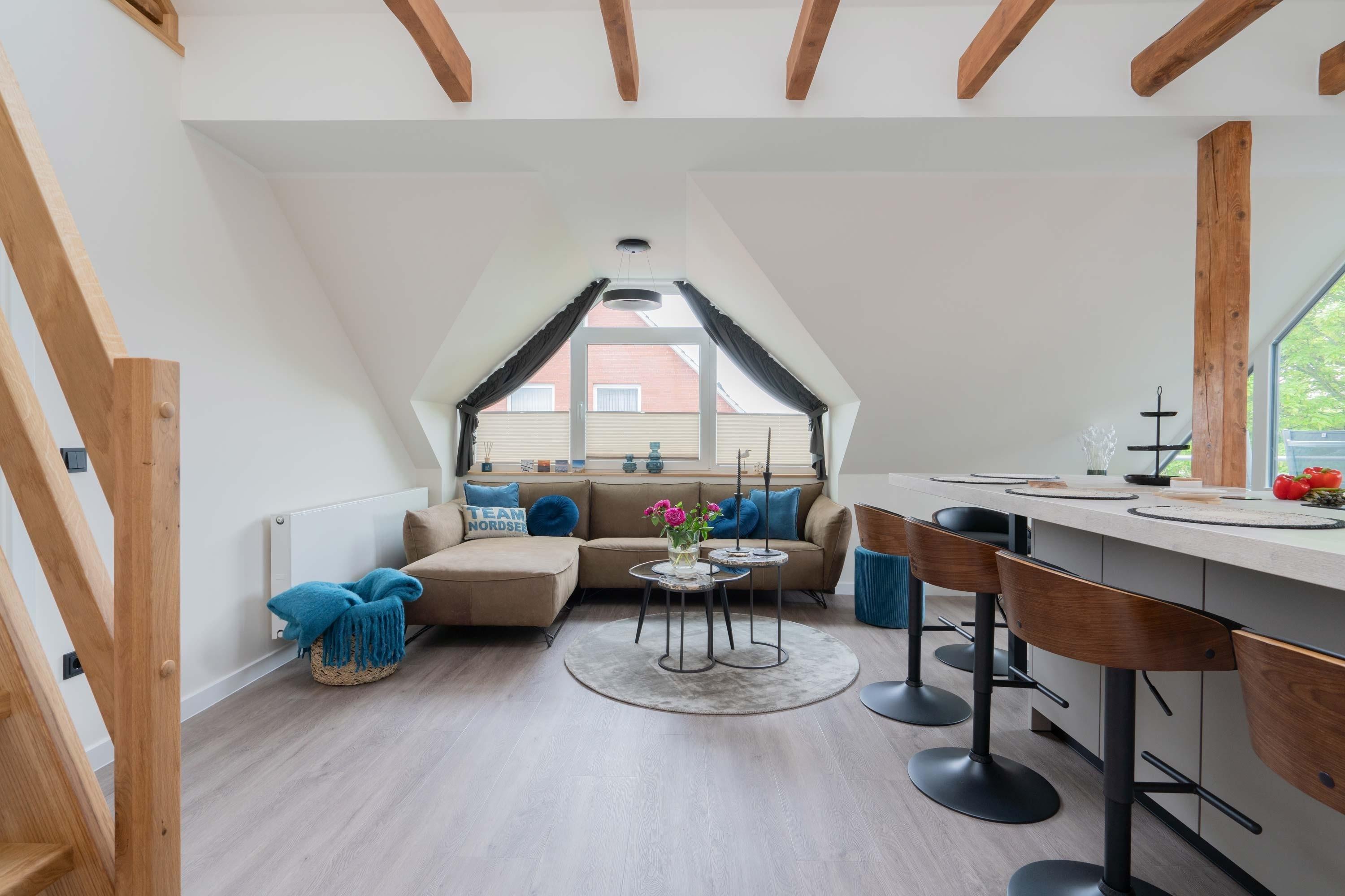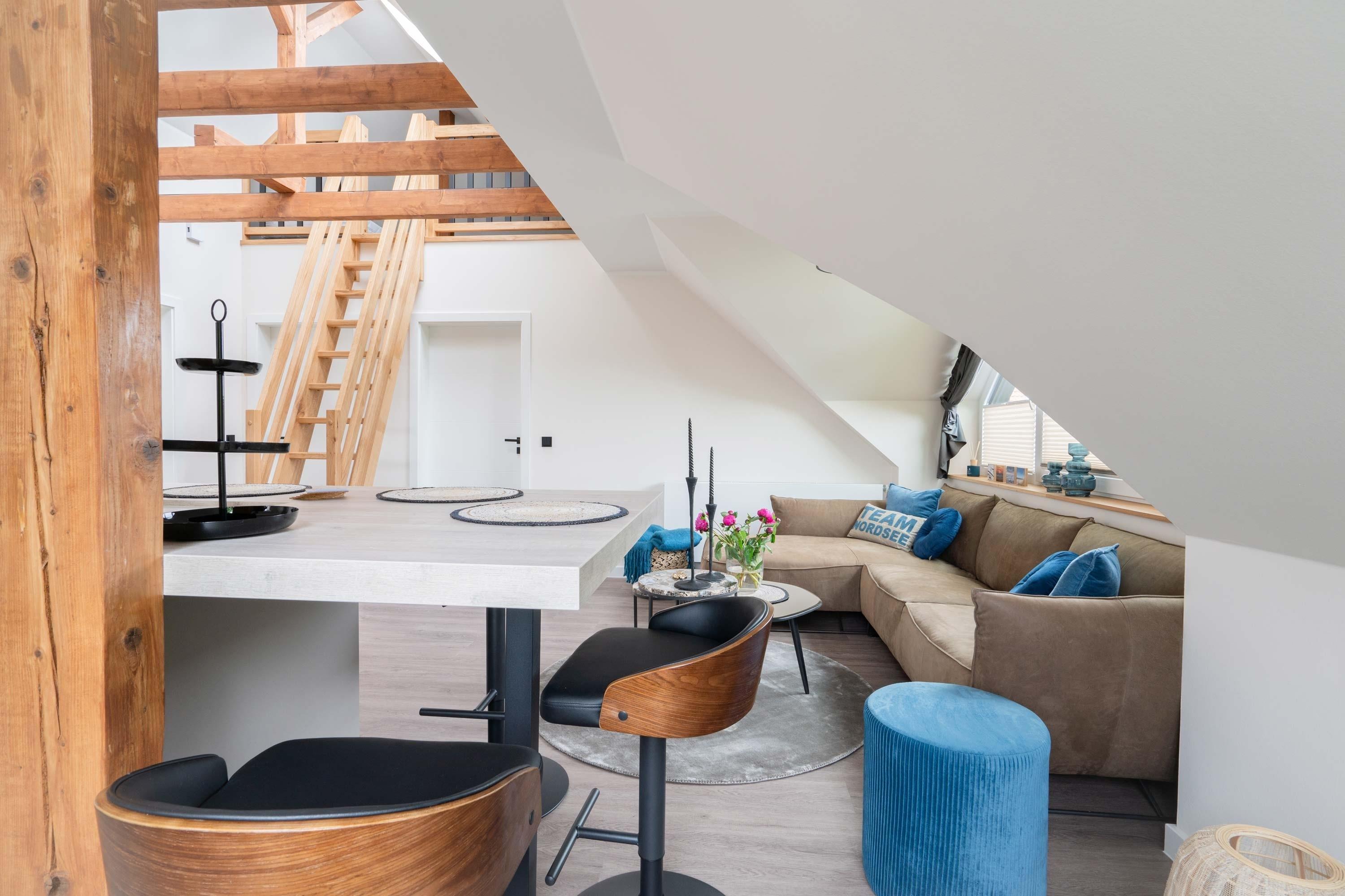Die 70qm große Ferienwohnung "Neywatt 1“ wurde 2022 komplett neugestaltet. Sie liegt ruhig und grün im Fischerhafen, nahe der Surferbucht. Vom Balkon aus haben Sie einen schönen Blick ins Grüne und auf das Wattenmeer. Im Wohnbereich besticht die Wohnung mit ihrer Großzügigkeit und einer sehr geräumigen Wohnküche. An der gut ausgestatteten Kochinsel können köstliche Mahlzeiten zubereitet werden und dort direkt gemeinsam genossen werden. Entspannung danach bietet die liebevoll gestaltete, gemütliche Sofaecke. Die zwei großzügigen Schlafräume sind jeweils mit einem Doppelbett (180cm) und TV ausgestattet. Einen zusätzlichen Schlafplatz für eine weitere Person gibt es im Giebel des Wohnraums. Das Duschbad bietet neben der Regendusche eine eigene Waschmaschine (kostenpflichtig) und einen Trockner (kostenpflichtig). Vor dem Haus steht Ihnen ein PKW-Stellplatz zur Verfügung.
