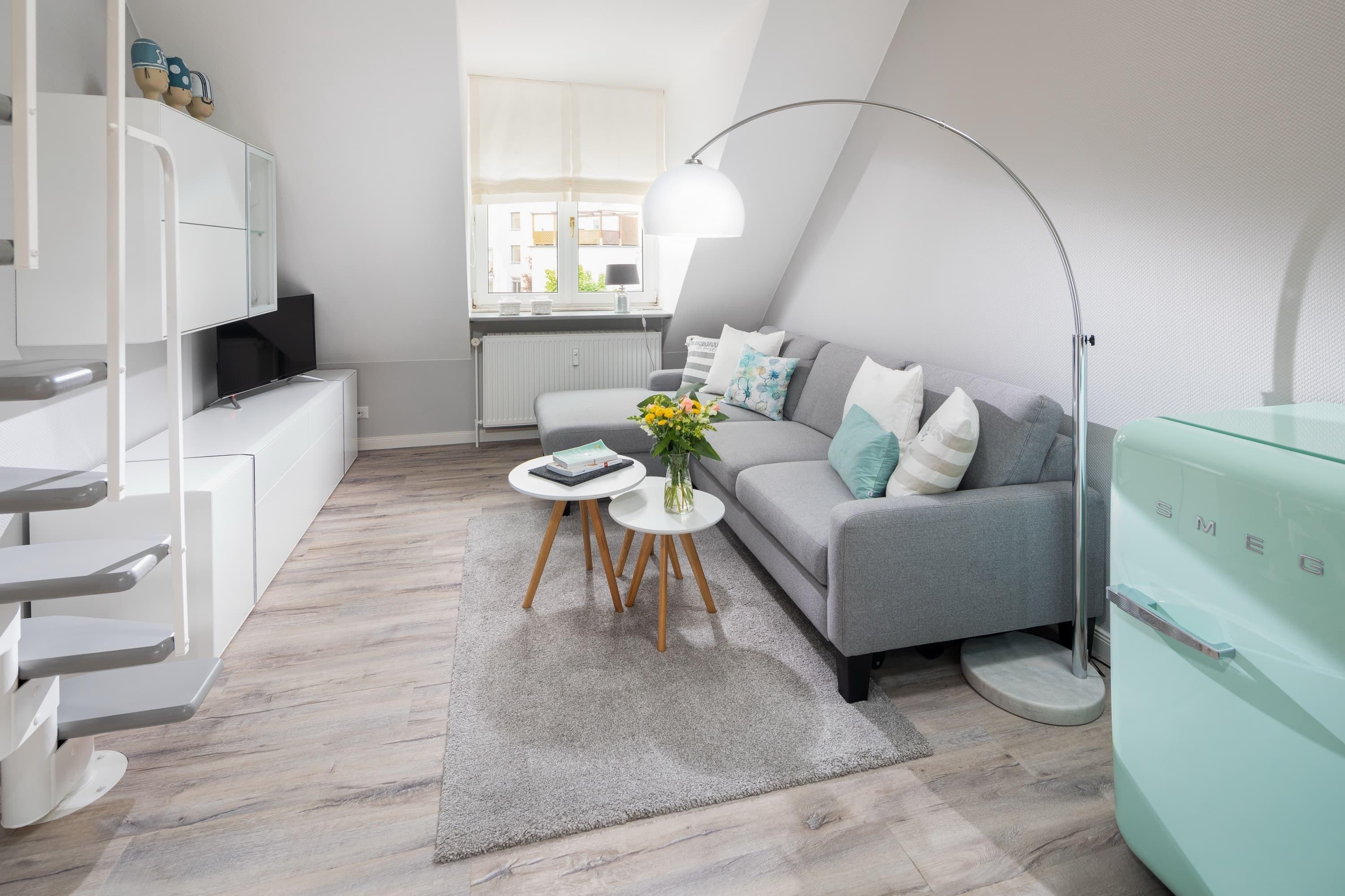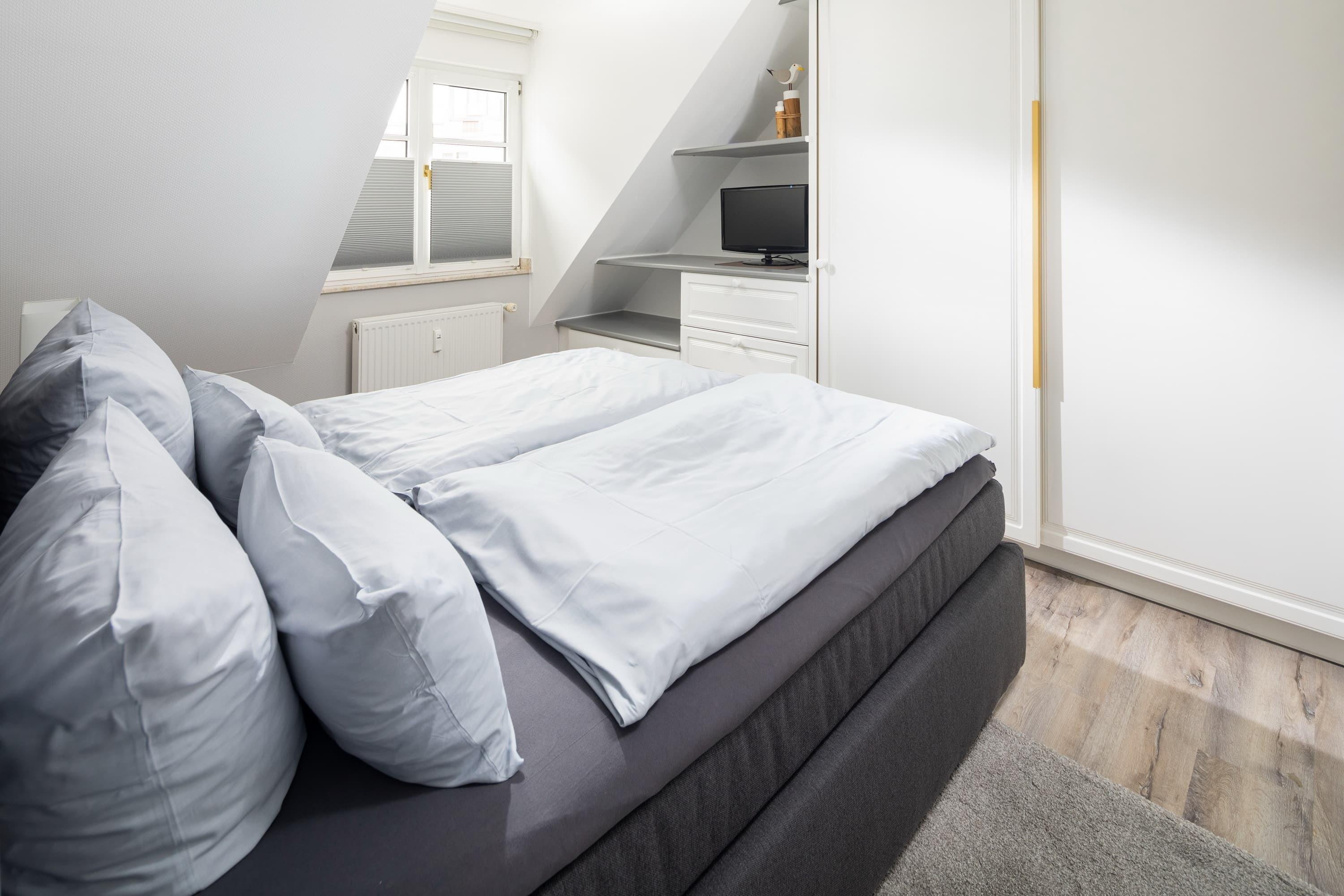 Die gemütliche Wohnung liegt in der Friedrichstraße, nur 50m von der Nordsee und der beliebten Milchbar entfernt und wurde Anfang 2020 saniert. Auf 42qm bietet sie Platz für bis zu 4 Personen. Im Wohnzimmer finden Sie neben der gemütlichen Couch auch einen Esstisch für 4 Personen und eine Küchenzeile. Über eine Platzspartreppe gelangen Sie ausserdem in das Highlight der Wohnung – den gemütlichen Schlaf- oder Spielgiebel. Hier ist neben dem 1,40m breiten Bett Platz zum Entspannen oder Spielen. Das separate Schlafzimmer hat ein Doppelbett und reichlich Stauraum im Kleiderschrank. Auch dort finden Sie einen TV. Das Badezimmer ist weiß gefliest und hat eine Dusche. Perfekter Ausgangspunkt für einen Urlaub zu zweit oder eine kleine Familie. Die Wohnung ist beschränkt für die Nutzung von 3 Erwachsenen oder alternativ 2 Erwachsenen und 2 Kindern.