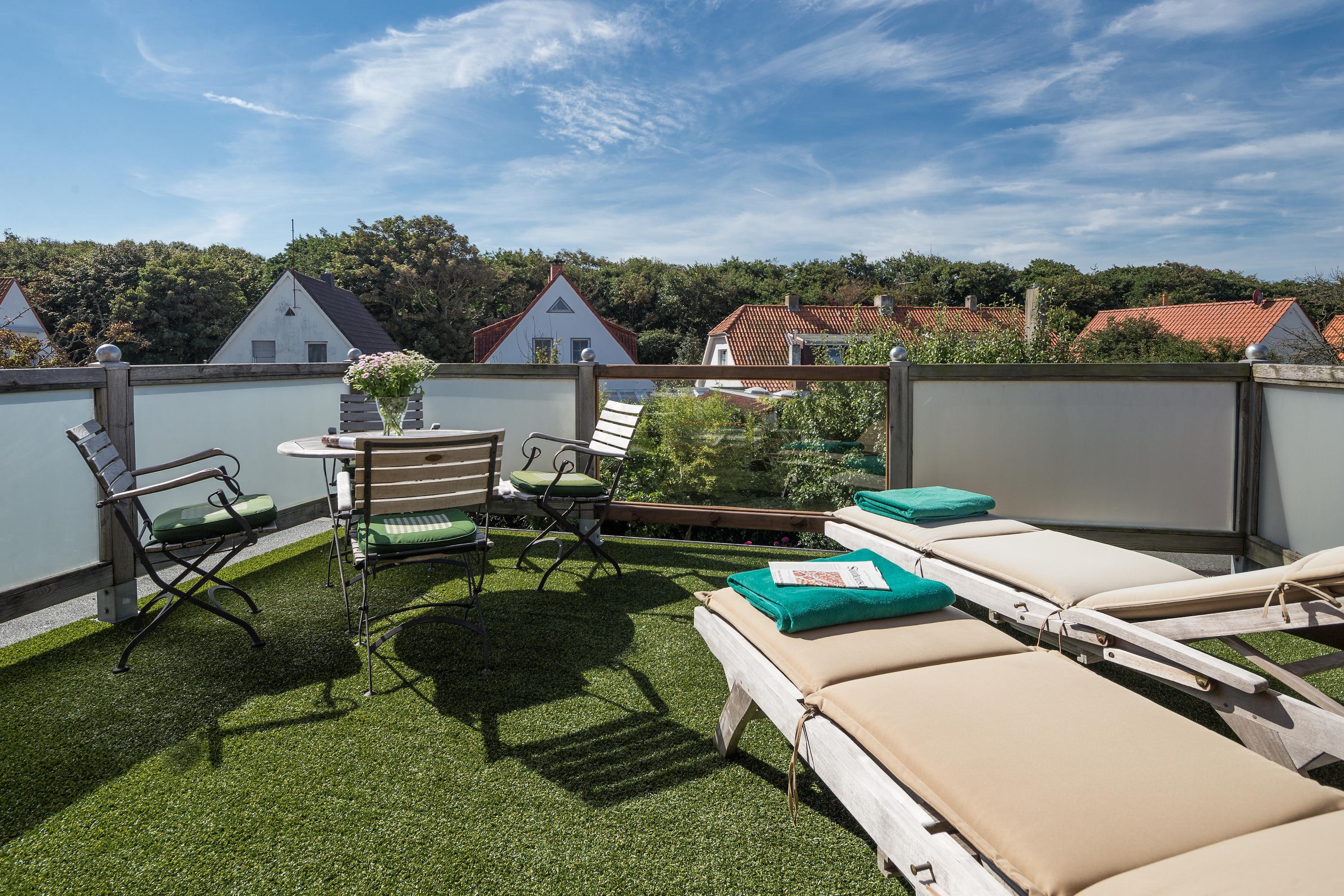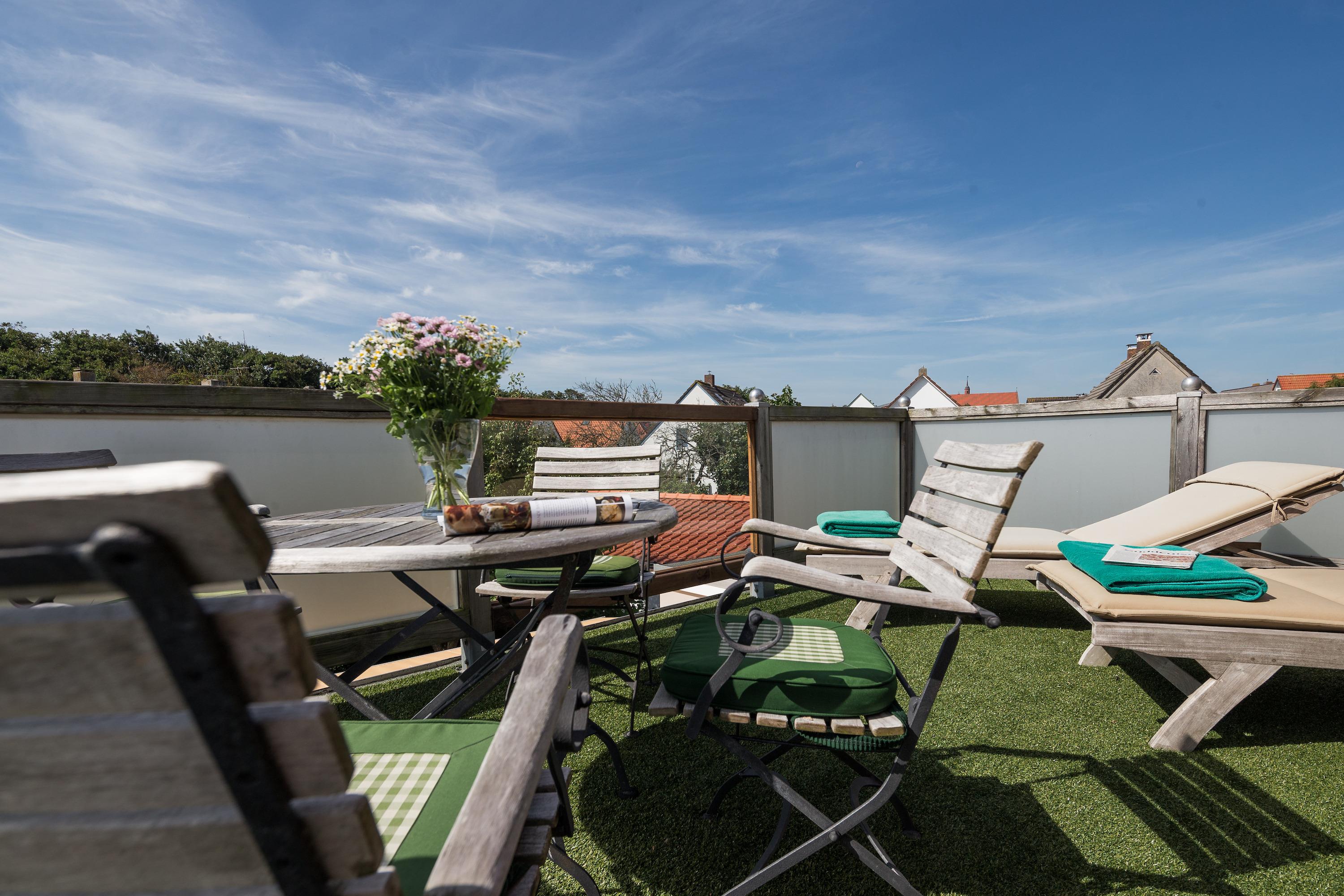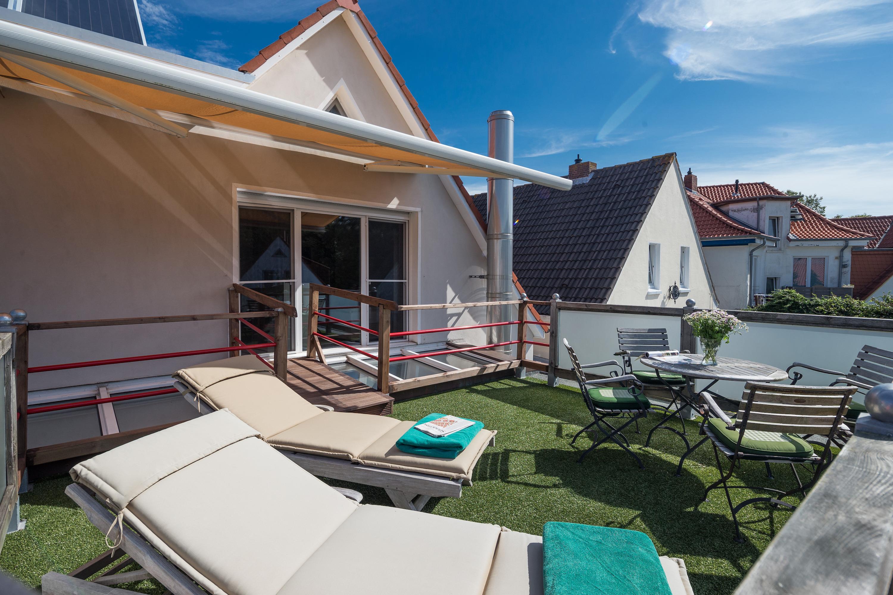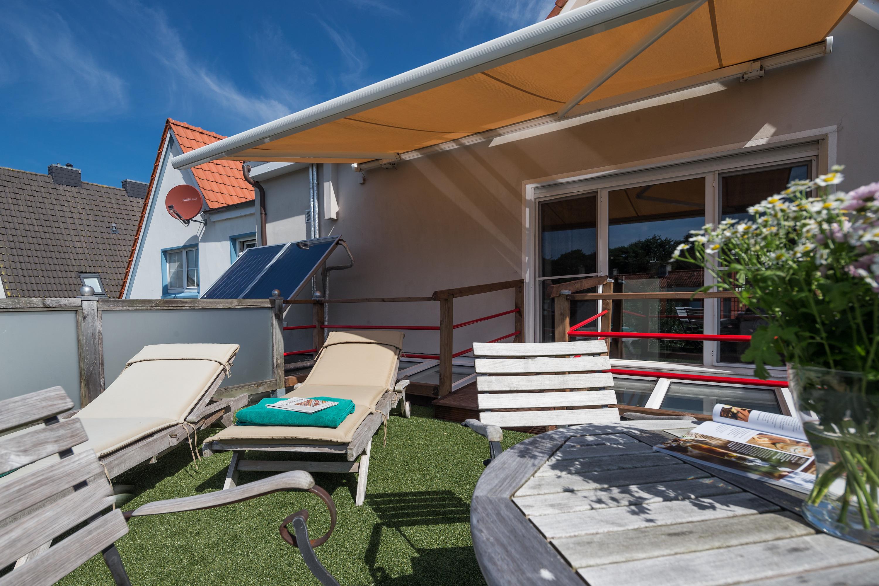 Herzstück der Wohnung ist der offene Wohn- und Essbereich, in dem sich ein hochwertig ausgestatteter Küchenbereich mit Induktionsherd, amerikanischer Theke und direktem Zugang zur 18 Quadratmeter großen Dachterrasse befindet. Ob entspanntes Frühstück in der Morgensonne oder ein Sundowner mit Blick über die Dächer Norderneys – die Sitzgruppe, Sonnenliege und Markise machen diese Terrasse zu Ihrem Lieblingsplatz.