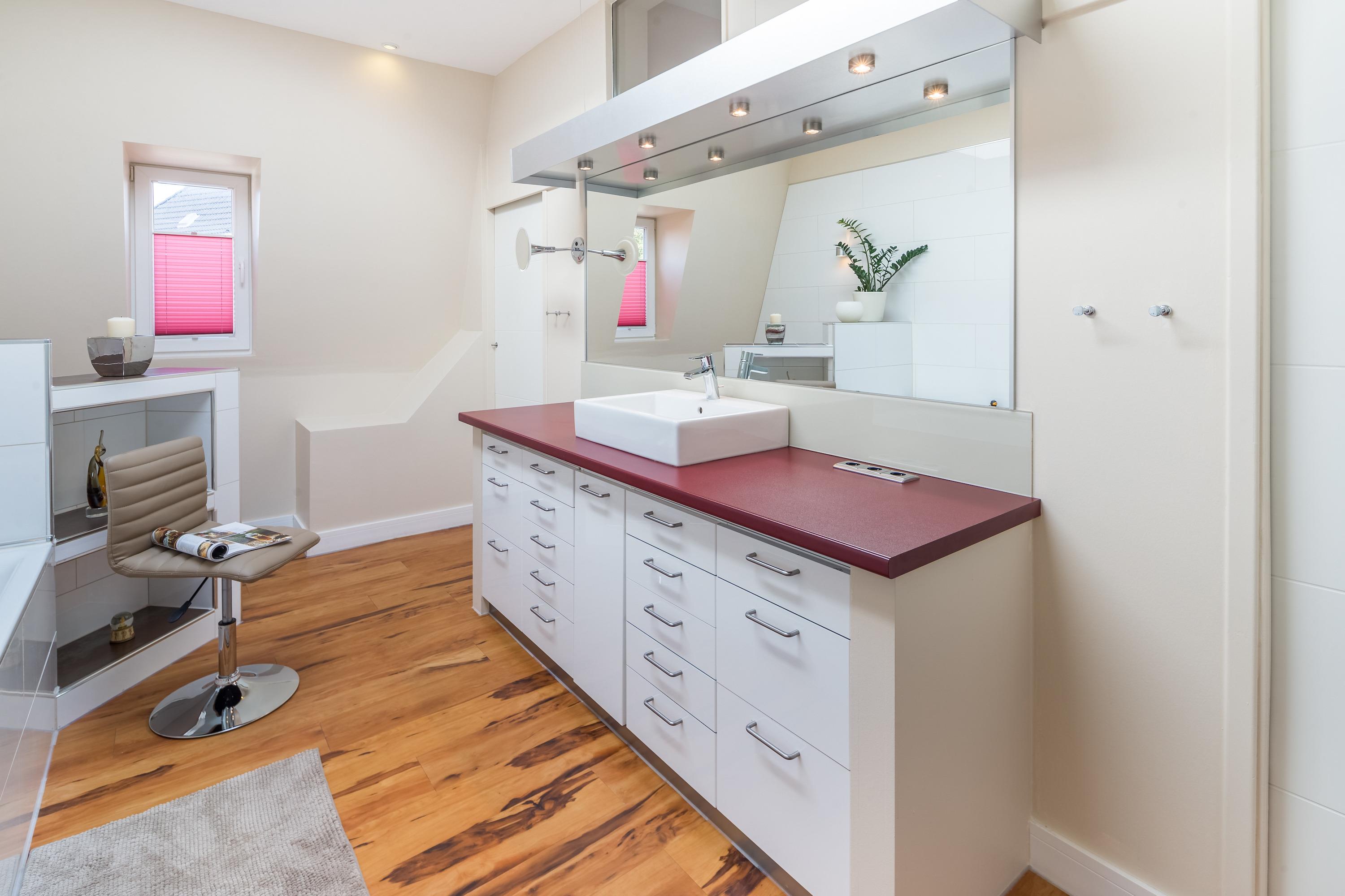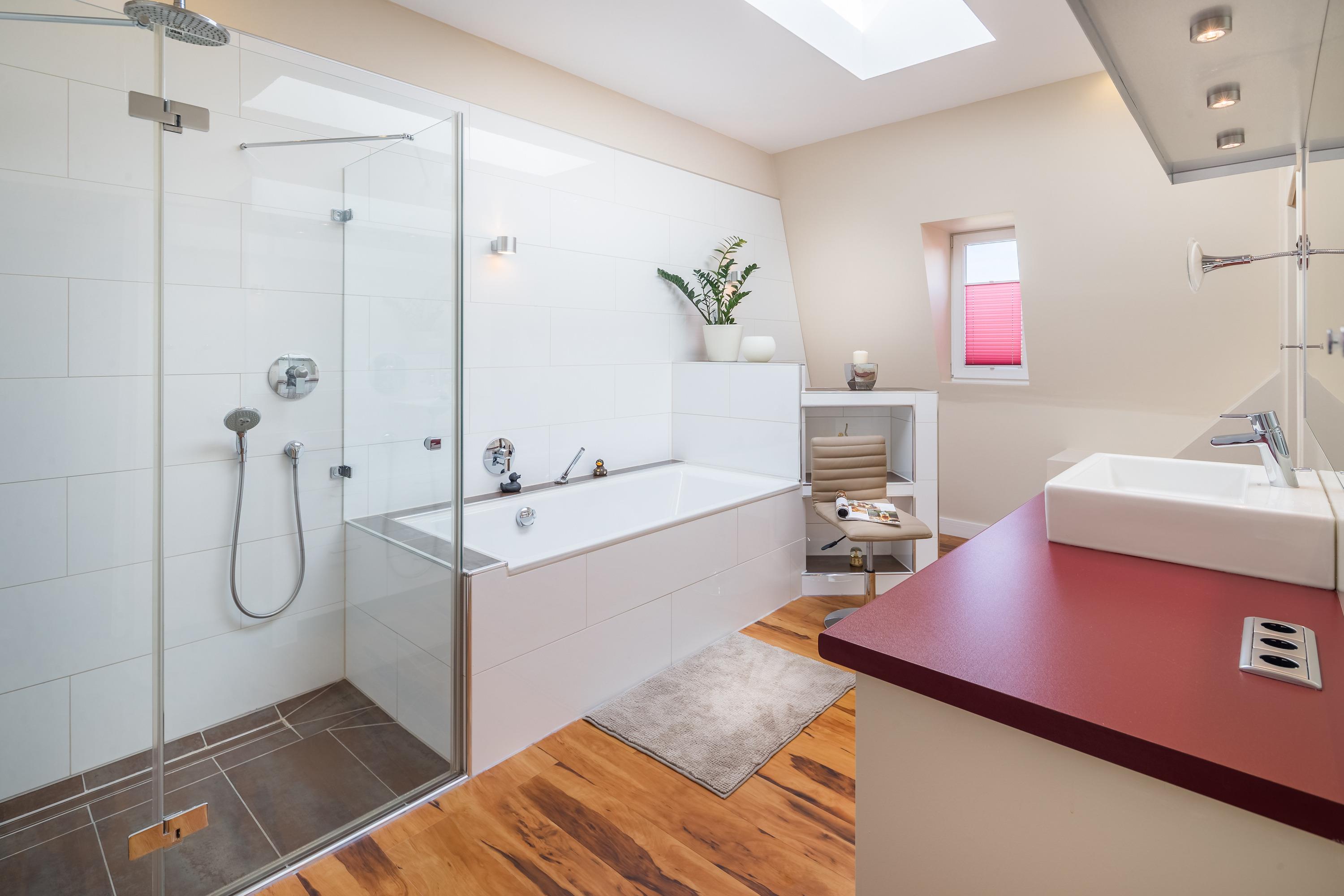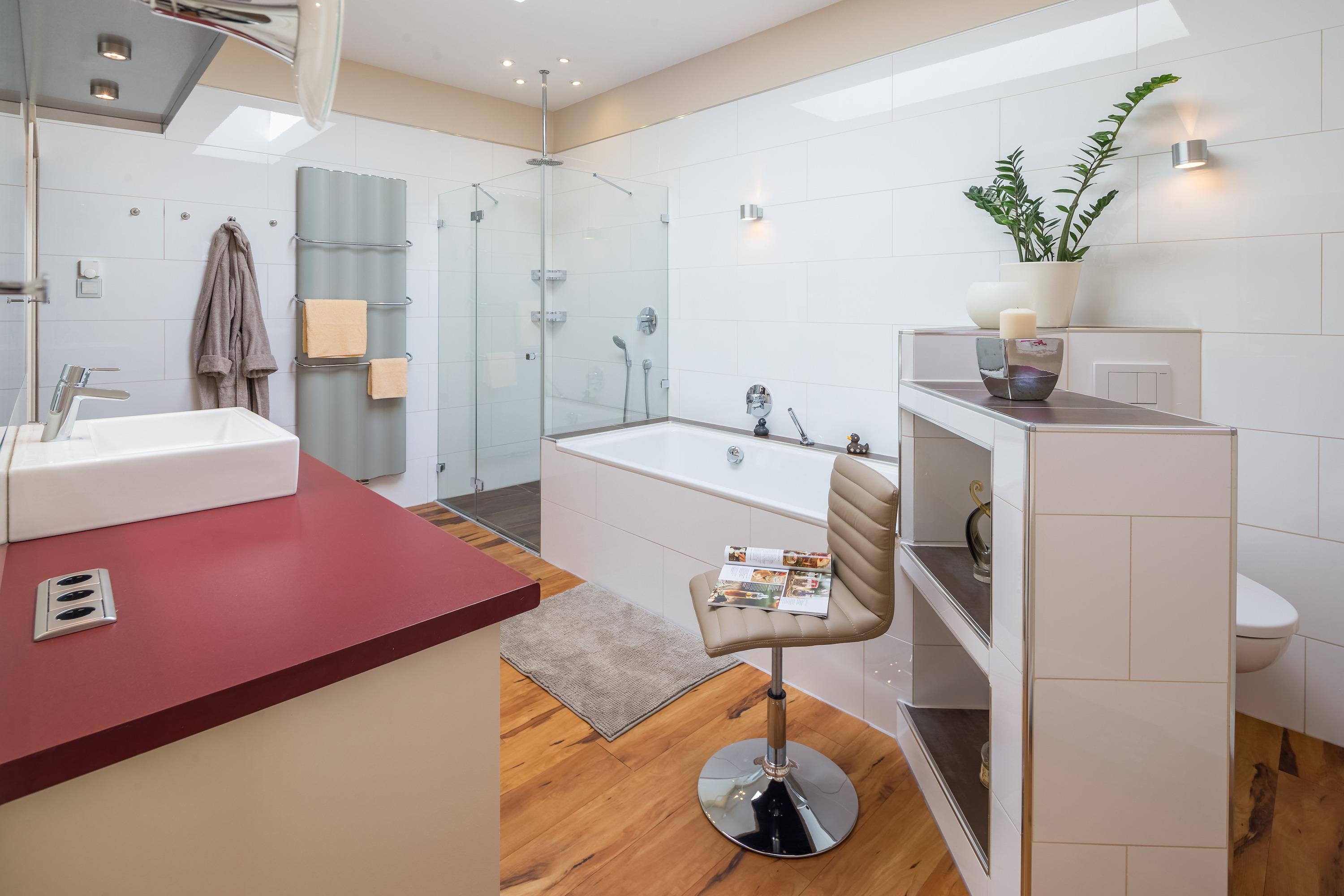 Das moderne Badezimmer überzeugt mit Dusche, Badewanne und einem großzügigen Schminkbereich. Besonders praktisch: ein begehbarer Kleiderschrank, in dem Sie Ihre Urlaubsgarderobe bestens unterbringen können.