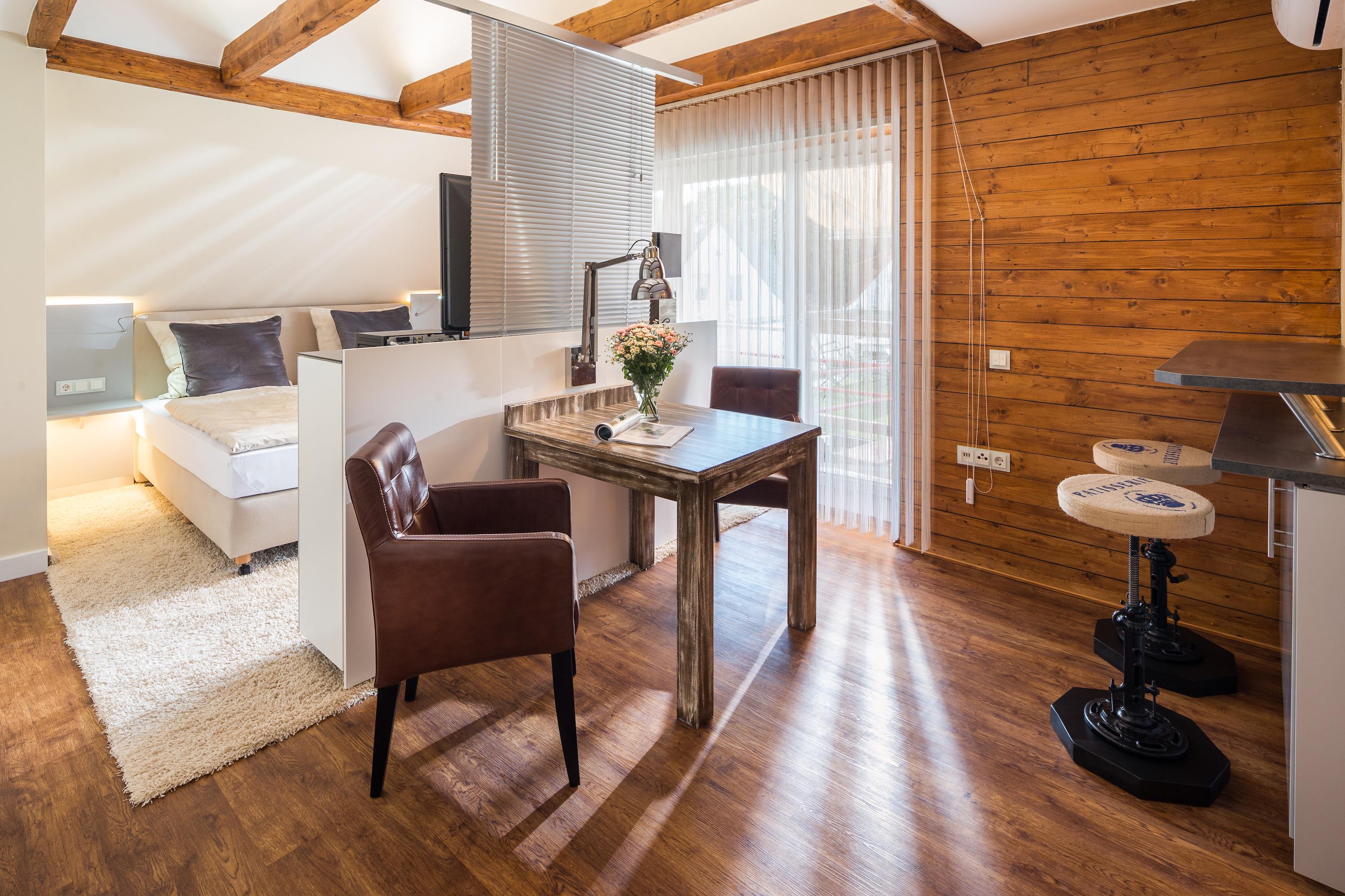 Im Schlafzimmer mit gemütlichem Doppelbett finden Sie Ruhe und Erholung. Für zusätzliche Gäste oder entspannte Lesestunden steht im Wohnzimmer eine komfortable Schlafcouch bereit. Der stilvolle Wohnraum lädt mit kuscheligen Sitzgelegenheiten, Smart-TV und viel Licht zum Relaxen oder zu einem gemütlichen Fernsehabend ein.