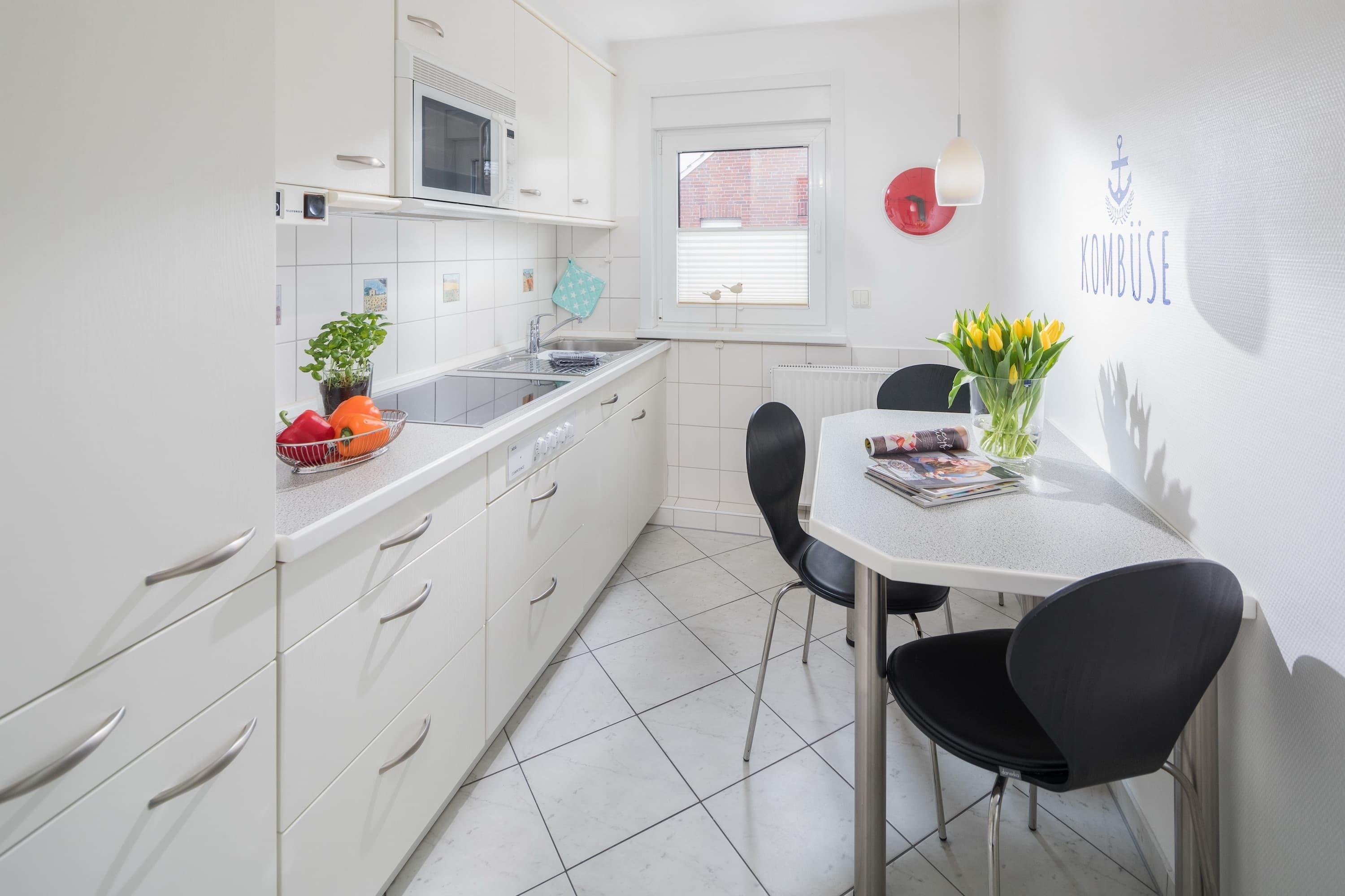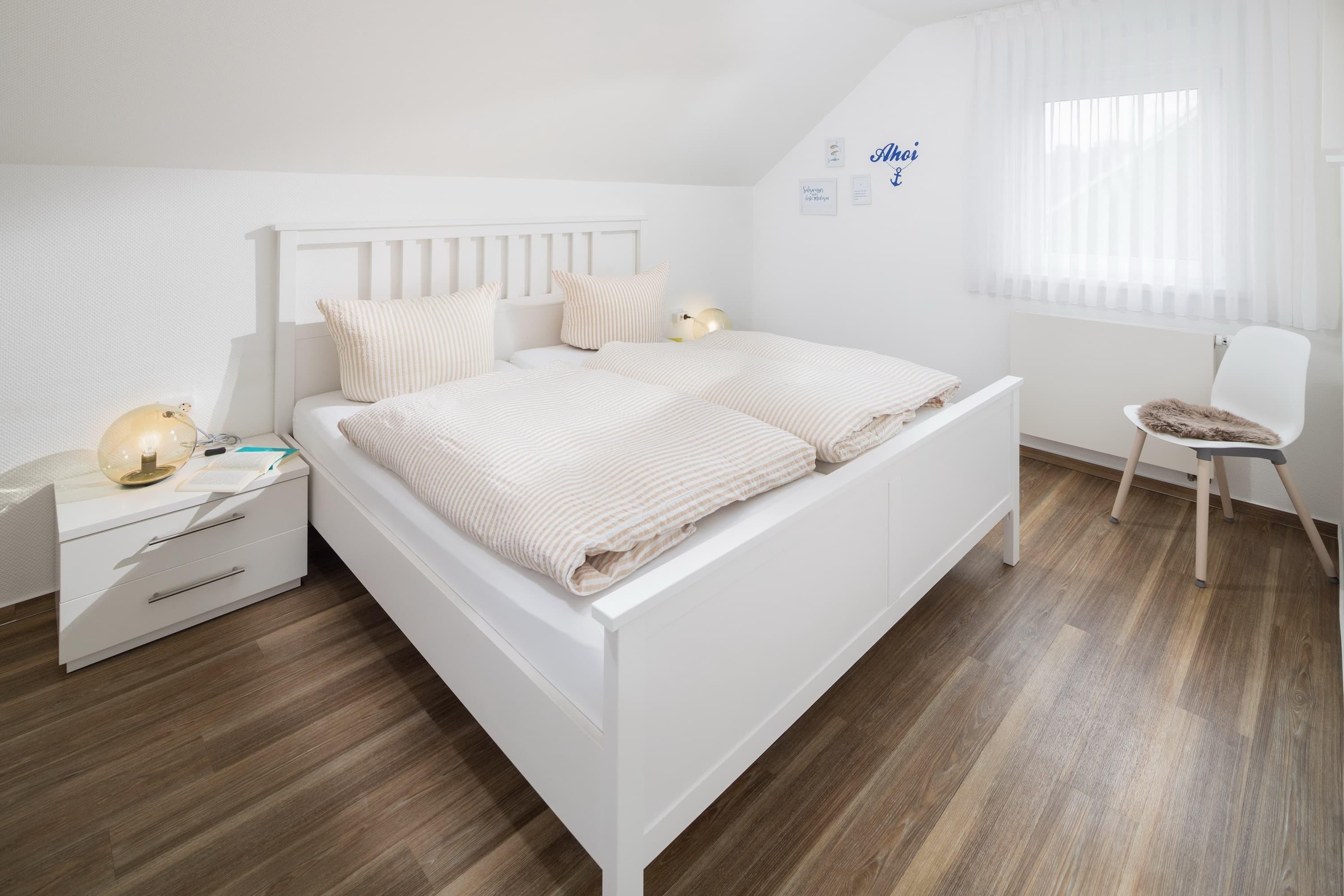 Die Ferienwohnung für 2-3 Personen befindet sich in ruhiger und grüner Lage in der Nordhelmsiedlung – gelegen zwischen Kiefernwäldchen und Nordstrand. Die ca. 60qm große Wohnung liegt im 01. Stock eines Einfamilienhauses. Sie verfügt über einen modernen Wohnbereich mit großzügigem, Südwest-Balkon (Blick in den Garten). Hier können Sie es sich zum Essen im Schatten unter der elektrischen Markise gemütlich machen oder sich auf den Sonnenliegen entspannen. Im Wohnzimmer finden Sie einen Fernseher mit Kabel-TV und eine Stereo-Anlage. WLAN steht Ihnen kostenfrei zur Verfügung. Die Küche verfügt über alle Standard-Elektrogeräte, eine Spülmaschine, Herd mit Ceran-Kochfeld, Mikrowelle und einen Esstisch. Das große, weiß geflieste Duschbad verfügt über ein Fenster. Das Schlafzimmer bietet neben einem geräumigen Schrank ein Doppelbett (180cm x 200cm). Zusätzlich zum Schlafzimmer gibt es noch ein Doppel-Schrankbett im Wohnzimmer.