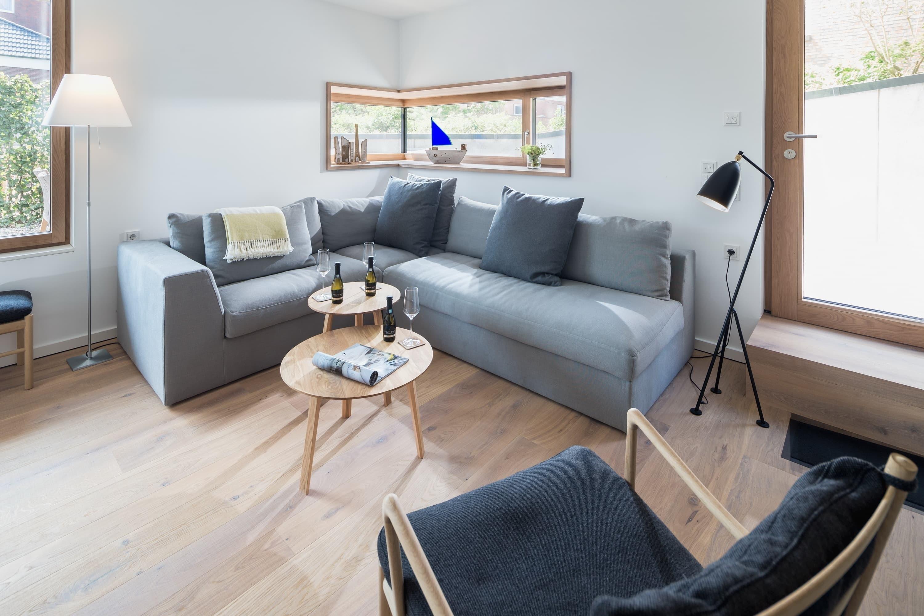 Die Ferienwohnung "sonnenBlick" ist eine exklusiv ausgestattete Terrassenwohnung mit 85qm für bis zu vier Personen. Ausgestattet mit einem großzügigen Wohn- und Essbereich mit offener Küche, Kamin und Südterrasse zum Garten, zwei Schlafzimmern für je zwei Personen (jeweils mit Fernseher), einem Bad mit Sauna und einem zusätzlichen, separaten WC. Haus Weitblick ist ein modernes Neubauprojekt mit insgesamt vier sehr hochwertig eingerichteten Ferienwohnungen, nur 50m vom Strand entfernt. Ihr Urlaub beginnt in erstklassiger Lage direkt am Strandaufgang des Nordstrandes. Die Wohnungen bieten eine exzellente Ausstattung: Gas-Kamin im Wohnbereich, Kabelfernsehen in Wohn- und Schlafzimmer, WLAN, Fussbodenheizung in allen Räumen, integriertes Radio mit Bluetooth-Anschluss im Badezimmer, Brötchenservice und Wäschewechsel. Die Küche ist mit hochwertigen Miele und KitchenAid-Geräten ausgestattet, die Schlafzimmer mit komfortablen Boxspringbetten. Hochwertiges Mobiliar und die gradlienige Einrichtung bieten ein außergewöhnliches und exklusives Inseldomizil. Beginnen Sie den Tag auf der Terrasse und beenden sie ihn auf dem hauseigenen Grillplatz. Im Souterrain steht ihnen eine Waschmaschine und ein Trockner zur Verfügung, die gegen Gebühr benutzt werden können. In der gesicherten Garage können Sie Kinderwagen und Fahrräder unterbringen.