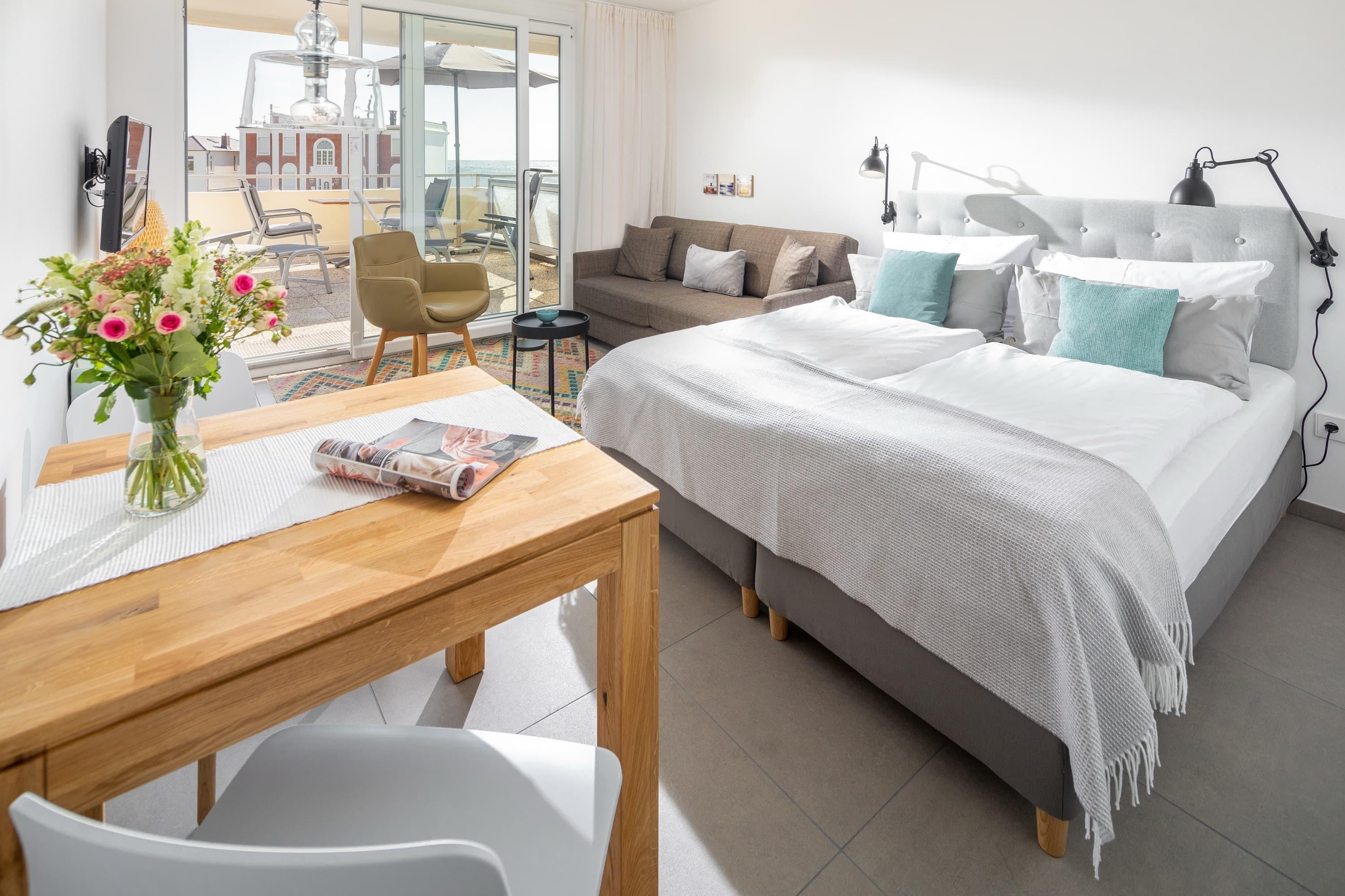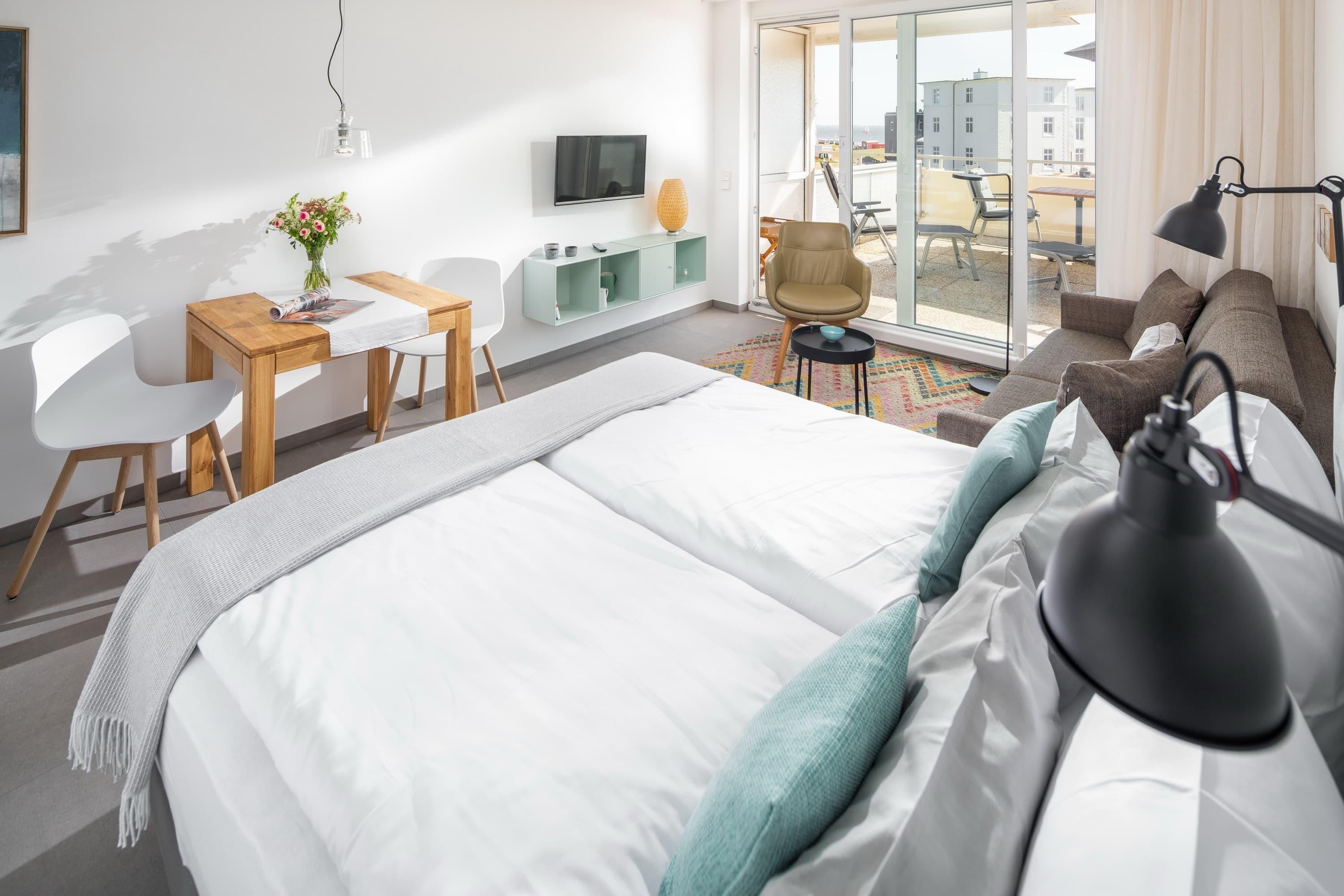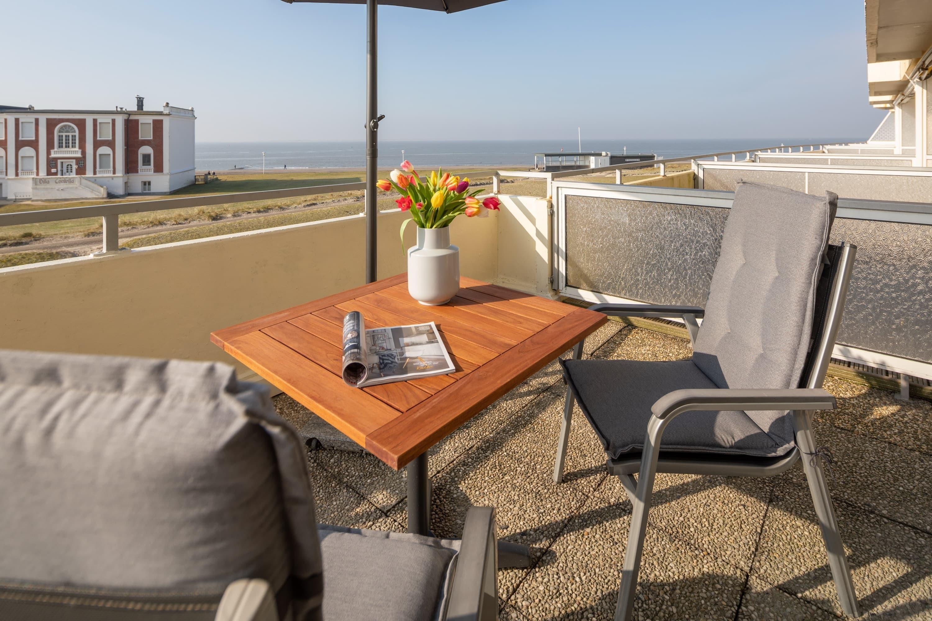 Die Lage ist ruhig aber dennoch zentral zur Innenstadt mit Badehaus, Restaurants und Einkaufsmöglichkeiten. Auf 27qm steht Ihnen neben dem bequemen Doppelbett (1,60m) eine moderne Pantryküche (durch eine Schiebetür abzutrennen), Esstisch, Sofa und TV und ein separates Badezimmer mit bodengleicher Dusche zur Verfügung. Von der geräumigen Terrasse (18qm) haben Sie einen wunderschönen Blick über den Weststrand und die Nordsee bis hin nach Juist. Dort sitzt man windgeschützt und der vordere Teil ist überdacht.