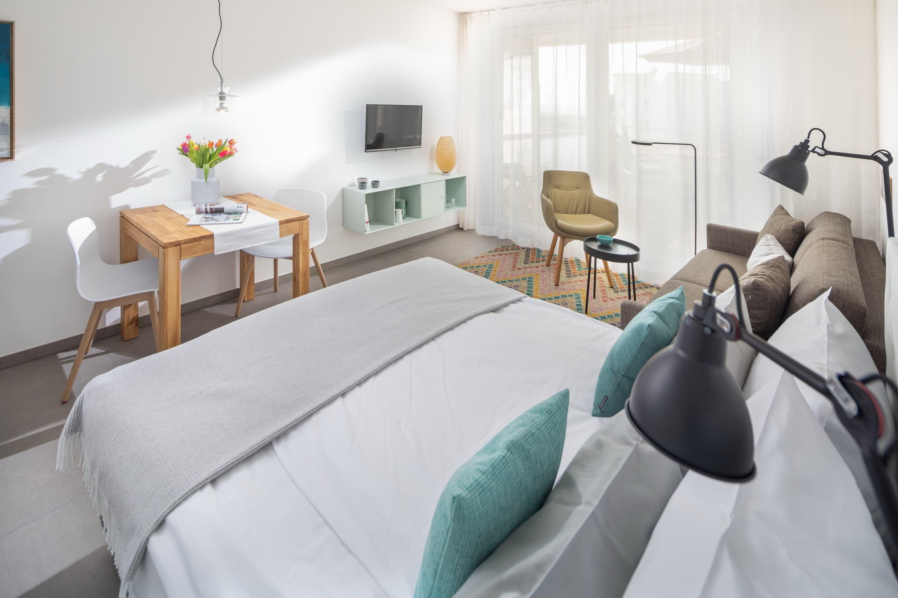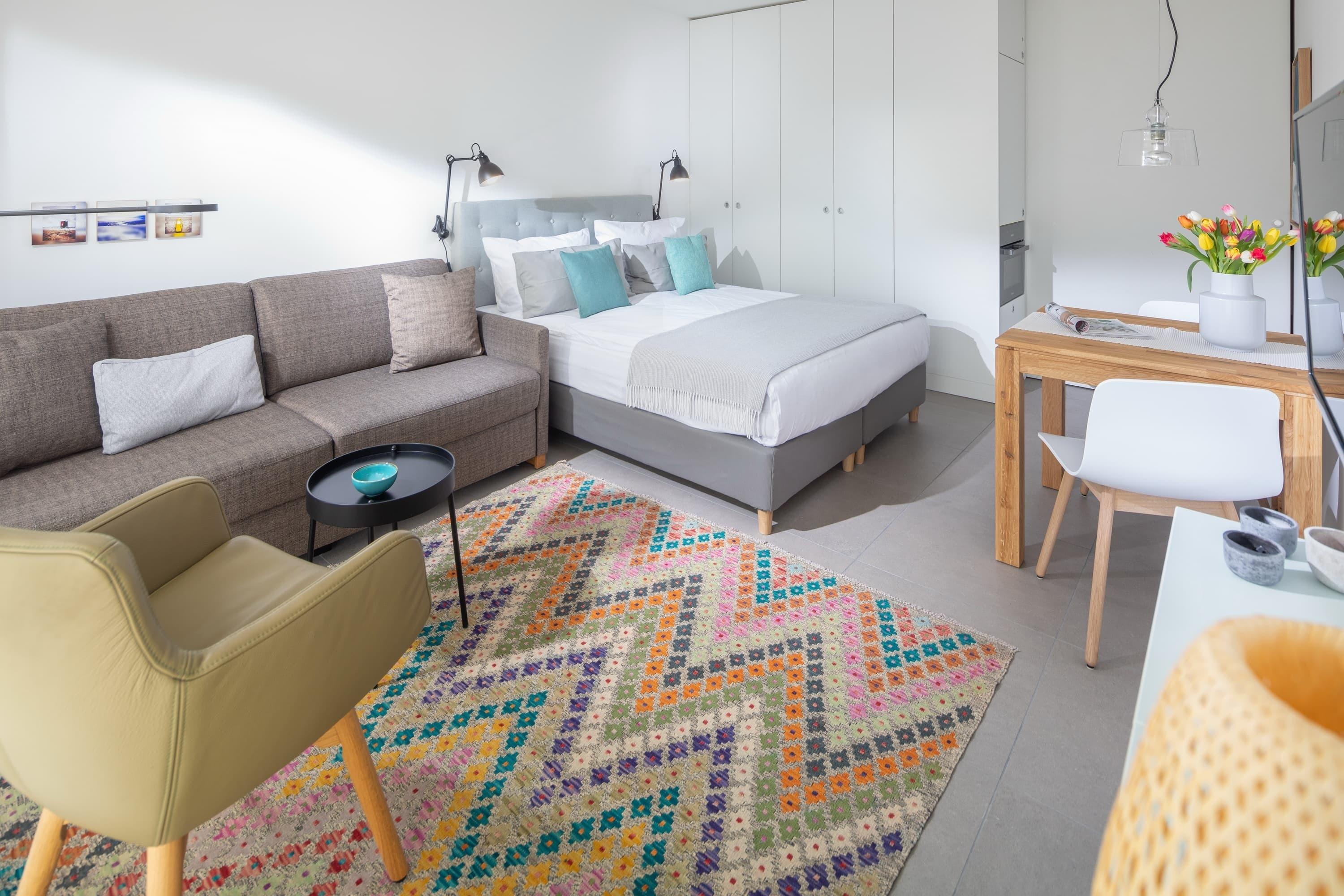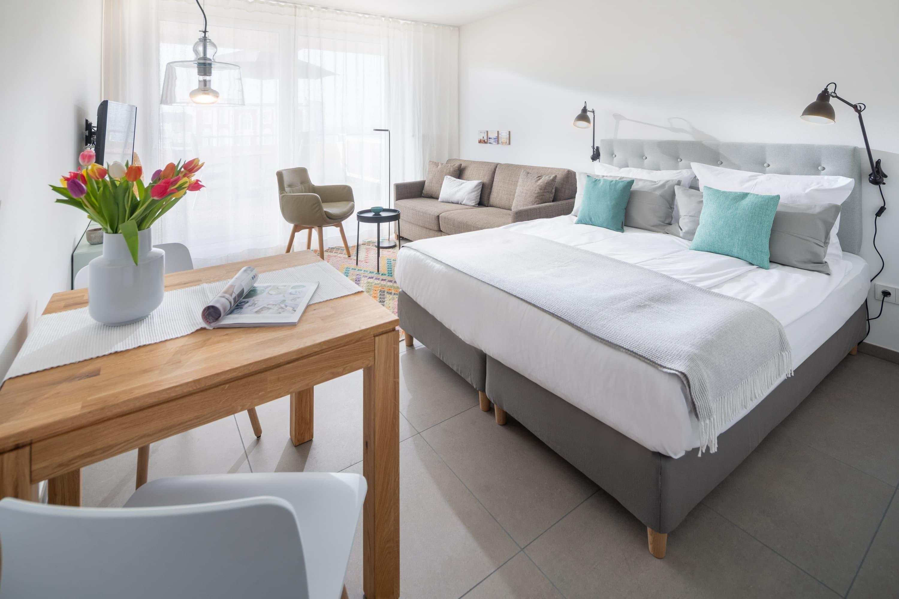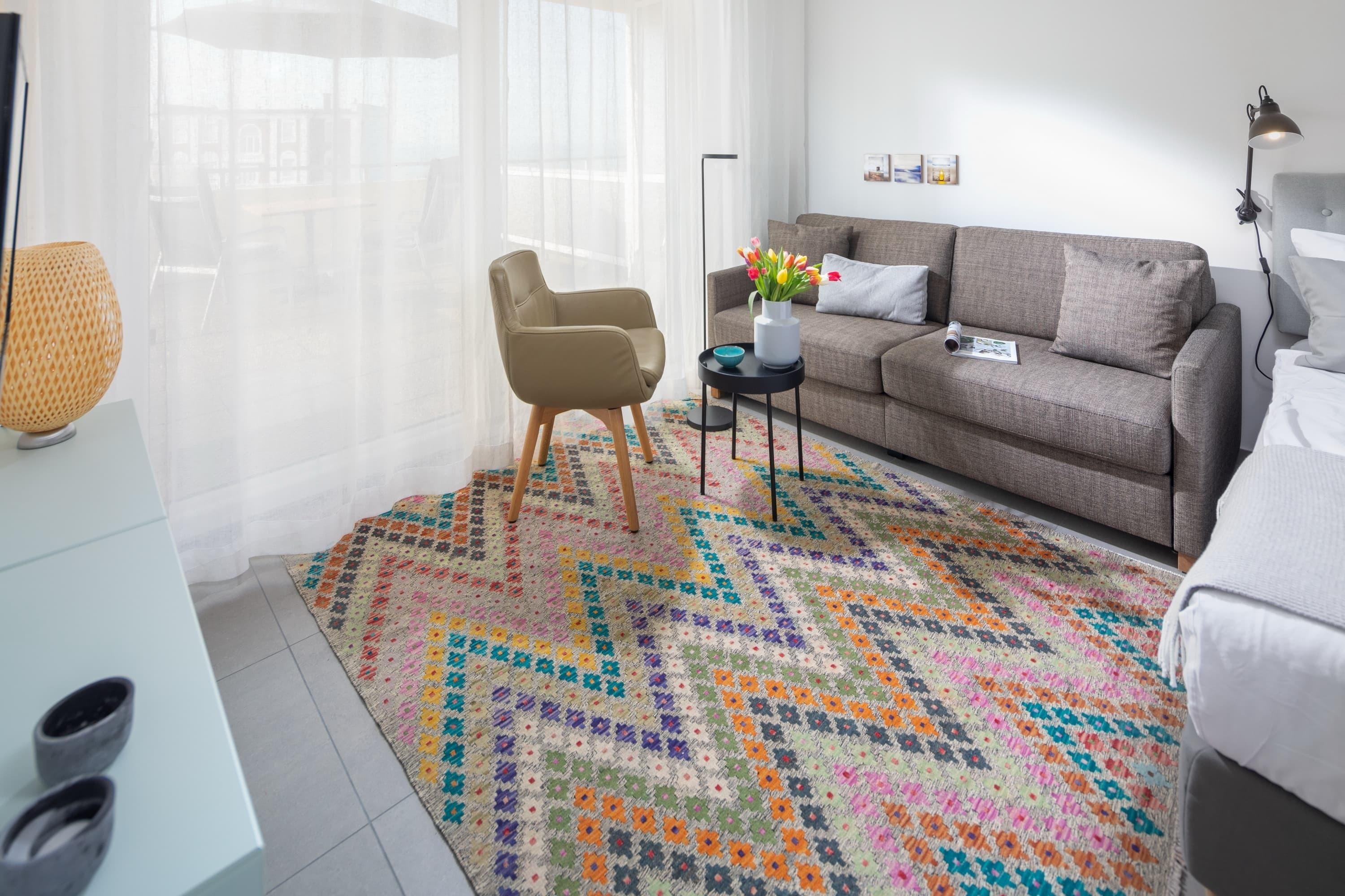 Die Lage ist ruhig aber dennoch zentral zur Innenstadt mit Badehaus, Restaurants und Einkaufsmöglichkeiten. Auf 27qm steht Ihnen neben dem bequemen Doppelbett (1,60m) eine moderne Pantryküche (durch eine Schiebetür abzutrennen), Esstisch, Sofa und TV und ein separates Badezimmer mit bodengleicher Dusche zur Verfügung. Von der geräumigen Terrasse (18qm) haben Sie einen wunderschönen Blick über den Weststrand und die Nordsee bis hin nach Juist. Dort sitzt man windgeschützt und der vordere Teil ist überdacht.