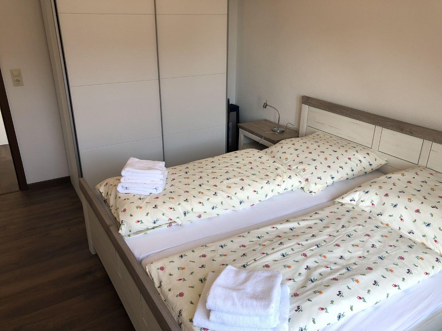 Beide Schlafzimmer verfügen über 1,80 m Doppelbetten. Im Wohnzimmer befindet sich ein ausziehbares Schlafsofa (Liegefläche ca. 1,40×2,00m). Die Ferienwohnung ist demnach für bis zu sechs Personen ausgelegt.