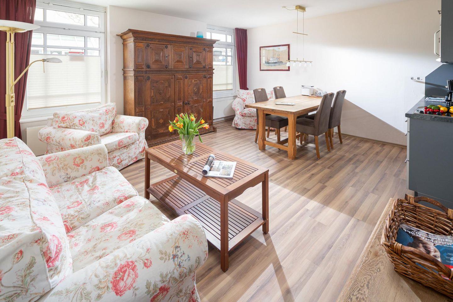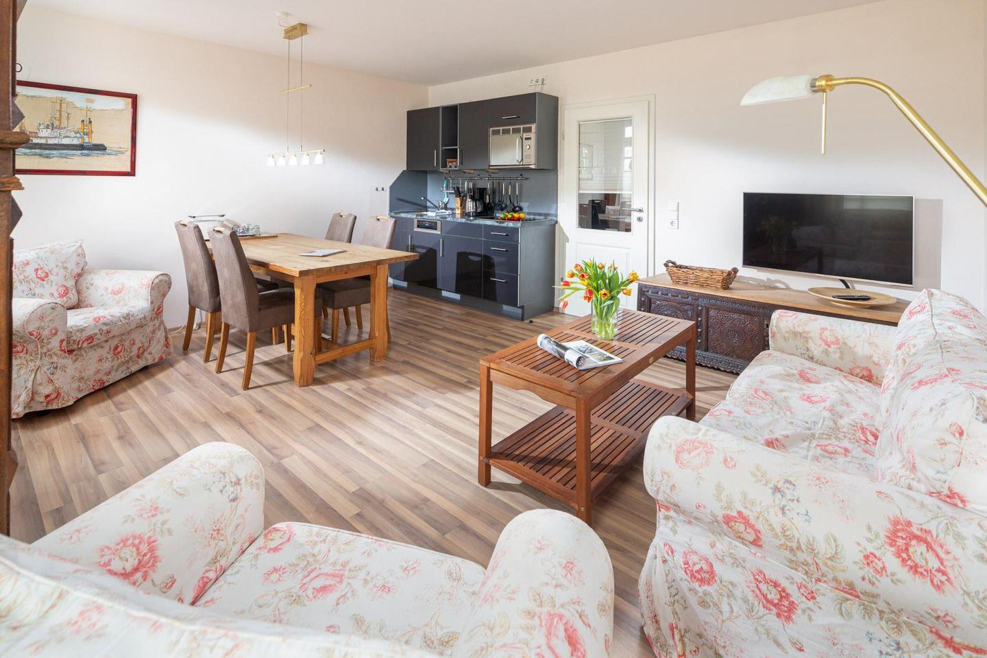 Bei der Einrichtung der Wohnung wurde auf ein passendes Design zum Wohnungsnamen "Fischerhaus" geachtet. Das Wohnzimmer integriert eine moderne Küchenzeile (hierzu gehören eine Spülmaschine, ein Ceranfeld, ein Kühlschrank mit Gefrierfach sowie eine Mikrowelle). Es wurde weiter mit einem Sofa und zwei Sesseln sowie einem Esstisch ausgestattet. Im "Ammerländer Schrank" befindet sich eine Auswahl von Gesellschaftsspielen. Die beiden Schlafzimmer sind zweckmäßig eingerichtet und verfügen jeweils über einen geräumigen Schrank. Im kleineren Schlafzimmer befindet sich ein praktischer Garderobenspiegel. Die Fenster der Schlafzimmer sind mit Verdunklungsgardinen versehen. Bad und WC wurden bewusst voneinander getrennt. Im Badezimmer wurde an einen Kosmetikspiegel gedacht. Zudem verfügt die Wohnung über einen geschützten Freisitz (im Stil einer Terrasse), ausgestattet mit einer elektrischen Markise. Fahrräder können in der Garage abgestellt werden. Waschmaschine und Wäschetrockner befinden sich im Haus und stehen (für die gemeinschaftliche Nutzung gegen Gebühr) zur Verfügung. Hunde sind in dieser Wohnung nicht erlaubt.