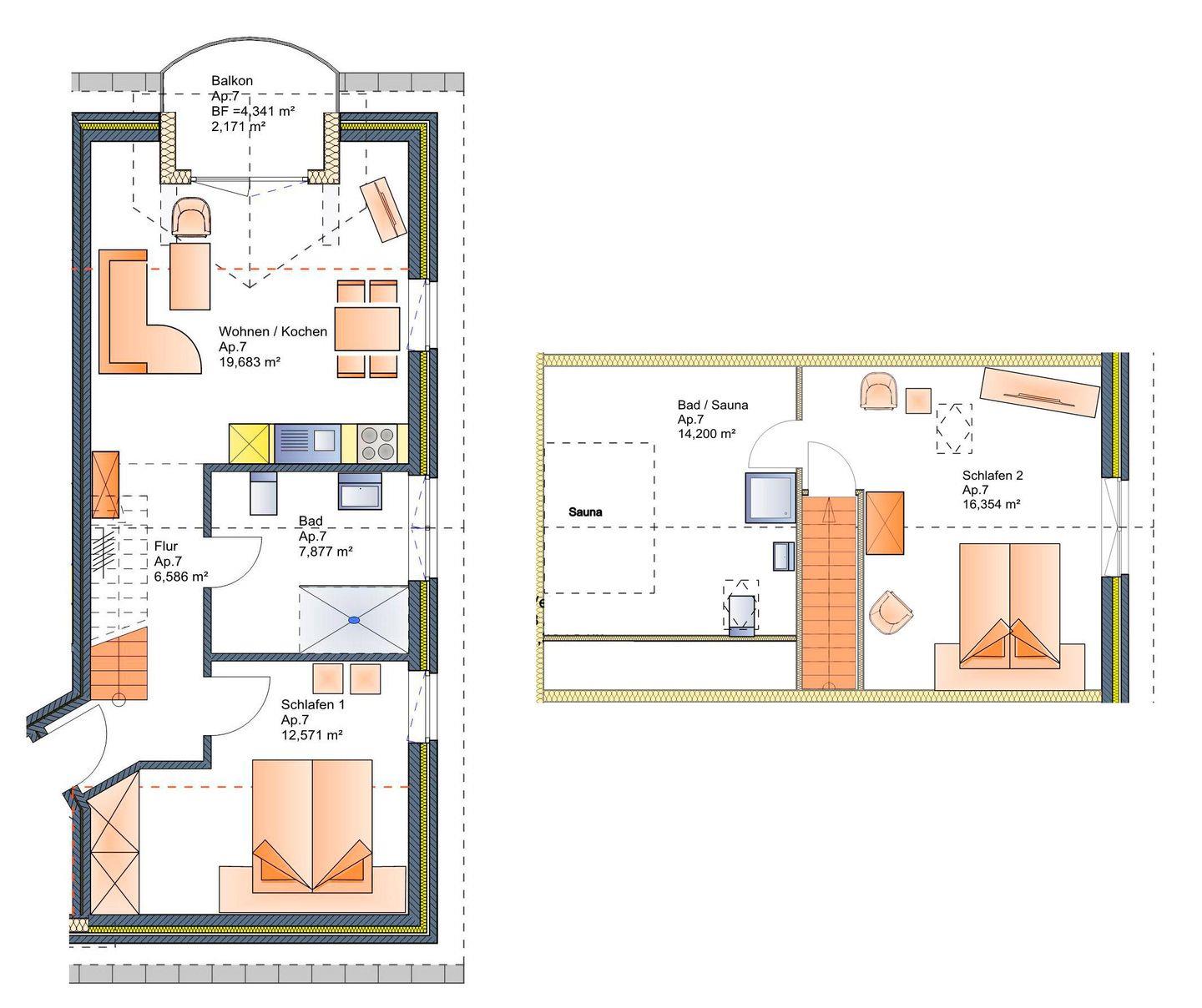 Die Wohnung verfügt über 2 Schlafzimmer, die jeweils mit einem Doppelbett ausgestattet sind. Dazu gibt es auch zwei Badezimmer. Das Wohnzimmer wurde mit einer offenen Küche und einem Essbereich eingerichtet. Zusätzlich hat die Wohnung einen kleinen Balkon. Ein Highlight der Wohnung ist die kleine Sauna (befindet sich hinter einem der Schlafzimmer).