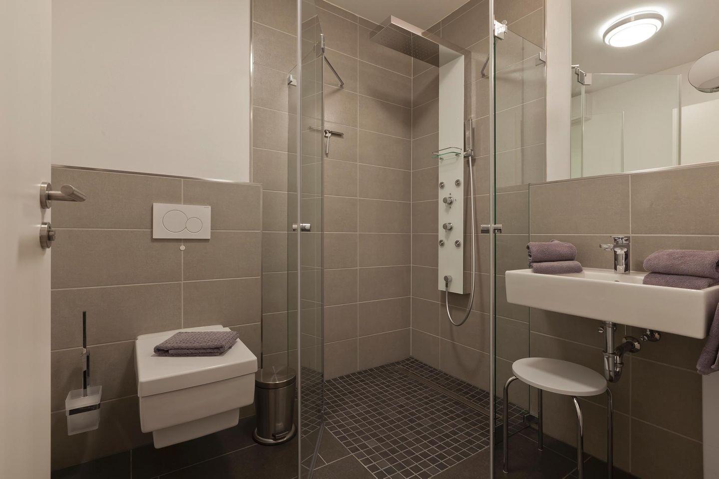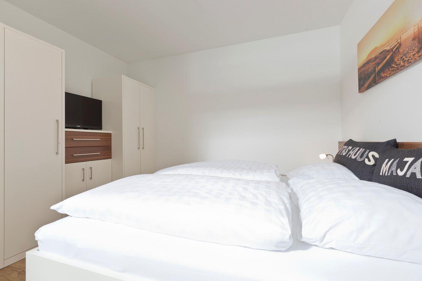 Die Wohnung befindet sich im Erdgeschoss und bietet eine geschützte Terrasse. Mit zwei Schlafzimmern - eines mit einem Doppelbett und das andere mit zwei Einzelbetten - bietet die Wohnung genügend Platz für bis zu vier Personen. Das Wohnzimmer ist mit einer Küchenzeile und einem Esstisch ausgestattet und verfügt über ein Schlafsofa, das bei Bedarf als zusätzlicher Schlafplatz genutzt werden kann. Das Badezimmer ist mit einer "Regendusche" und WC ausgestattet. Eine automatische Be- und Entlüftung sorgt für ein angenehmes Raumklima und die Schlafräume lassen sich durch Vorhänge bzw. Plissees verdunkeln. Für evtl. Wertsachen steht in der Wohnung ein Safe zur Verfügung. Im Haus befindet sich ein Wäscheraum mit Münzwaschmaschine und -trockner. Hier darf auch der vierbeinige Freund mitkommen, denn die Ferienwohnung heißt auch Hunde herzlich willkommen. Erlaubt ist maximal 1 Hund (Höhe maximal kniehoch). Die Hundewiese befindet sich in der Nähe des Fährhafens (kein Leinenzwang).